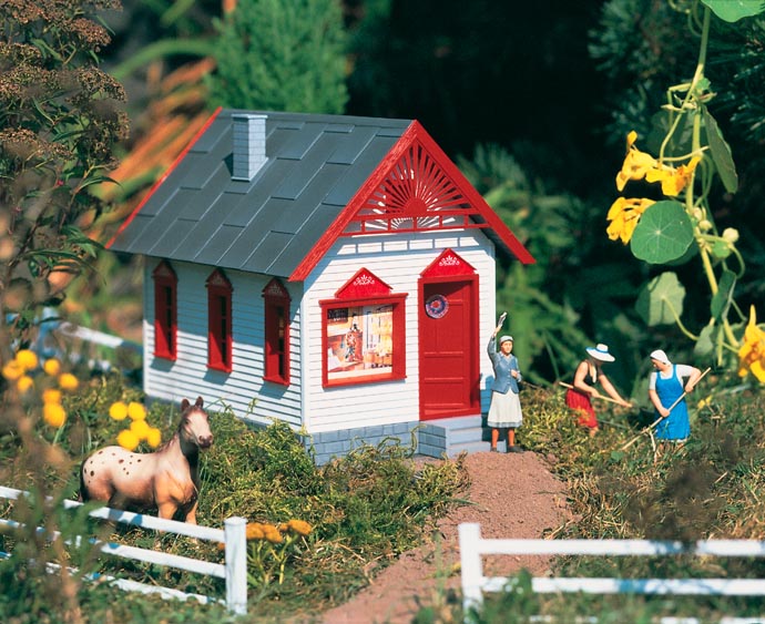 Maß: 183 x 245 x 235 mm. Der kleine Hnadarbeitsladen liegt idyllisch im Vorort einer Kleinstadt. Petra hat ihn mit einem schönen Zaun umgeben und ihre Freundinnen helfen ihr bei der Gartenarbeit. Aufgrund des grpßen Grundstücks kann sie auch Pferde halten. Ab und zu kommen Besucher vorbei, die ihre selbstgemachten Stickereien erstehen. Die Tür des gebäudes läßt sich öffnen und schließen(der Zaun ist in diesem Bausatz nicht enthalten).