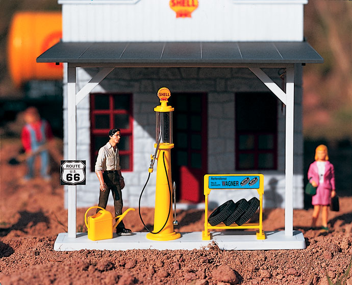 Als Ergänzung zur Tankstelle # 62241 kann diese antike Zapfsäule eingesetzt werden. Sie beeindruckt mit ihrem Pumpglas, auf das sogar die Füllstand-Skala gedruckt ist. Wasserkanne, Reifenständer und Ersatzreifen liegen dem Fertigmodell bei.
