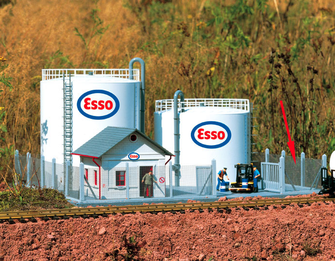 Der Industriezaun ist so gestaltet, daß er zur Einzäunung verschiedenster Industriekomplexe eingesetzt werden kann. Der Zaun besteht aus Metall, welches zwischen Pfosten eingefügt wird. Ein Tor vervollständigt den Bausatz. Für die komplette Einzäunung des Tanklagers in 2 Sets #62290 notwendig.