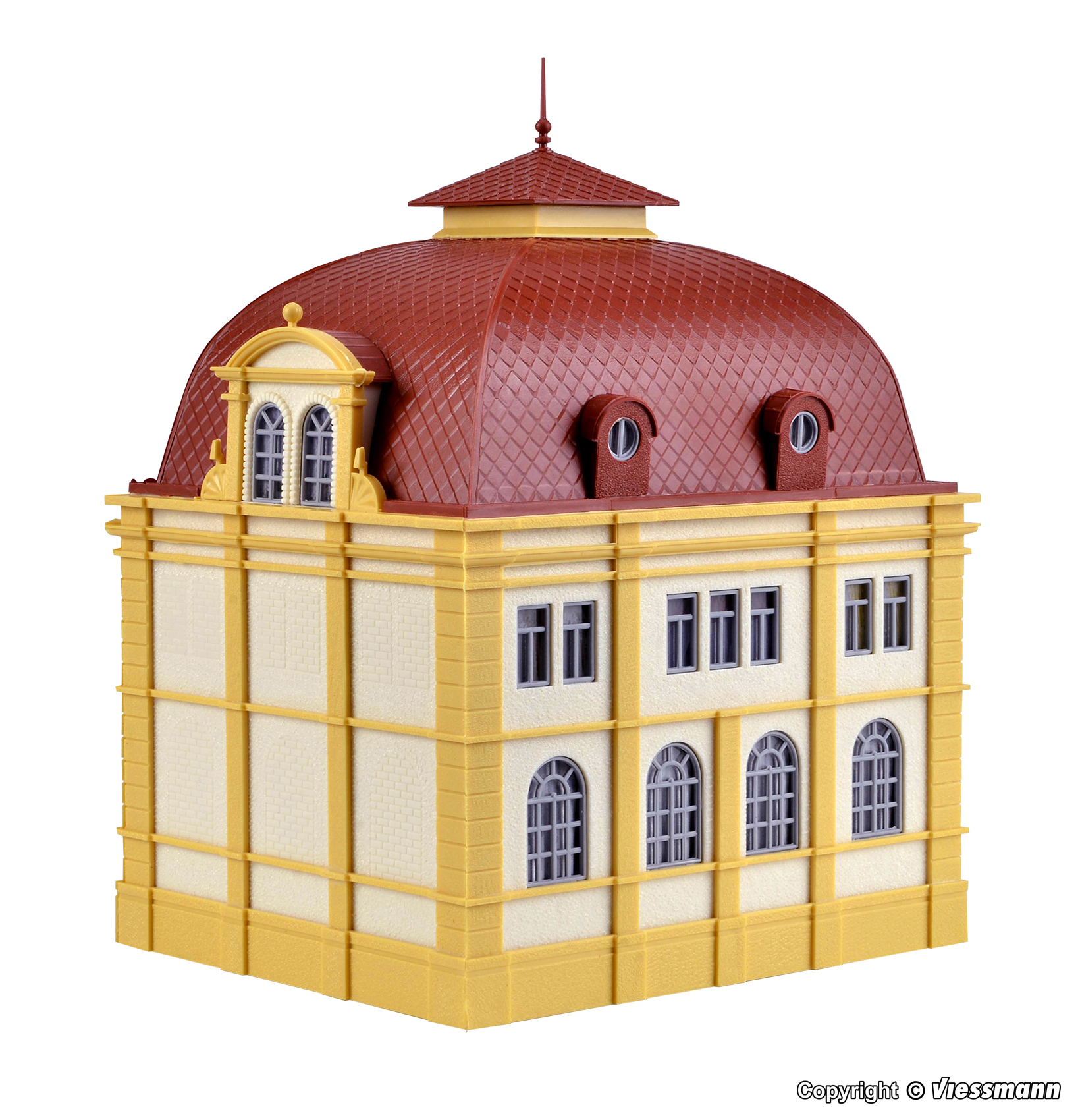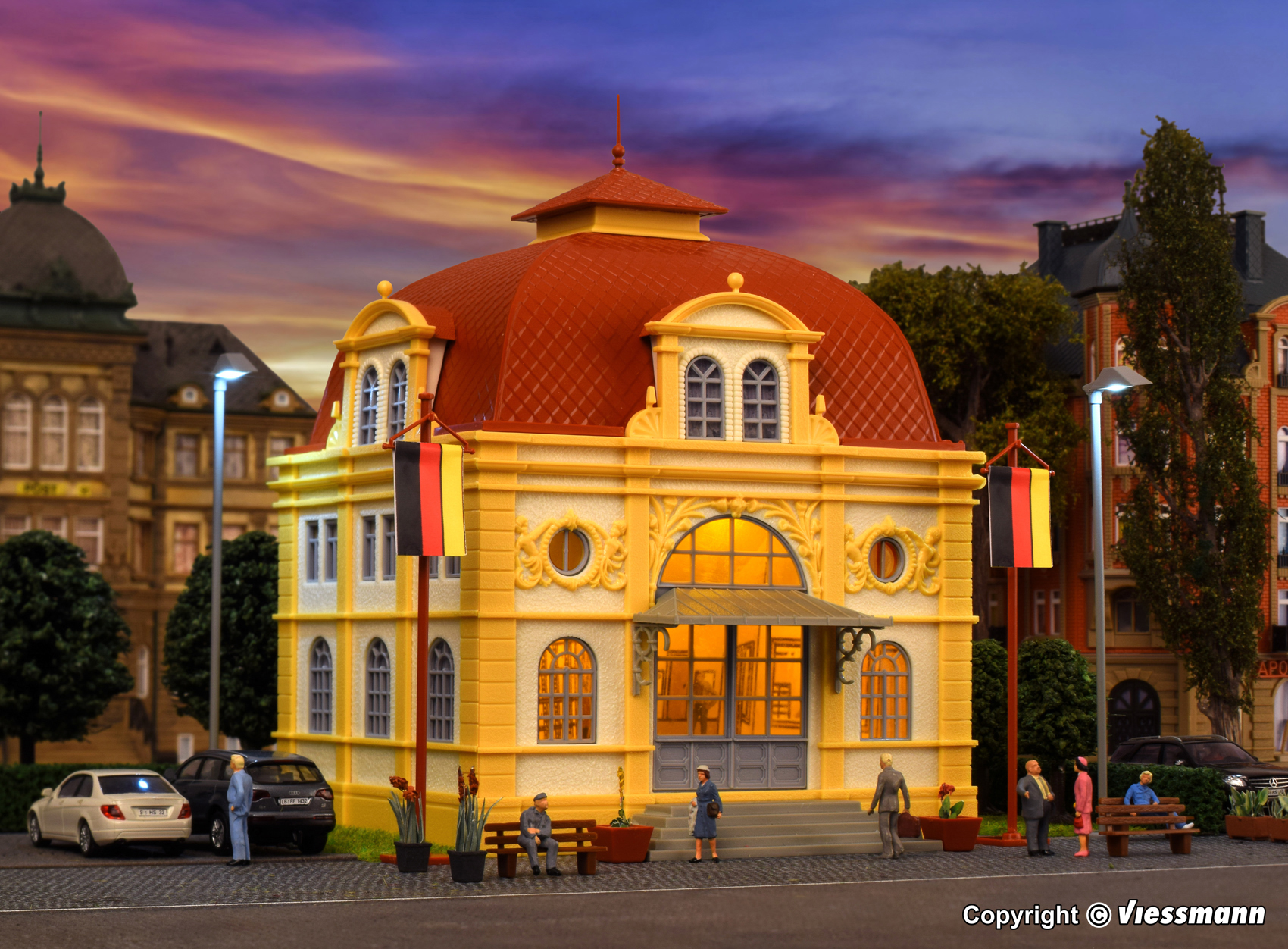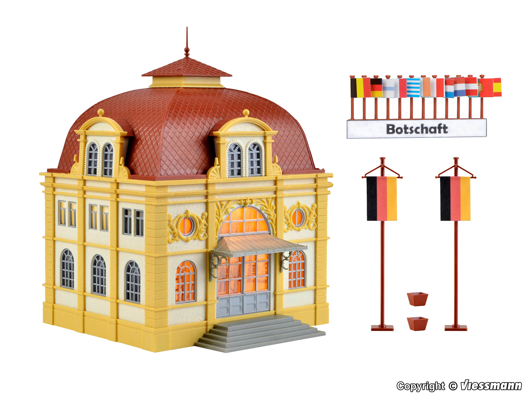 Dieses imposante Gebäude dient als Botschaftssitz. Dem Bausatz liegt die praktische und variable Etageninnenbeleuchtung von Viessmann bei. Diese bietet unbegrenzte Möglichkeiten zur individuellen Beleuchtung von Gebäuden mit großen Fensterfronten. L 12,6 x B 12,5 x H 16,7 cm.