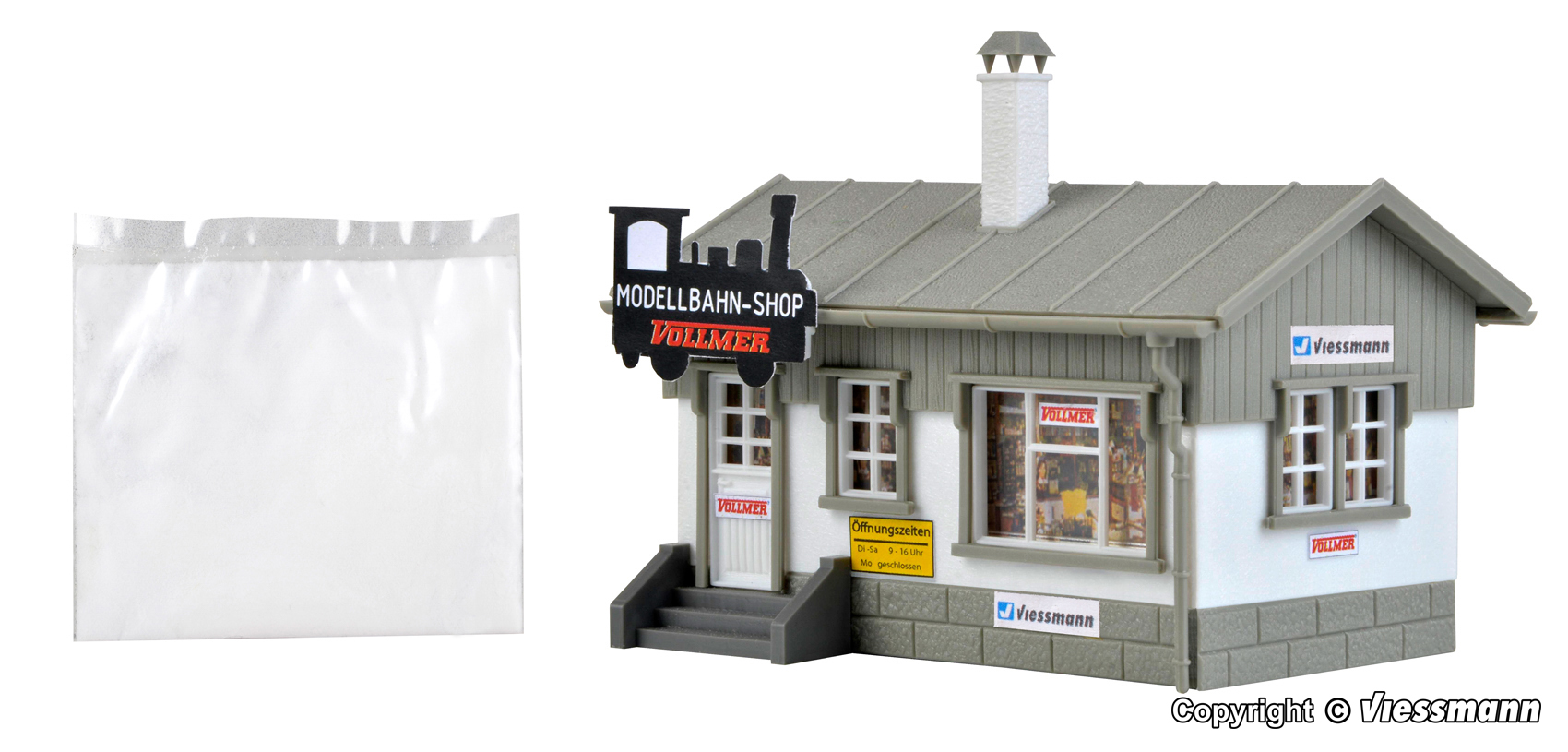 Dieser niedliche kleine Modellbahnshop bietet alles, was das Bastler-Herz begehrt. Die interessierten Käufer kommen in den Laden, um Neuheiten zu bestaunen, sich Gestaltungstipps zu holen und sich über die neuesten Trends zu informieren. Dem Bausatz liegt Kunstschnee bei, so dass man sich die Winter-Weihnachtsstimmung auf die Anlage holen kann. Maße: L 8,8 x B 6,8 x H 8,8 cm.