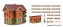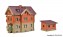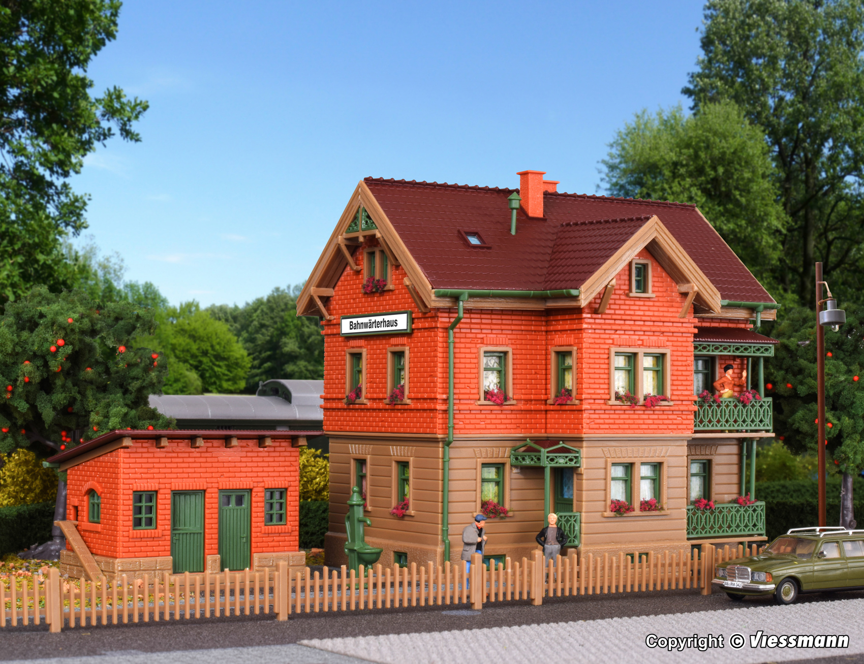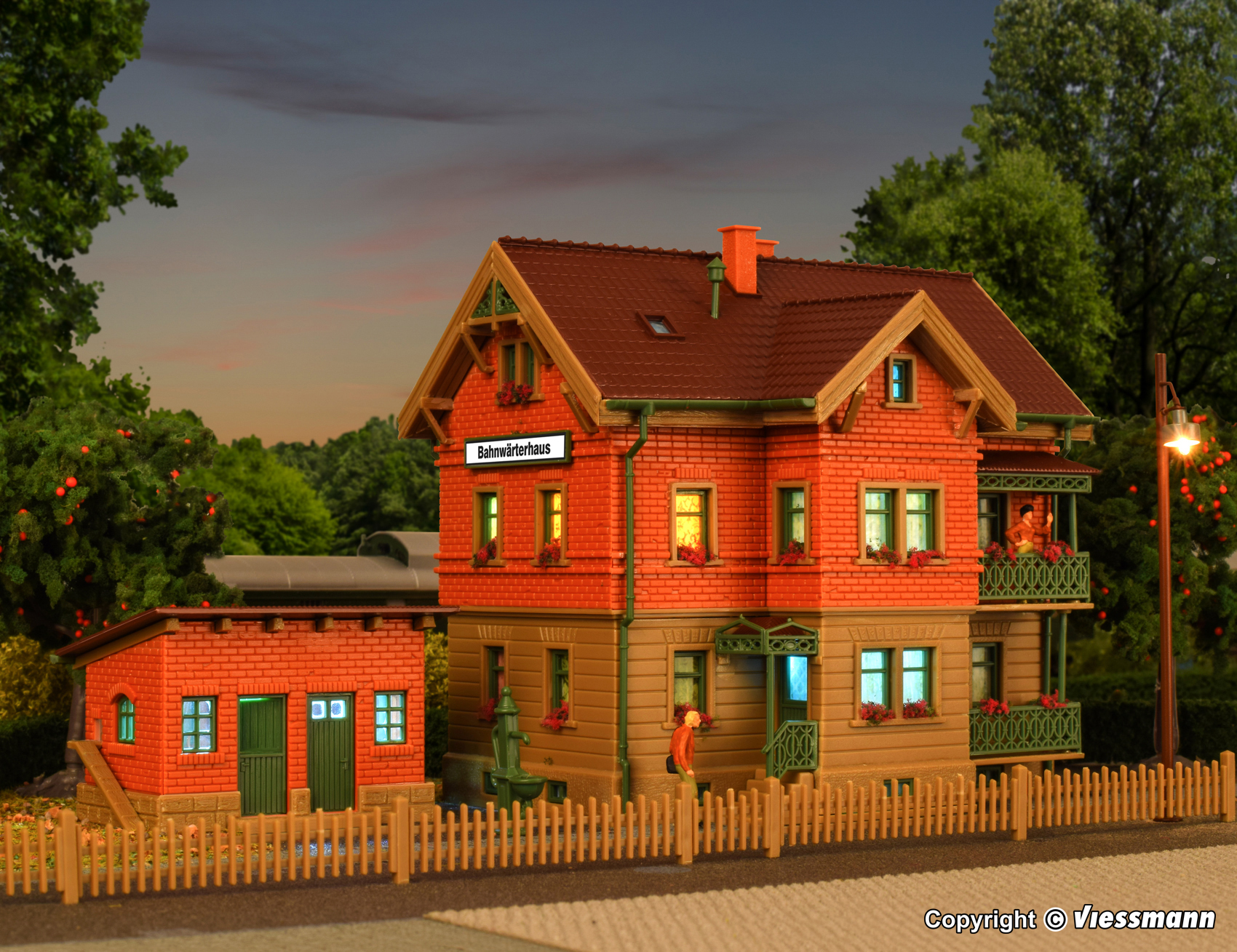 Hier wohnt der Bahnwärter mit seiner Familie. Das Original dieses nach der Wende zum 20. Jahrhundert erbauten Hauses steht an der Bahnlinie Esslingen-Plochingen und dient heute als städtische Kunstgalerie. Maße: Haus L 13,2 x B 9,5 x H 11,5 cm, Stall L 6,5 x B 5 x H 4 cm.