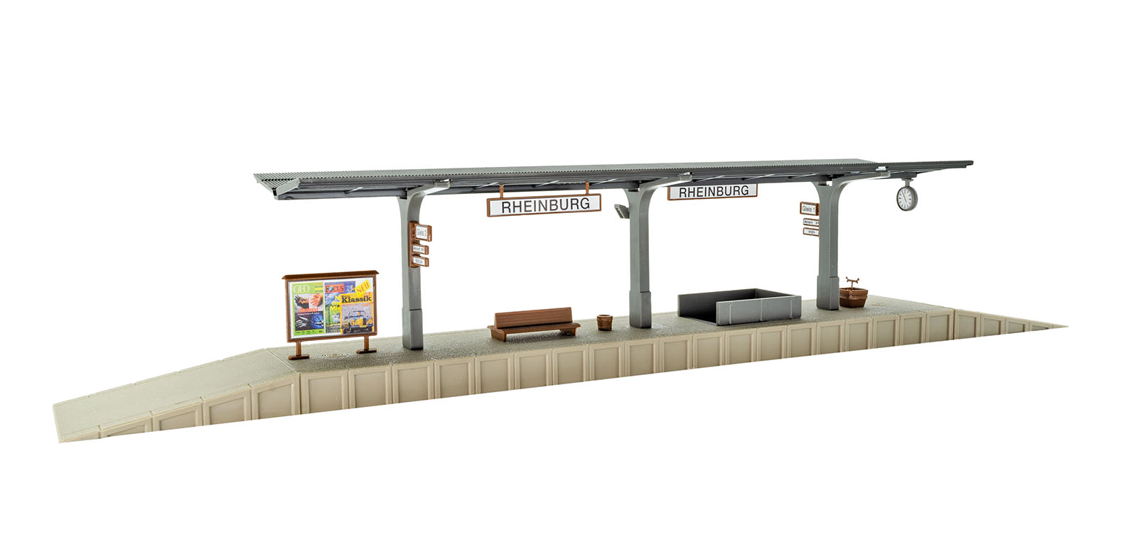 Bahnsteige sind ein unverzichtbares Zubehörelement im Bahn- bzw. Bahnhofsbereich. Das Modell Rheinburg sowie die lange Variante Seeburg Art. 43536 passen durch ihr zeitloses Design gleich in mehrere Epochen. Maße: L 37 x B 6,5/4,8 x H 6 cm.