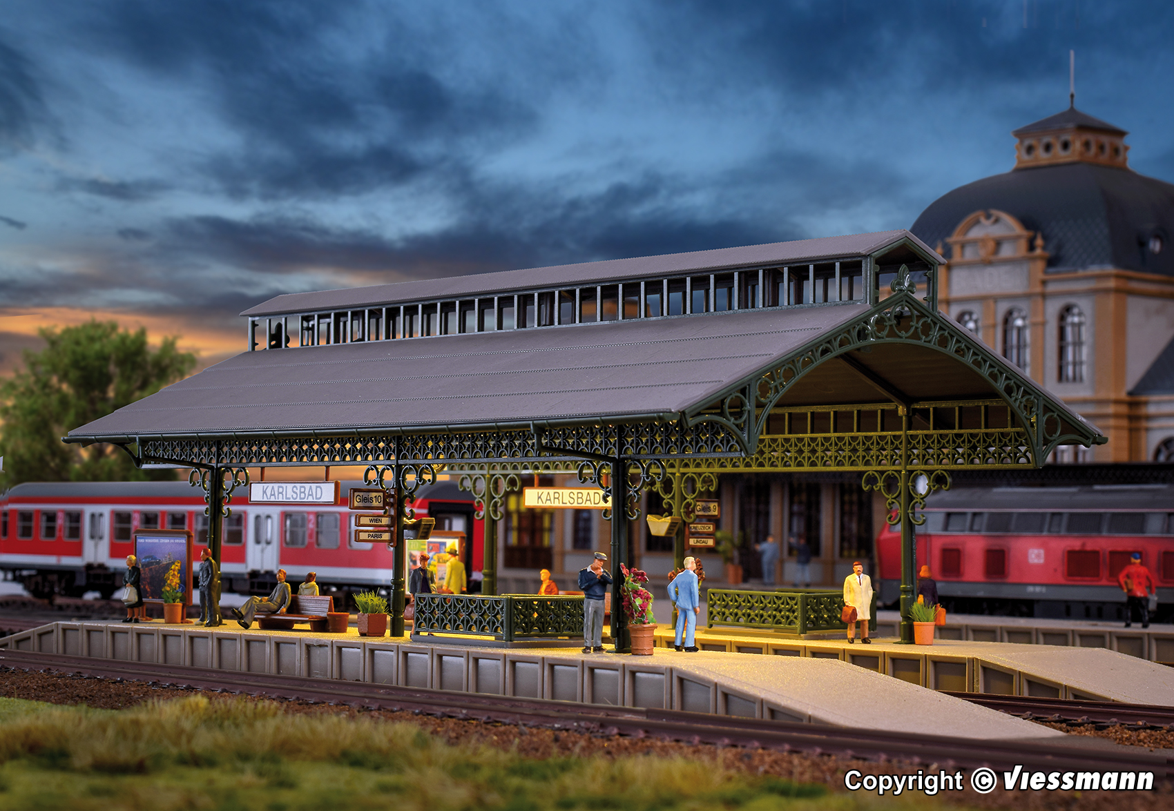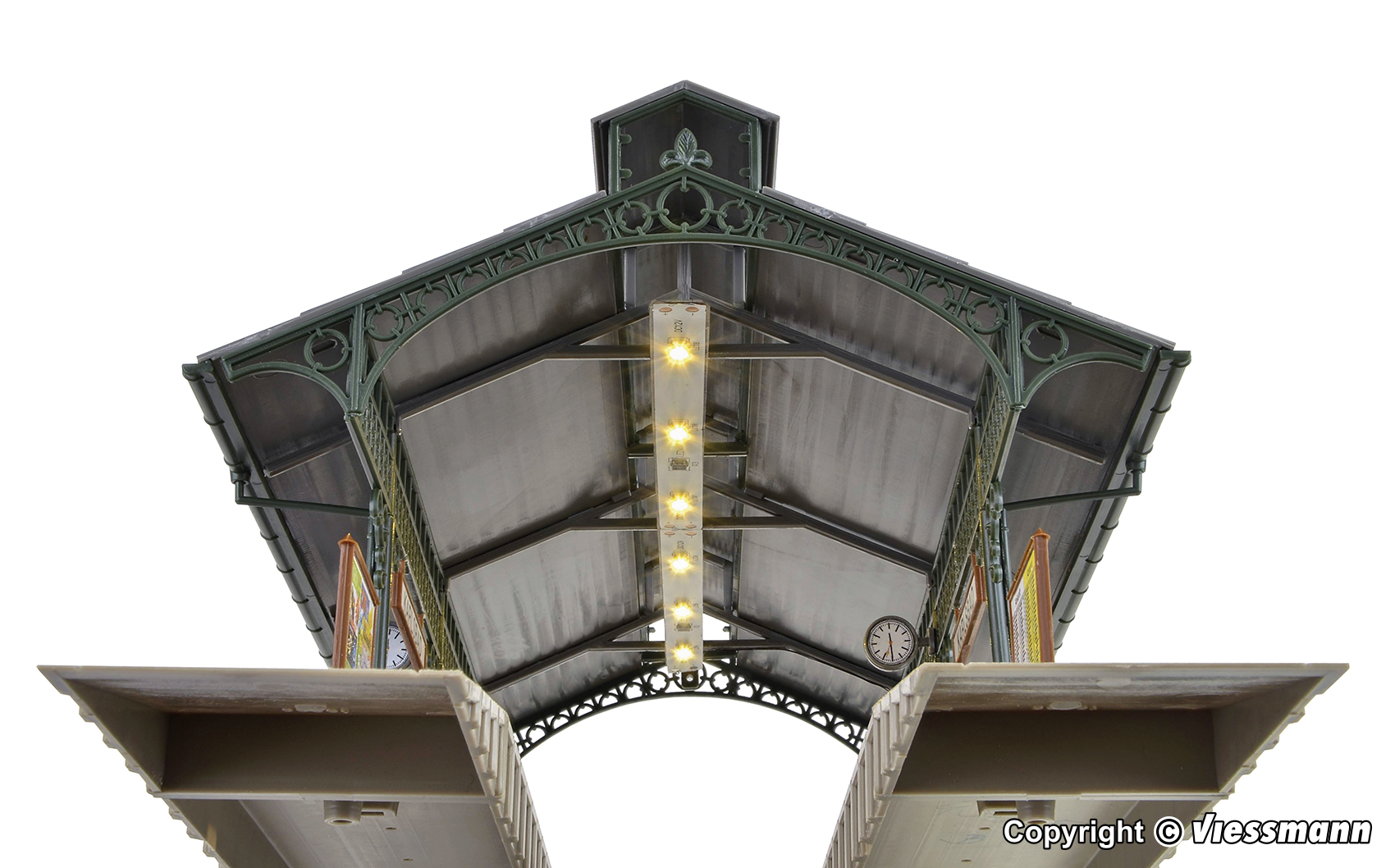 6 warmweiße LEDs unter dem Dach leuchten den Wartebereich gleichmäßig aus. Mit einem 2. Bausatz ist die Halle verlängerbar. Diese Bahnsteighalle ist für alle gängigen Gleissysteme