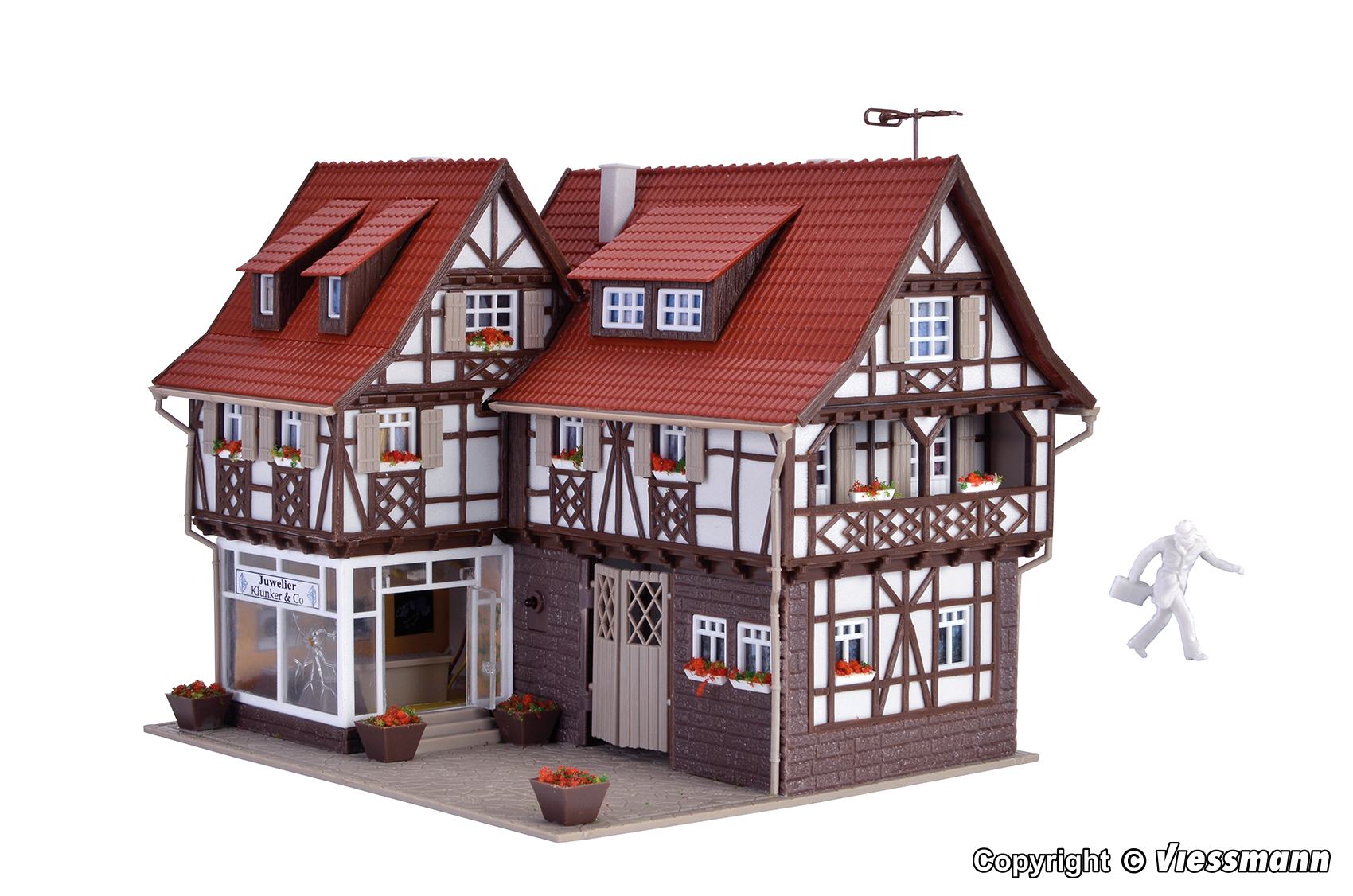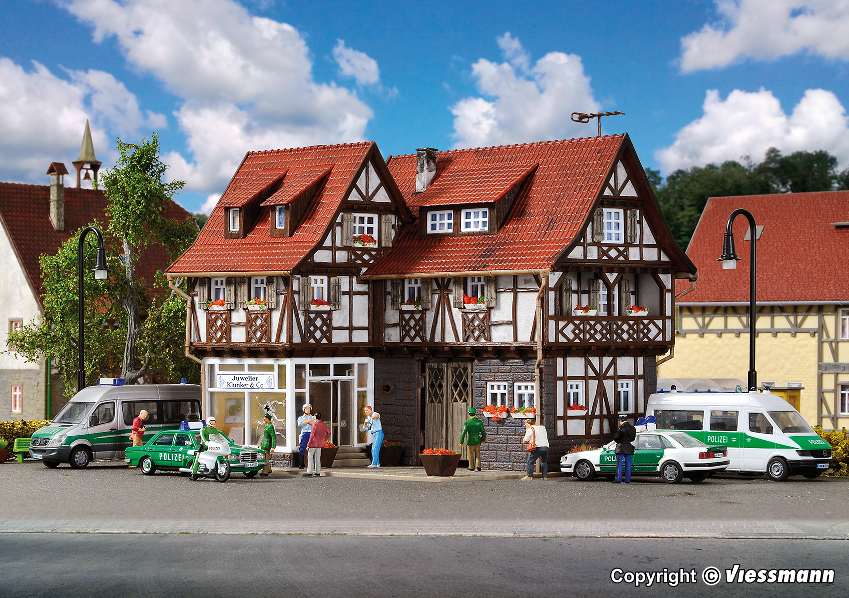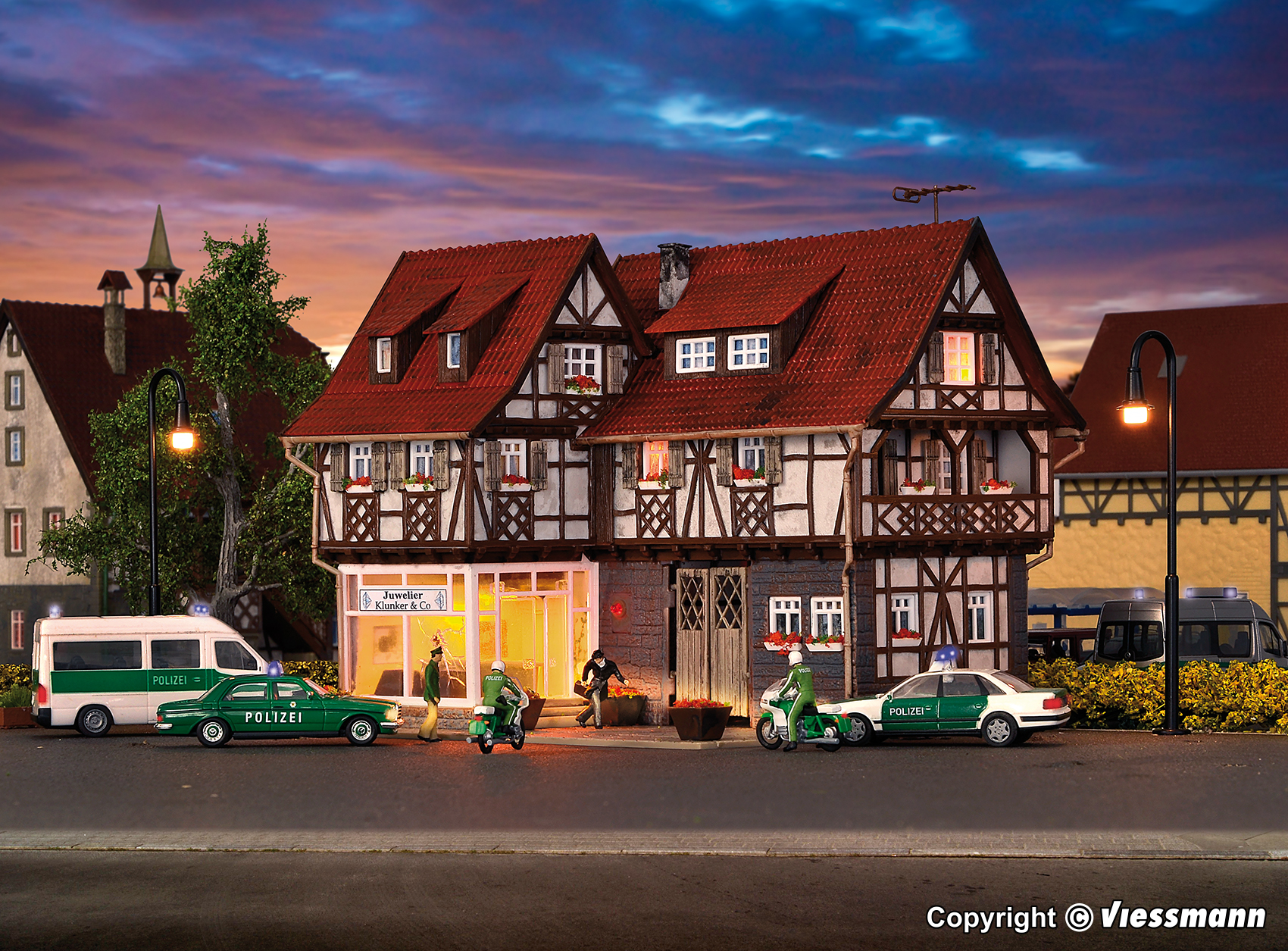 Überfall... Doch der Dieb flüchtet ohne Beute. Die Polizei wurde rechtzeitig informiert und die wertvollen Kristalle liegen unbeschadet im Schaufenster. Ein Juweliergeschäft mit eingeschlagener Fensterscheibe, Inneneinrichtung, LED-Beleuchtung, unbemalter Einbrecherfigur und 2 original Swarovski-Kristallen. Die Figur können Sie selbst nach eigenen Wünschen bemalen. Maße: L 15 x B 12,5 x H 12 cm.