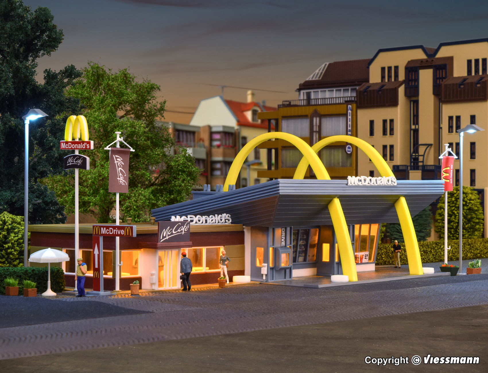 Das Modell wurde gemeinsam mit McDonald´s Deutschland entwickelt und genehmigt. Das Gebäude hat eine offene, einladende Art. Die nach hinten abgeschrägte Dachfläche und die beiden gelben Bögen, die an das Firmenlogo erinnern sollen, prägen dieses Gebäude. Durch die großen Fensterflächen fällt viel Tageslicht in den Restaurantbereich. Leckeren Kaffee und Kuchen gibt es im Anbau McCafé. Als Autofahrer erhält man seine Bestellung an den speziellen Ausgabeschaltern des McDrive. Abhängig von den örtlichen Gegebenheiten gibt es diese Art der Restaurant-Architektur in vielen Varianten. Wir bedanken uns für die freundliche Unterstützung von McDonald´s Deutschland. Mit Inneneinrichtung, 4 Sonnenschirmen, 2 Fahnen und Mast mit McDonald´s Logo. Maße: L 27 x B 15,8 x H 9,8 cm.