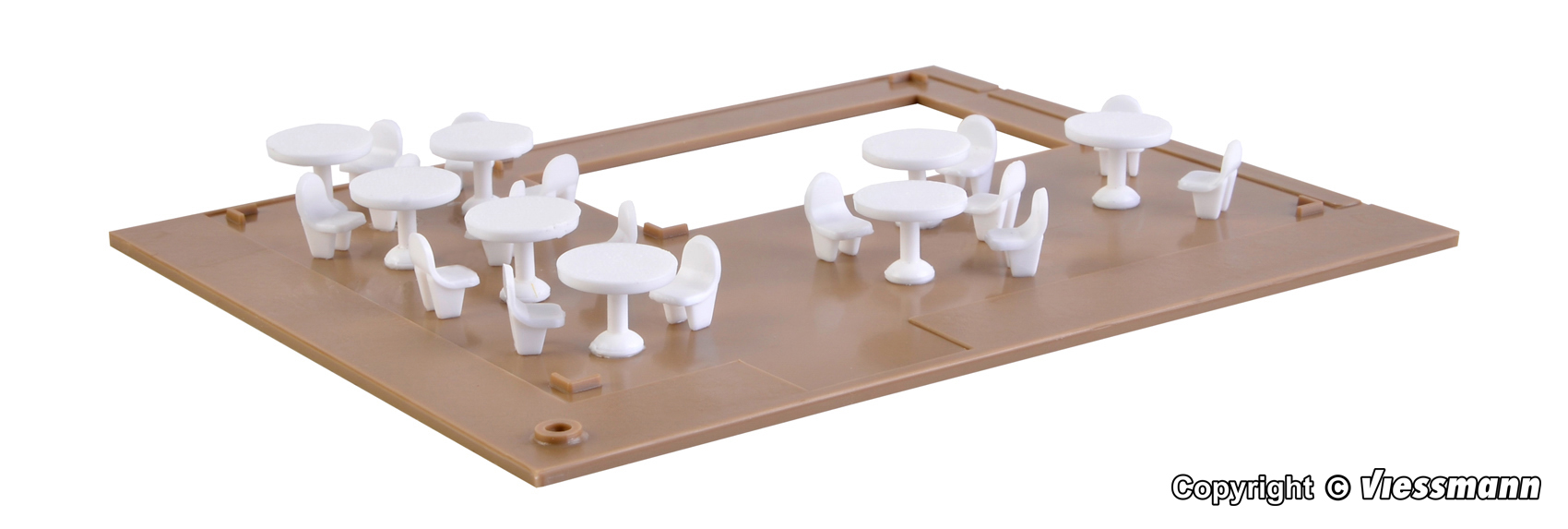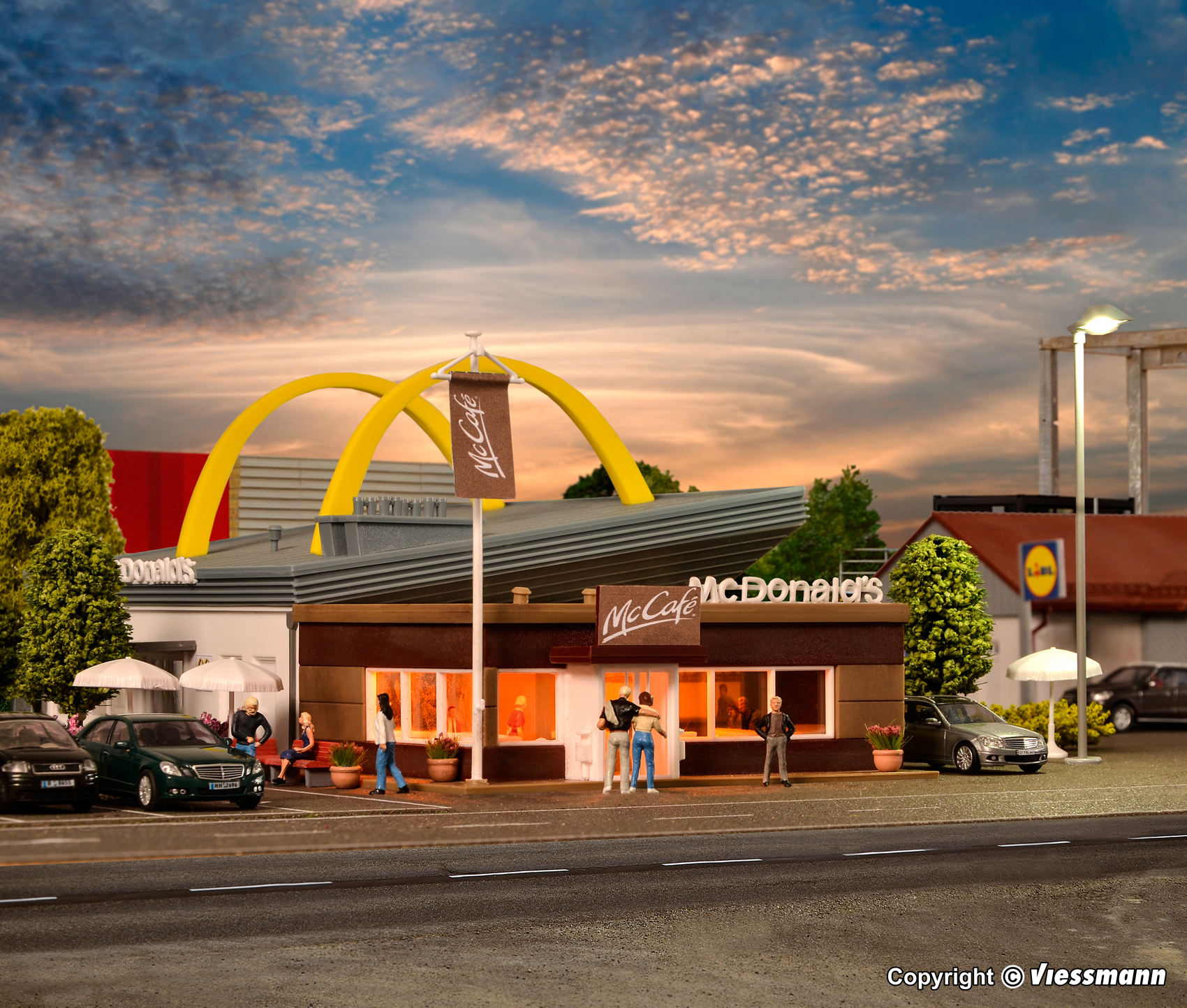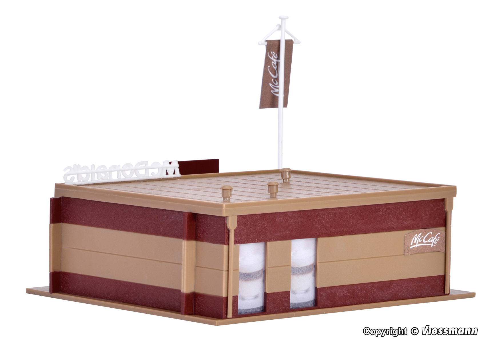 Das Modell wurde gemeinsam mit McDonald´s Deutschland entwickelt und genehmigt. Hier gibt es leckeren Kaffee und weitere Köstlichkeiten. Das McDonald´s Schnellrestaurant Art. 43634 kann mit diesem Anbau erweitert werden. Aber auch als eigenständiges Gebäude macht der Bausatz eine gute Figur. Wir bedanken uns für die freundliche Unterstützung von McDonald´s Deutschland. Mit Inneneinrichtung und 4 Sonnenschirmen. Maße: L 11,5 x B 9,5 x H 9 cm.