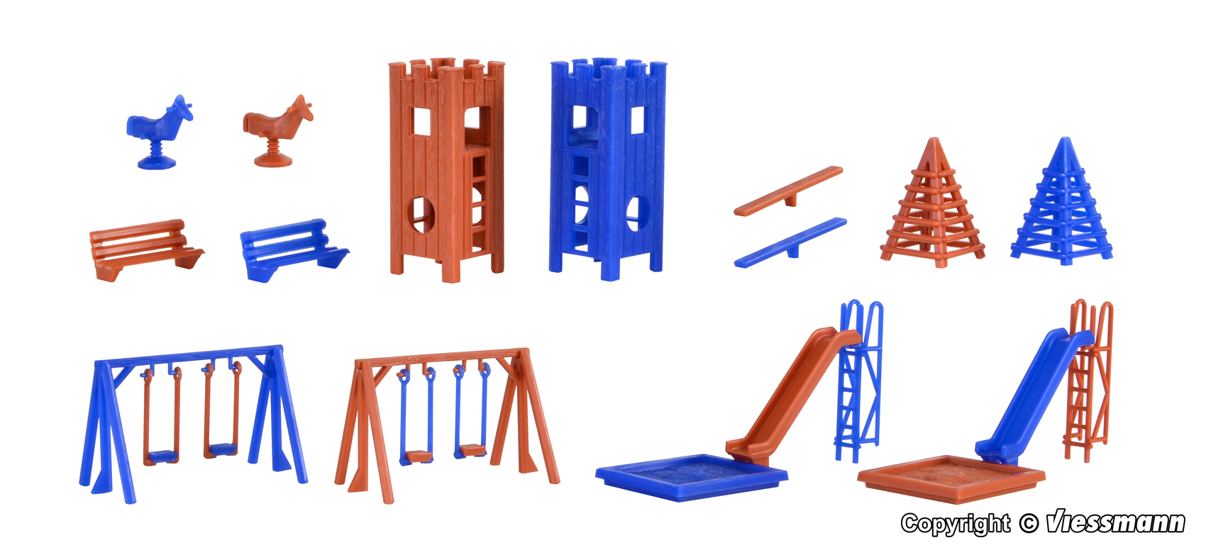 Mit Rutsche, Schaukel, Wippe und weiteren Spielgeräten.