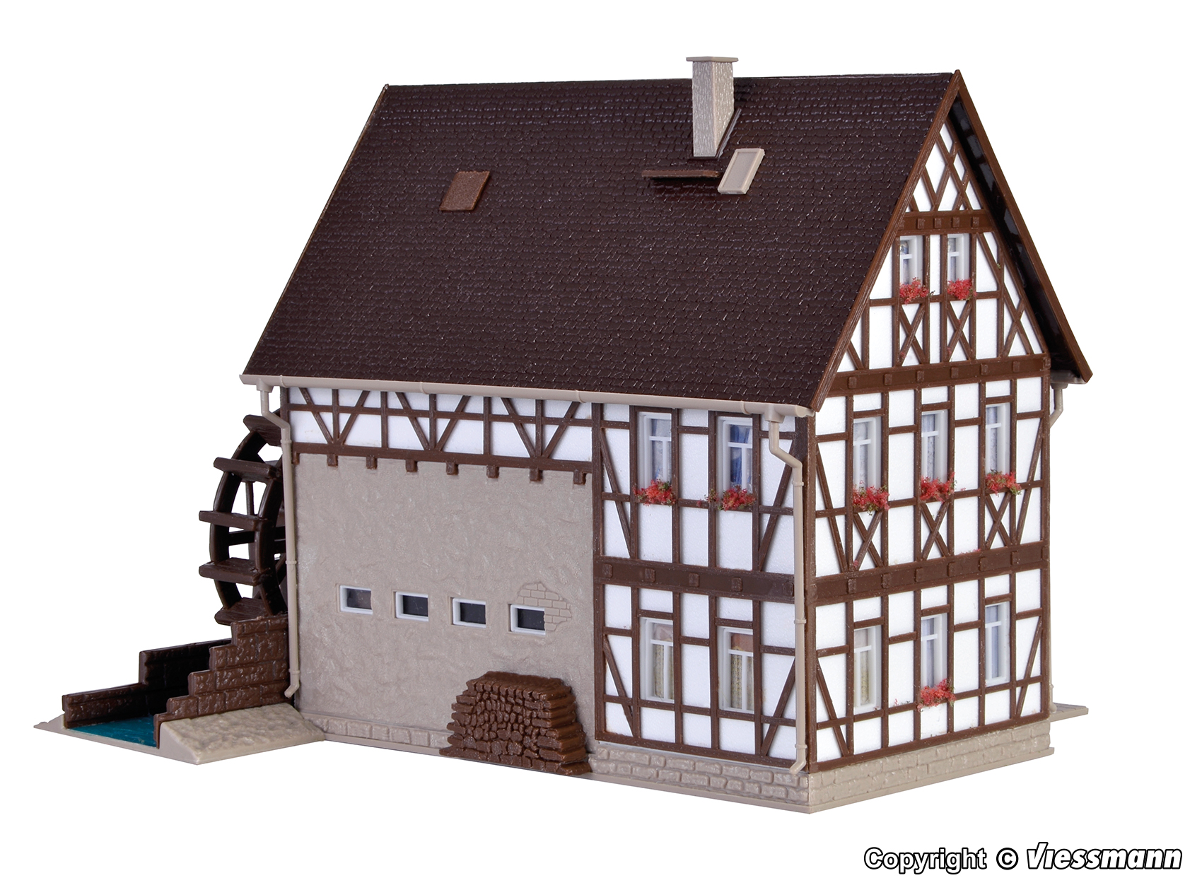 Die fachwerkverzierte Getreidemühle mit Mühlrad und Hoftor liegt an einem kleinen Flüsschen. Sie können wählen, in welcher Epoche sie dieses Thema ansiedeln. Das Mühlrad kann mit dem Motor Art. 44200 angetrieben werden (Zusatzausstattung). Maße: Haus L 16 x B 14,8 x H 12 cm, Tor L 5,8 x B 1 x H 5,5 cm.