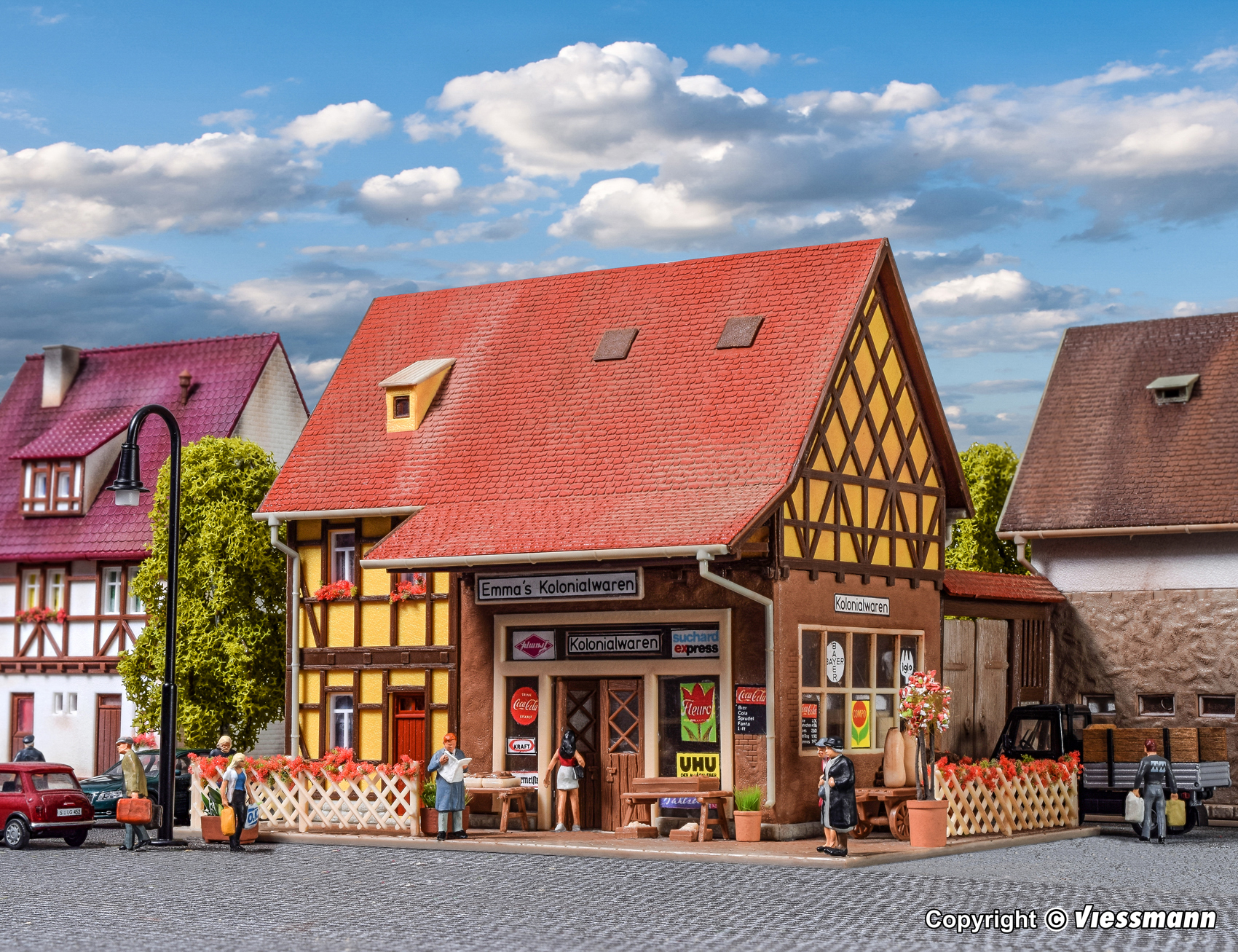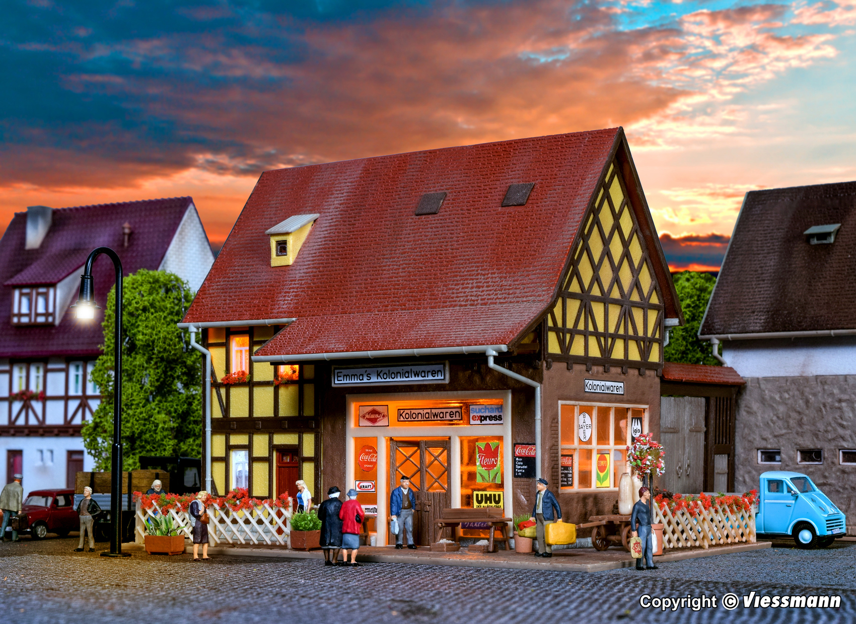 Dieser detailgetreue und wirklichkeitsnahe Tante Emma-Laden sorgt für rustikale Romantik auf der Modellbahnanlage. So richtig nach Vollmer-Art. Der Laden ist liebevoll eingerichtet und die beiliegende Beleuchtung setzt ihn passend in Szene. Zum Bausatz gehört außerdem ein Hoftor. Maße: L 16 x B 10,5 x H 12 cm, Tor L 5,8 x B 1 x H 5,5 cm.