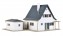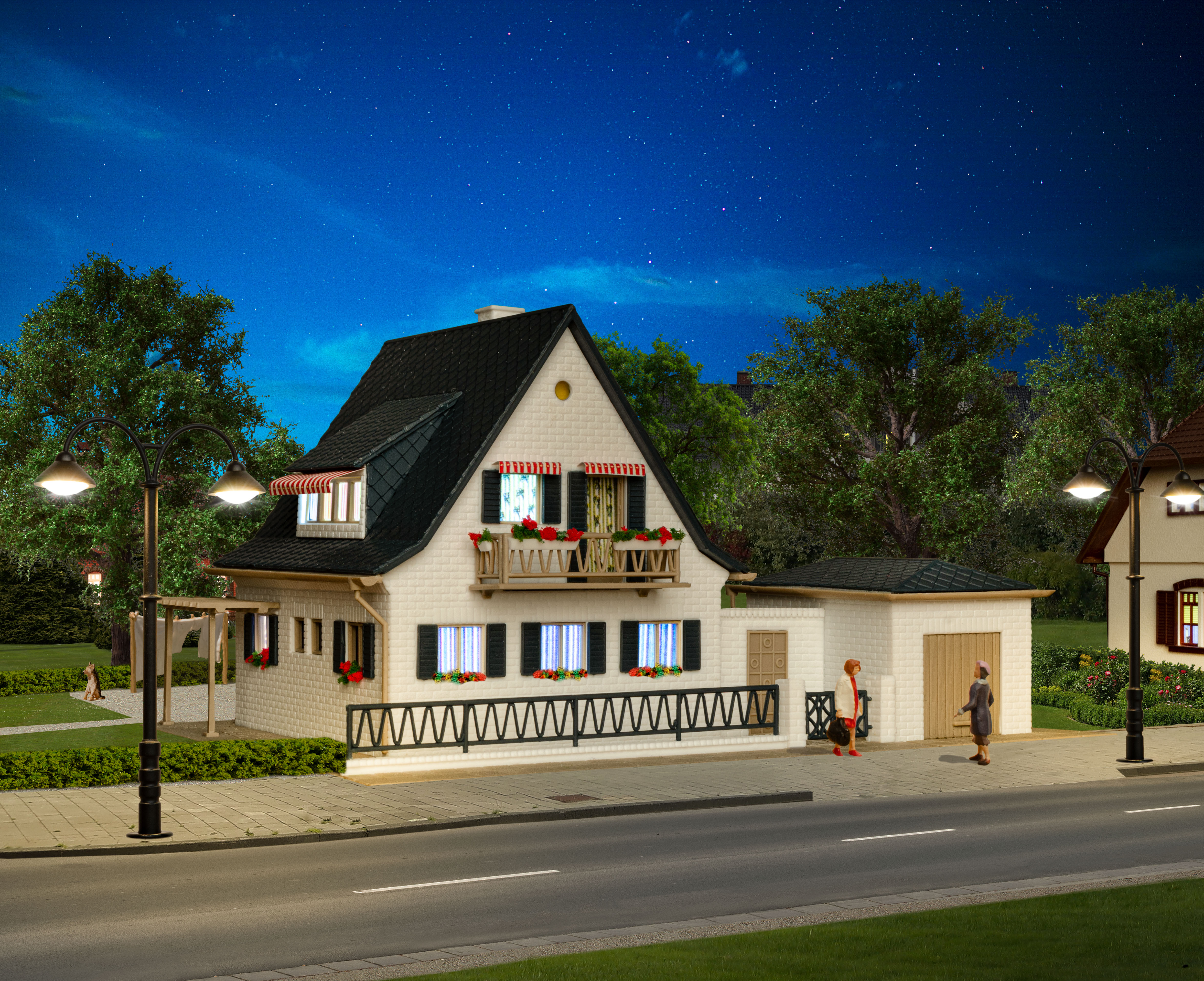 Mit Balkon, Terrasse und Gartenzaun. Maße: Wohnhaus L 11,5 x B 12 x H 8,8 cm, Garage L 7,7 x B 4,5 x H 3,7 cm.