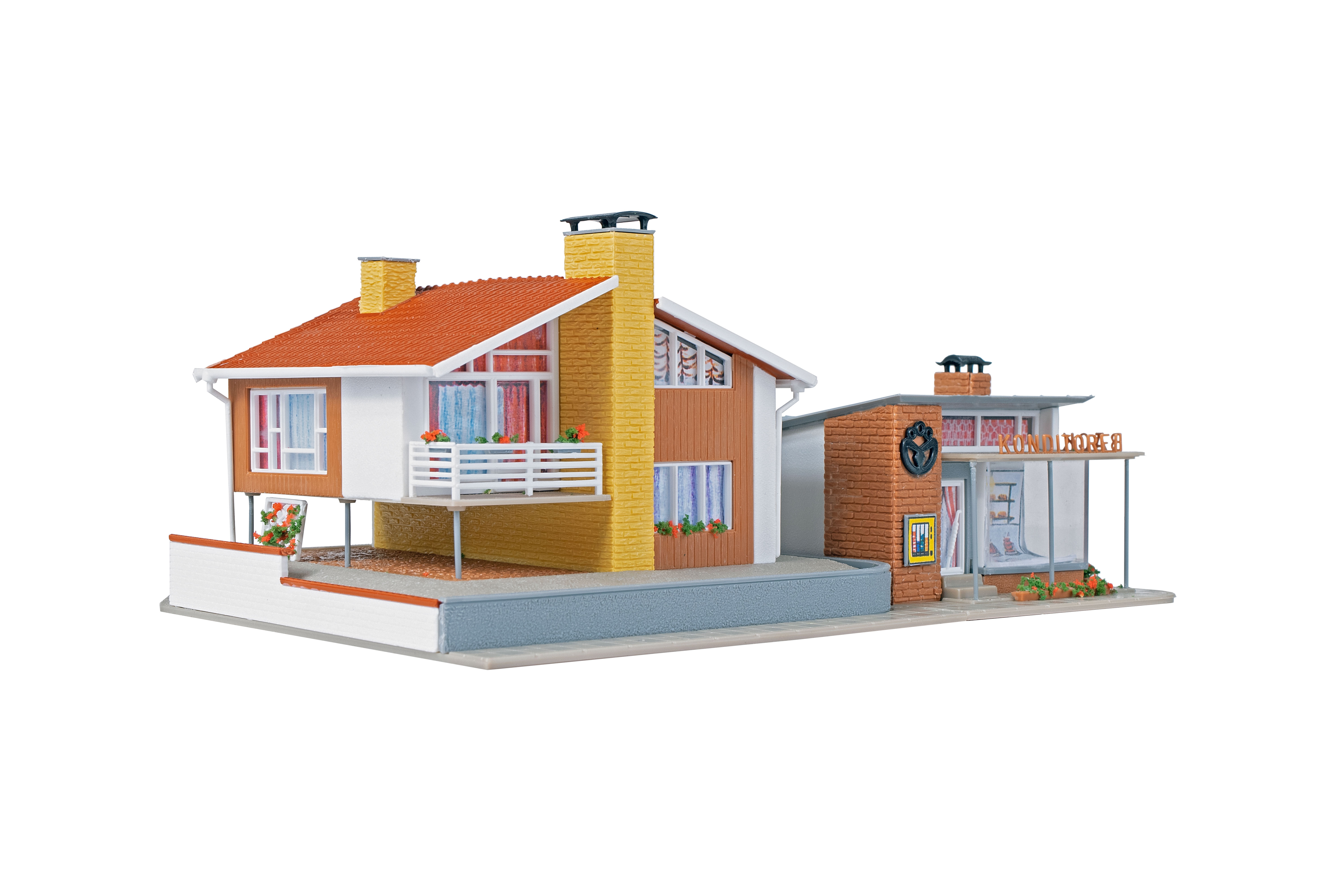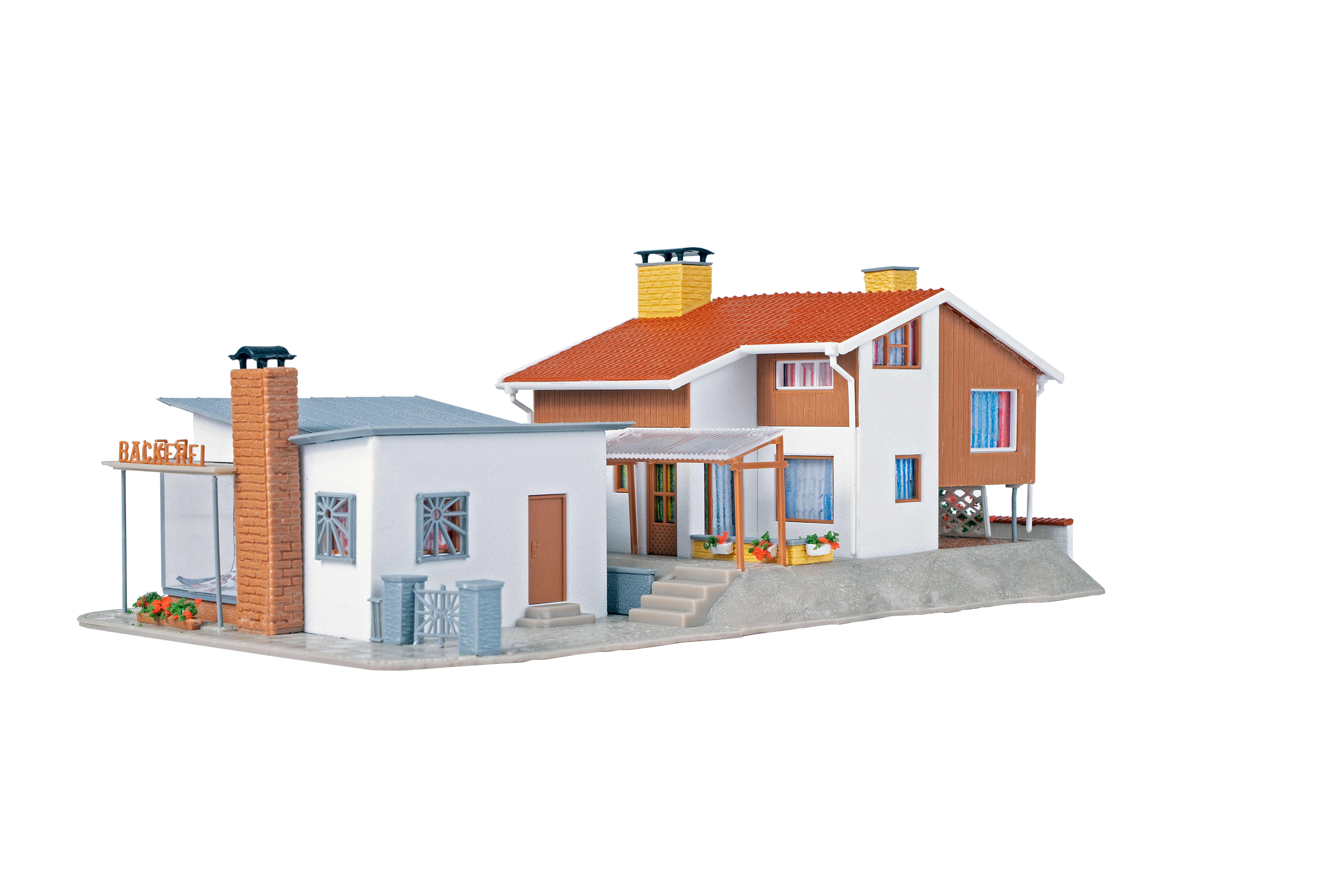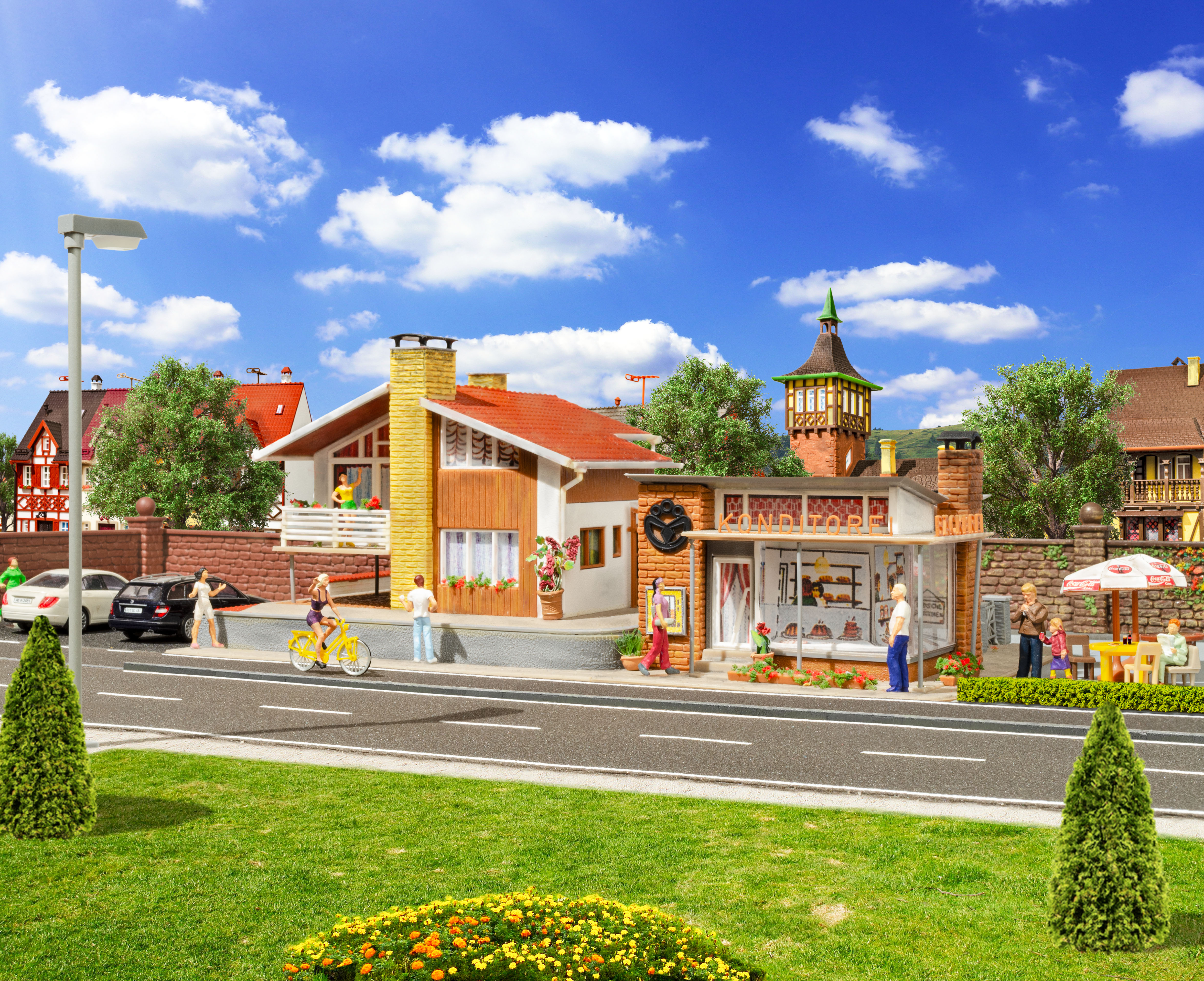 Maße: Wohnhaus L 12 x B 12 x H 8 cm, Konditorei L 12 x B 7,5 x H 5,5 cm.