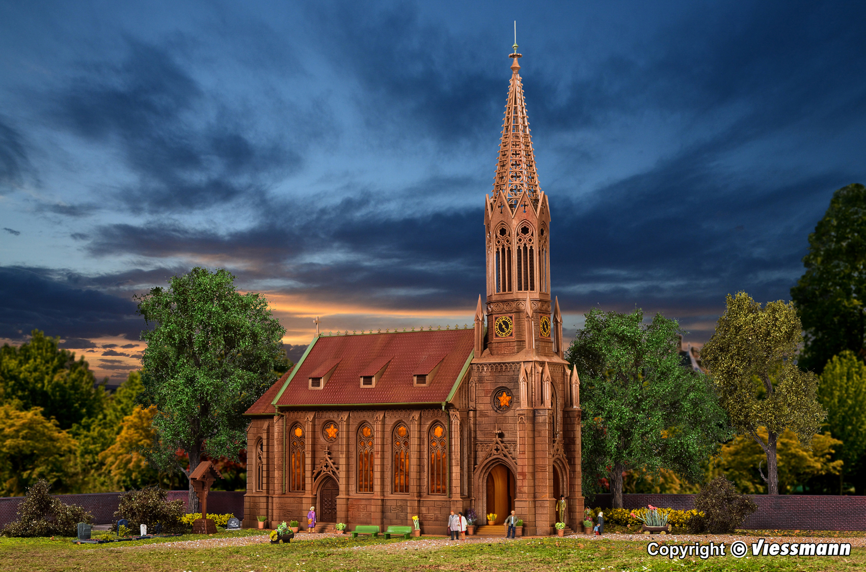 Das Vorbild dieses Vollmer-Modells kann auf eine bewegte Vergangenheit zurückblicken. Bereits im Jahr 1235 soll auf dieser Anhöhe am westlichen Neckarufer eine Kirche gestanden haben. Ihr folgte 1470 zunächst ein Neubau im gotischen Stil, der Mitte des 19. Jahrhunderts durch eine neugotische Kirche ersetzt wurde. Nach der fast völligen Zerstörung im 2. Weltkrieg wurde die Kirche schließlich 1954/55 wieder aufgebaut, so dass sich ihr Äußeres heute kaum von der neugotischen Vorgängerin unterscheidet. Passend zur Kirche gibt es die Freitreppe Art. 43738. Maße: L 30 x B 13 x H 39 cm.
