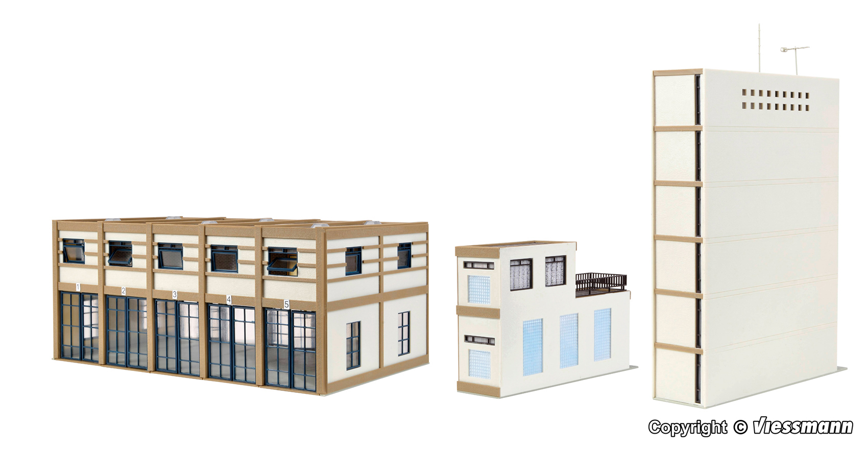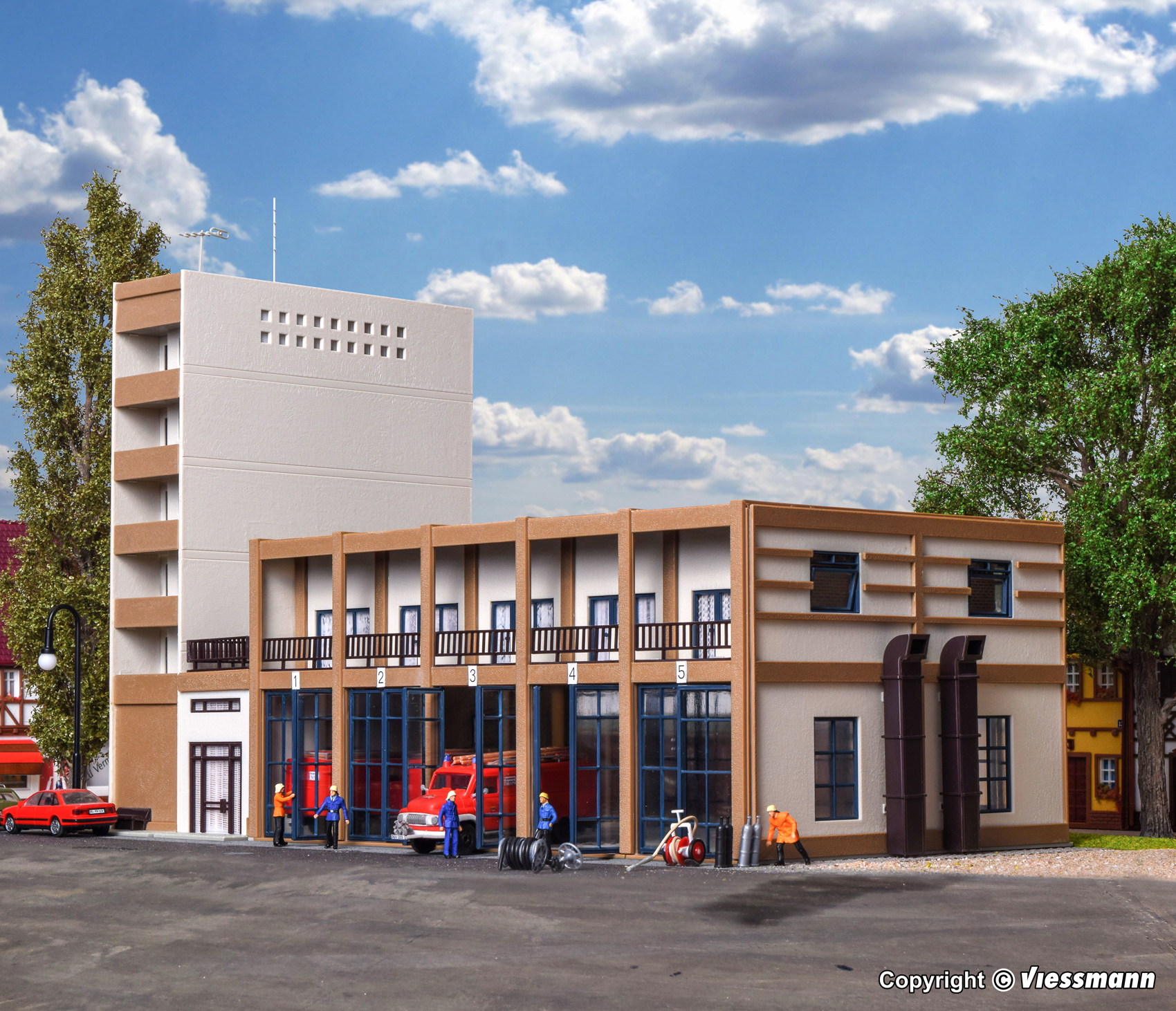 Dieses Feuerwehrgebäude der Epochen III und IV bietet in der Fahrzeughalle mit dem für diese Zeit typischen Flachdach Platz für 5 Einsatzfahrzeuge. Im schmalen Anbau sind Seminar- und Aufenthaltsräume untergebracht. Maße: L 32,5 x B 15 x H 23,5 cm