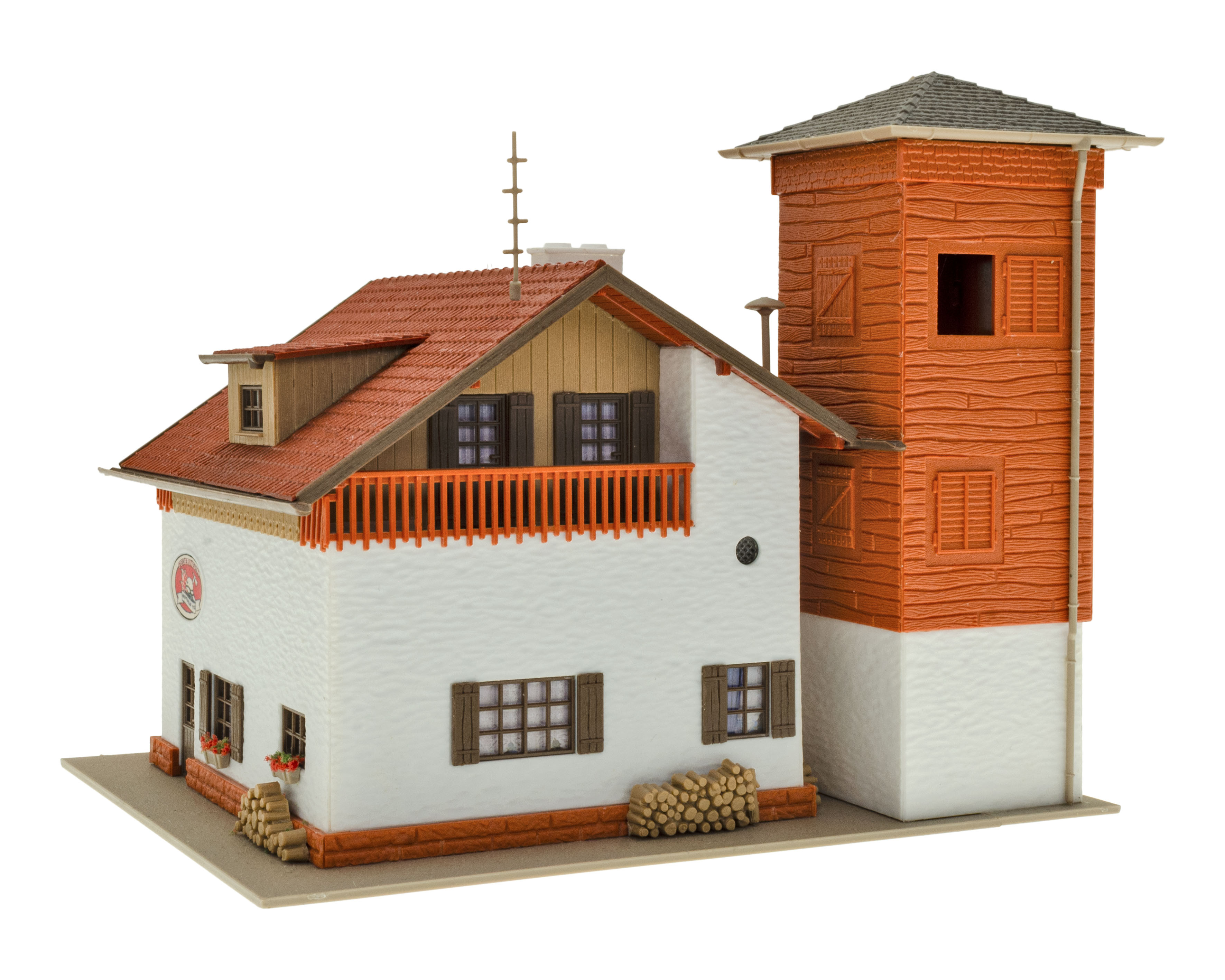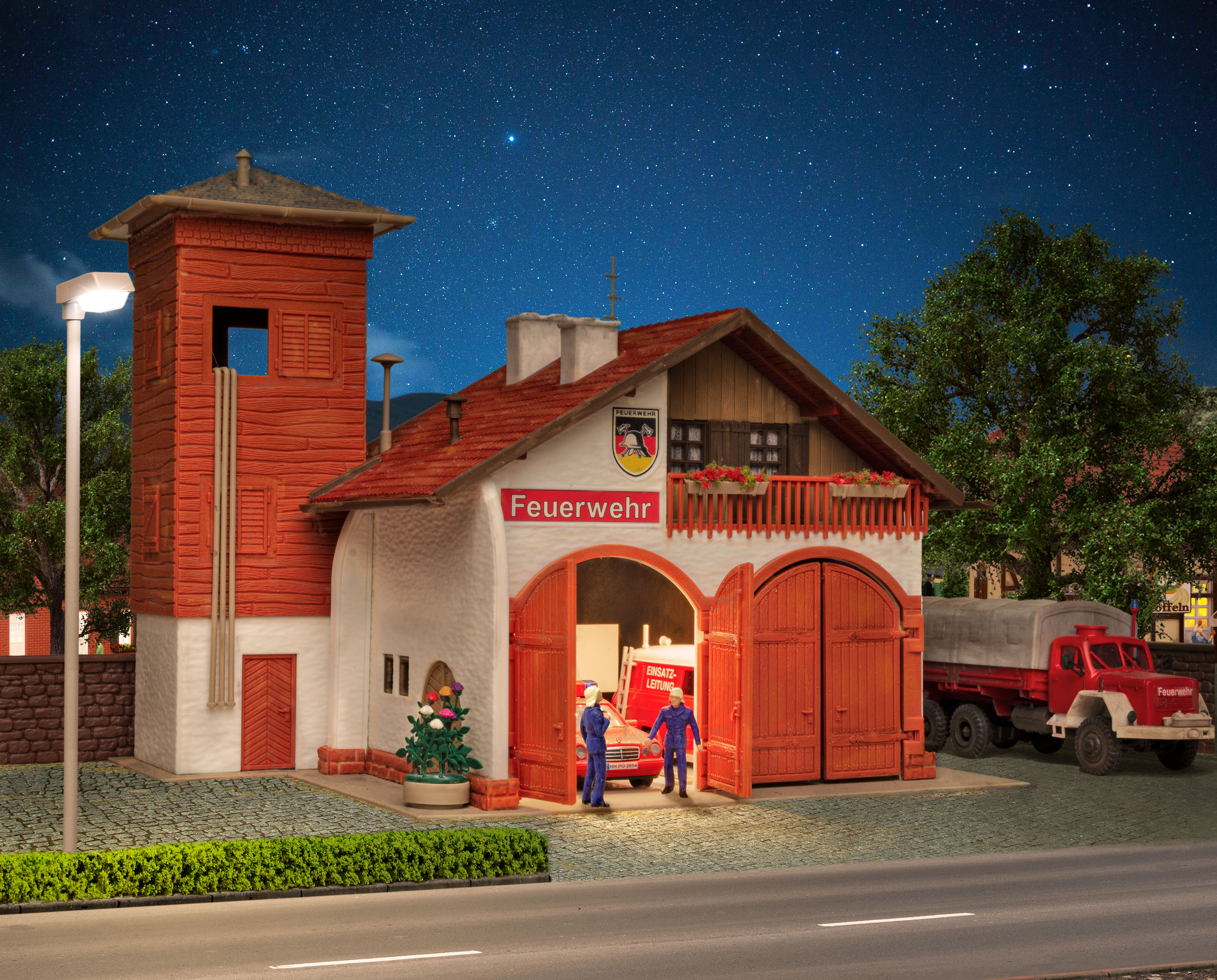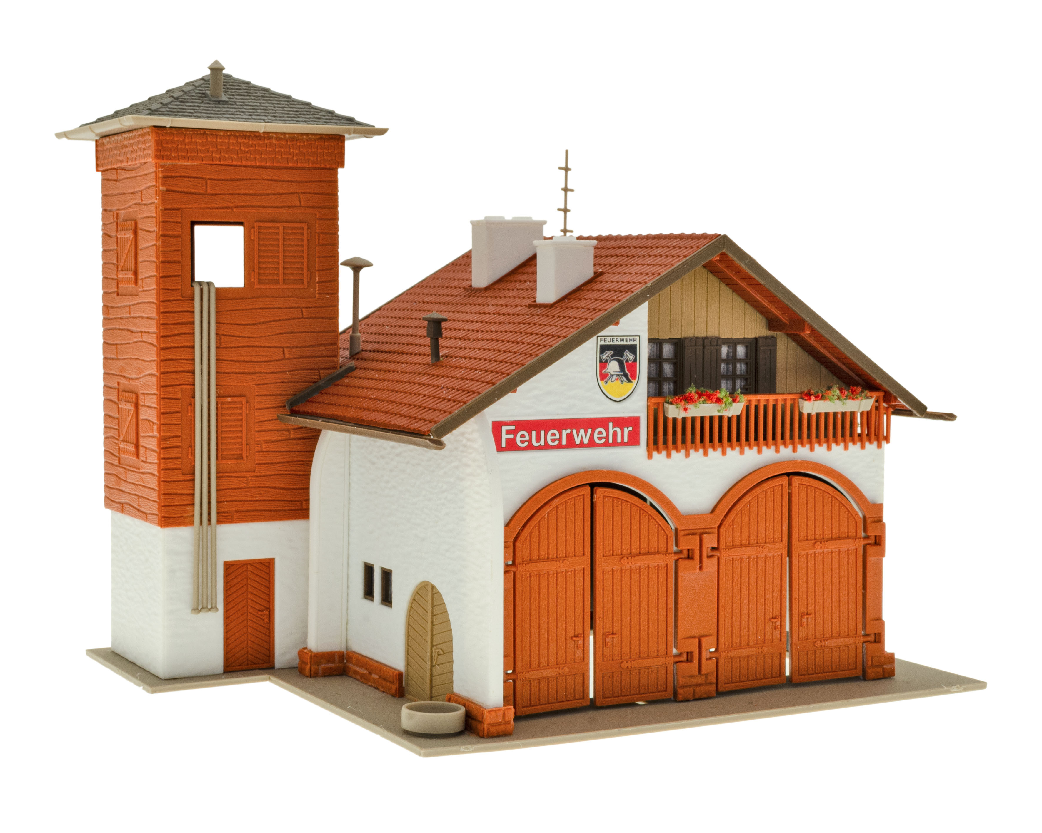Dieses Gebäude wird durch seinen Detailreichtum und umfangreiche Ausschmückungselemente geprägt. Im unteren Bereich finden 2 Einsatzfahrzeuge Platz und der Schlauchturm dient zum Trocknen der Schläuche nach dem Einsatz. Maße: L 13 x B 16,5 x H 10 cm, Turm L 6 x B 6 x H 13 cm.