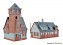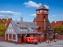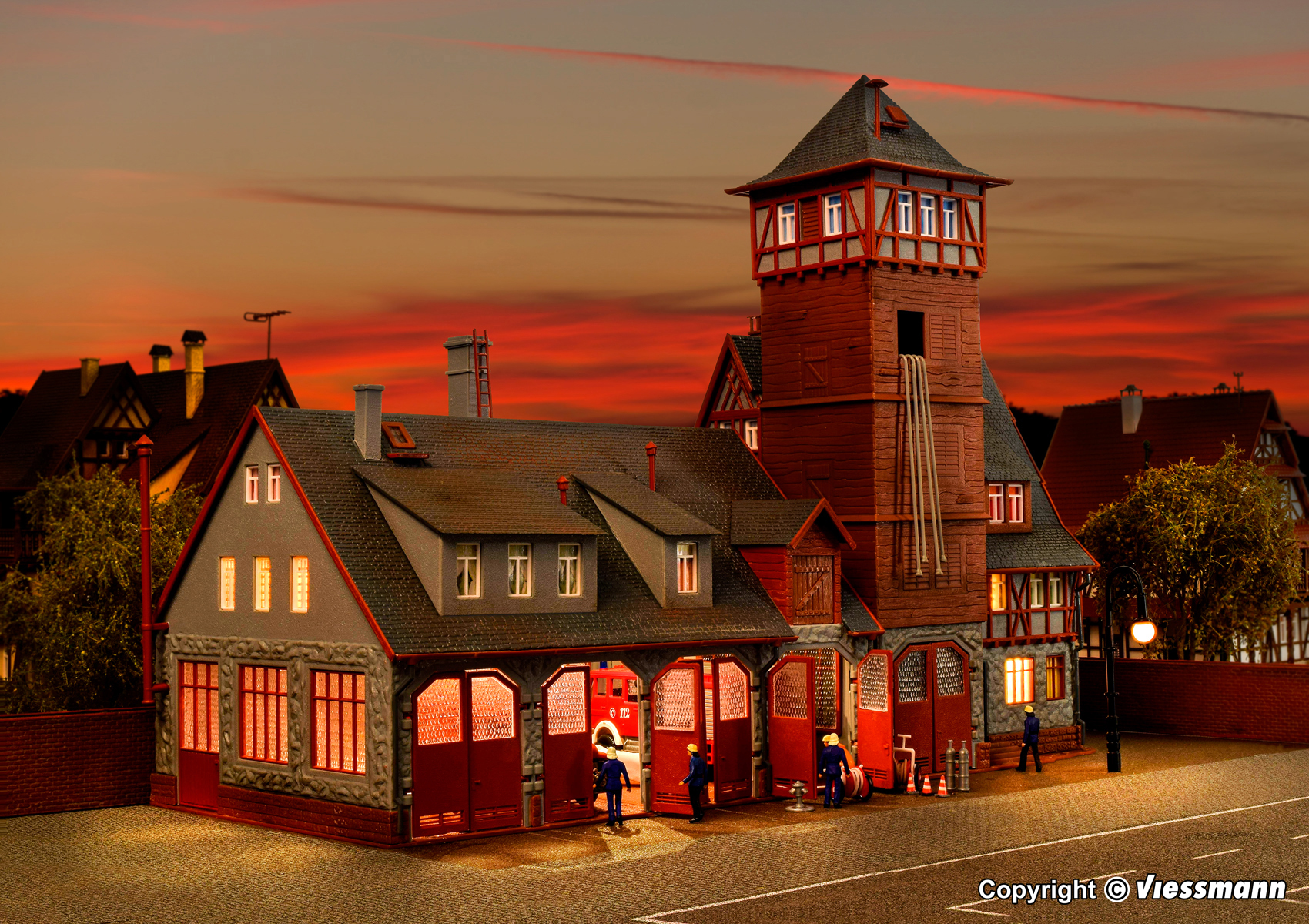 Ein solcher Stützpunkt ist auch heute noch in vielen Kleinstädten zu finden. Hinter den roten Doppeltoren finden bis zu 5 Einsatzfahrzeuge Platz. Der gemauerte Schlauchturm dient zum Trocken der Schläuche nach dem Einsatz. Maße: L 17,5 x B 13 x H 13,5 cm, L 12 x B 13 x H 22 cm.