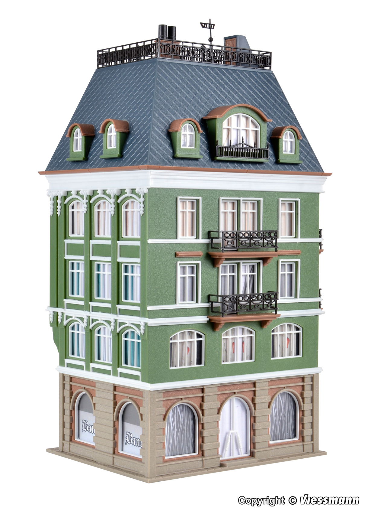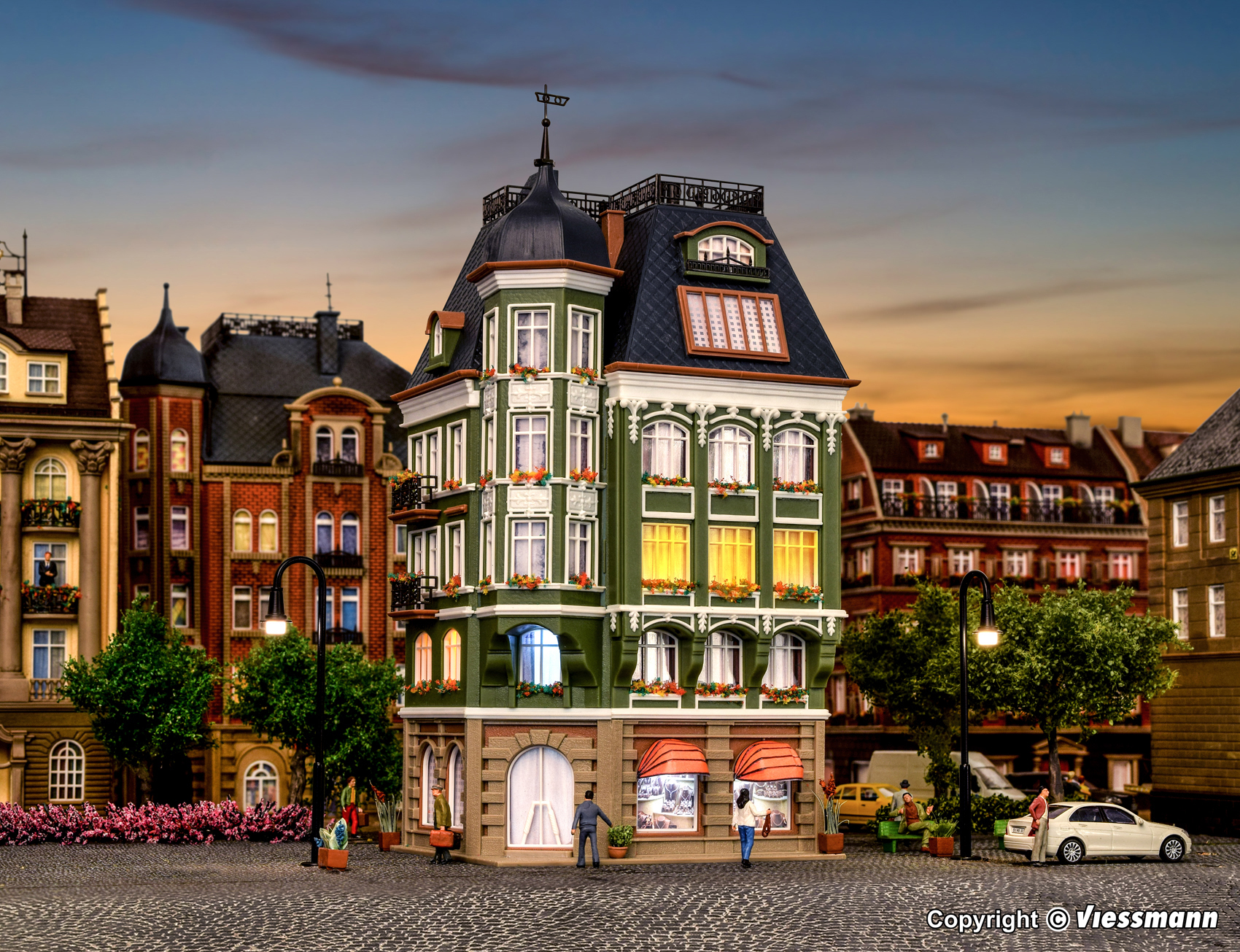 Dieses Modell ist so konstruiert, dass jede Seite eine Sichtseite darstellt. So können Sie z. B. 2 Häuser direkt nebeneinander stellen und sie wirken doch verschieden. Das Gebäude ist mit vielen Details ausgestattet, z. B. Eisengitterverzierungen, zierlichen Balkonen, Stuckfassaden und vielem mehr. Mit den beiliegenden Blendstücken können Sie eine Seite so verkleiden, dass ein zweiter Bausatz direkt angebaut werden kann. Maße: L 10,5 x B 9 x H 21,2 cm.