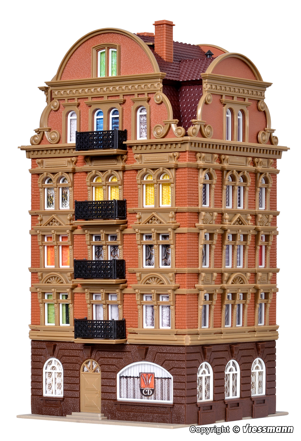 Dieses Modell ist so konstruiert, dass jede Seite eine Sichtseite darstellt. So können Sie z. B. 2 Häuser direkt nebeneinander stellen und sie wirken doch verschieden. Das Gebäude ist mit vielen Details ausgestattet, z. B. Eisengitterverzierungen, zierlichen Balkonen, Stuckfassaden und vielem mehr. Maße: L 11 x B 10,5 x H 20 cm.