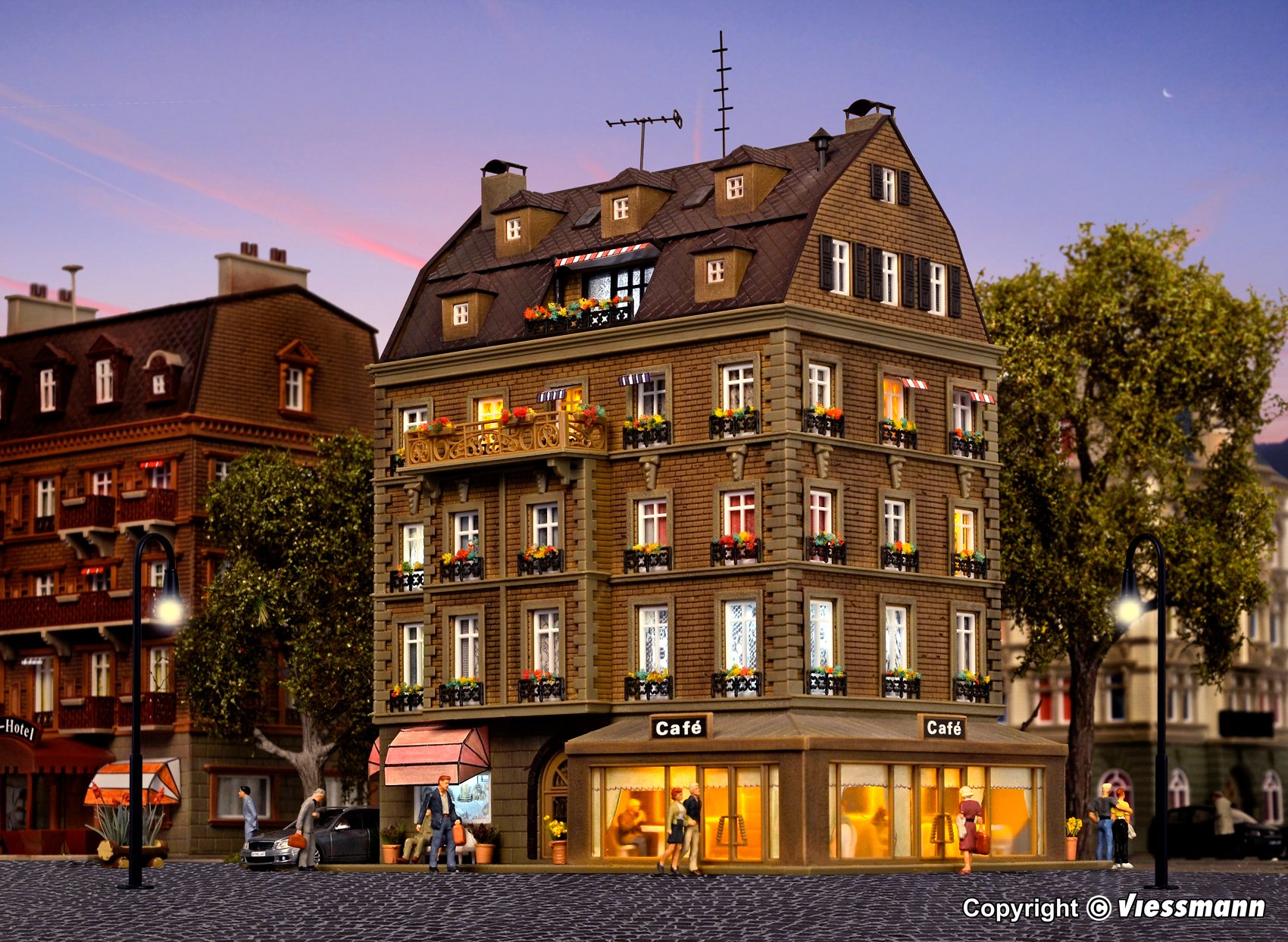 Das Café im Erdgeschoss besticht durch seine große Fensterfläche. Durch sie hat man einen guten Blick in den beleuchteten und mit viel Liebe zum Detail ausgestatteten Innenraum. Das Dachgeschoss ist ausgebaut und in der Mitte befindet sich eine kleine Dachterrasse. Maße: L 17 x B 11,5 x H 20,5 cm.