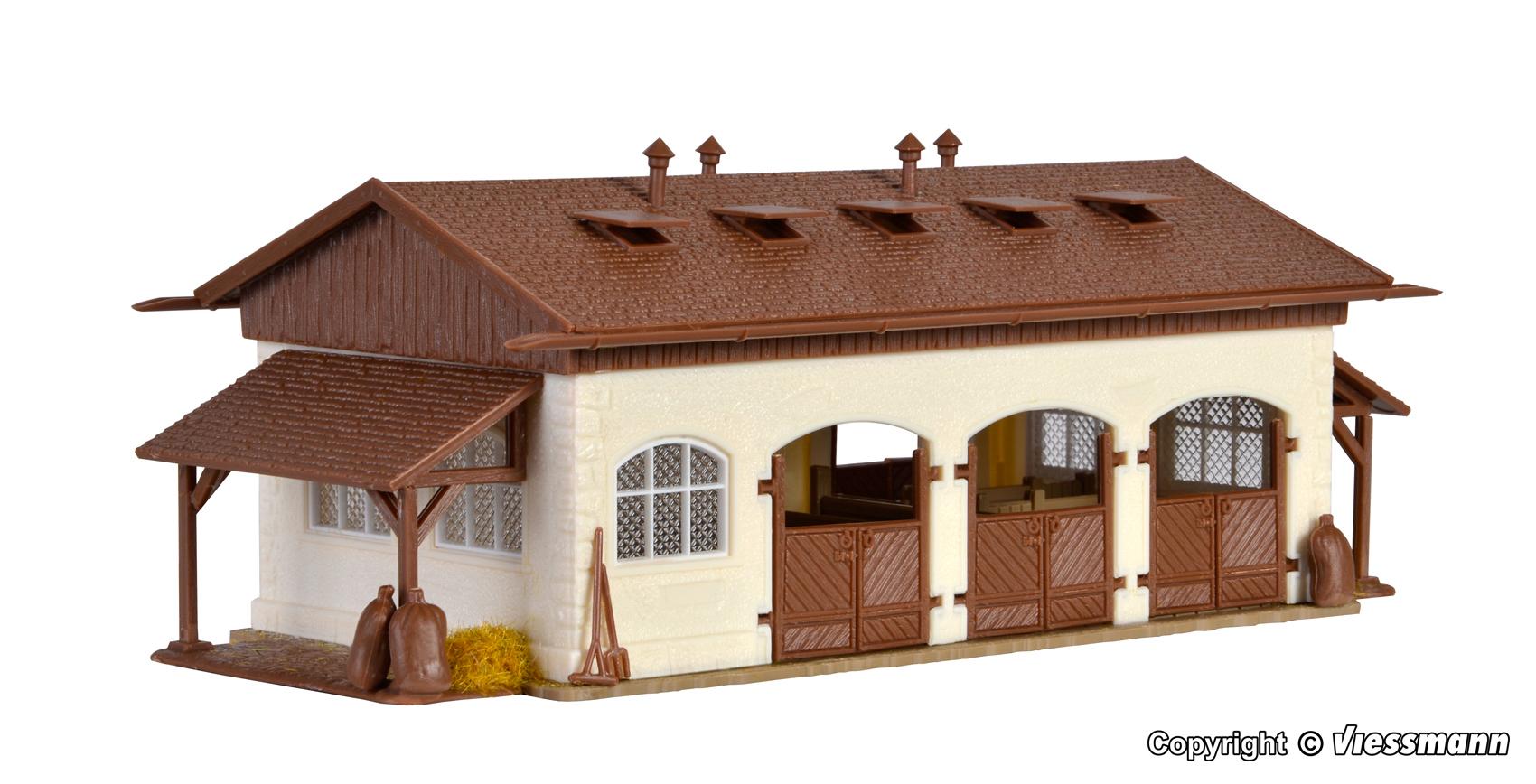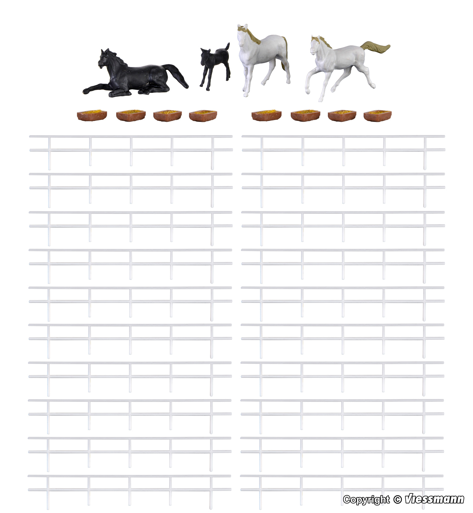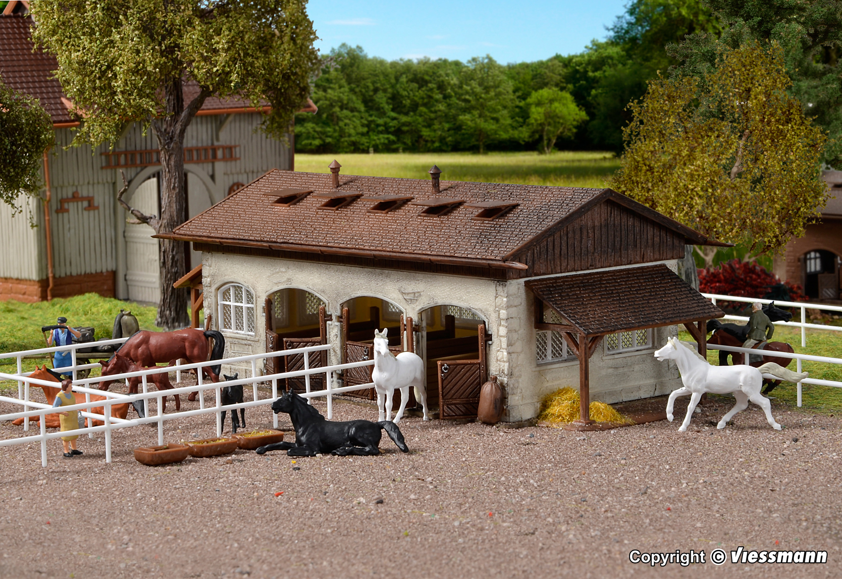 4 Pferde liegen dem Bausatz bei. Das Dach des Stalls ist abnehmbar. So kann das Innere nach Belieben gestaltet und verändert werden. Maße: L 17 x B 8,5 x H 6,5 cm, Zaun L 180 x H 1,4 cm.