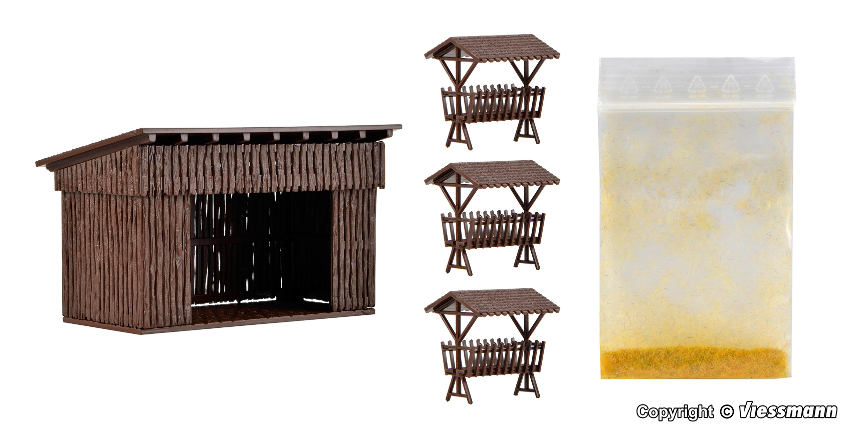 Der Förster oder Jäger bringt den Waldtieren in der kalten Jahreszeit Futter. Das Heu wird in Futterraufen, die feste Nahrung in Tröge geschüttet. So kann man bei einer Wildfütterung der Natur und den Tieren ganz nahe sein. Der Bausatz besteht aus der Scheune und 3 Futterraufen. Maße: Scheune L 8 x B 5 x H 5,1 cm, Futterraufe L 2,7 x B 2,2 x H 3 cm.
