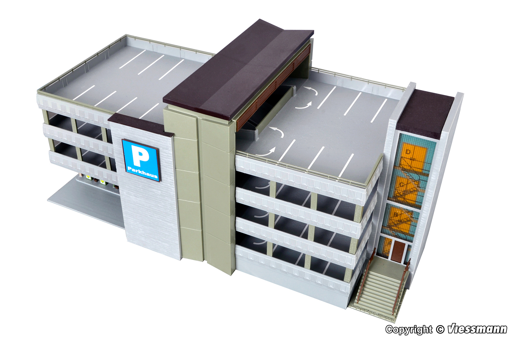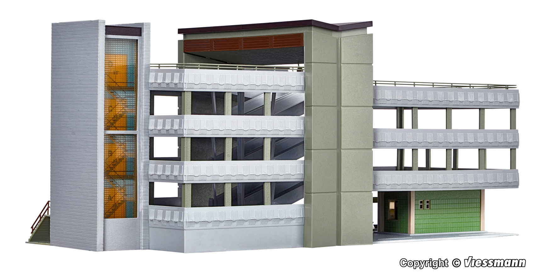 Dieses Parkhaus verfügt über 3 Parkdecks und eine Tankstelle mit 3 Zapfsäulen im Erdgeschoss. Maße: L 38 x B 19 x H 17,5 cm.