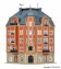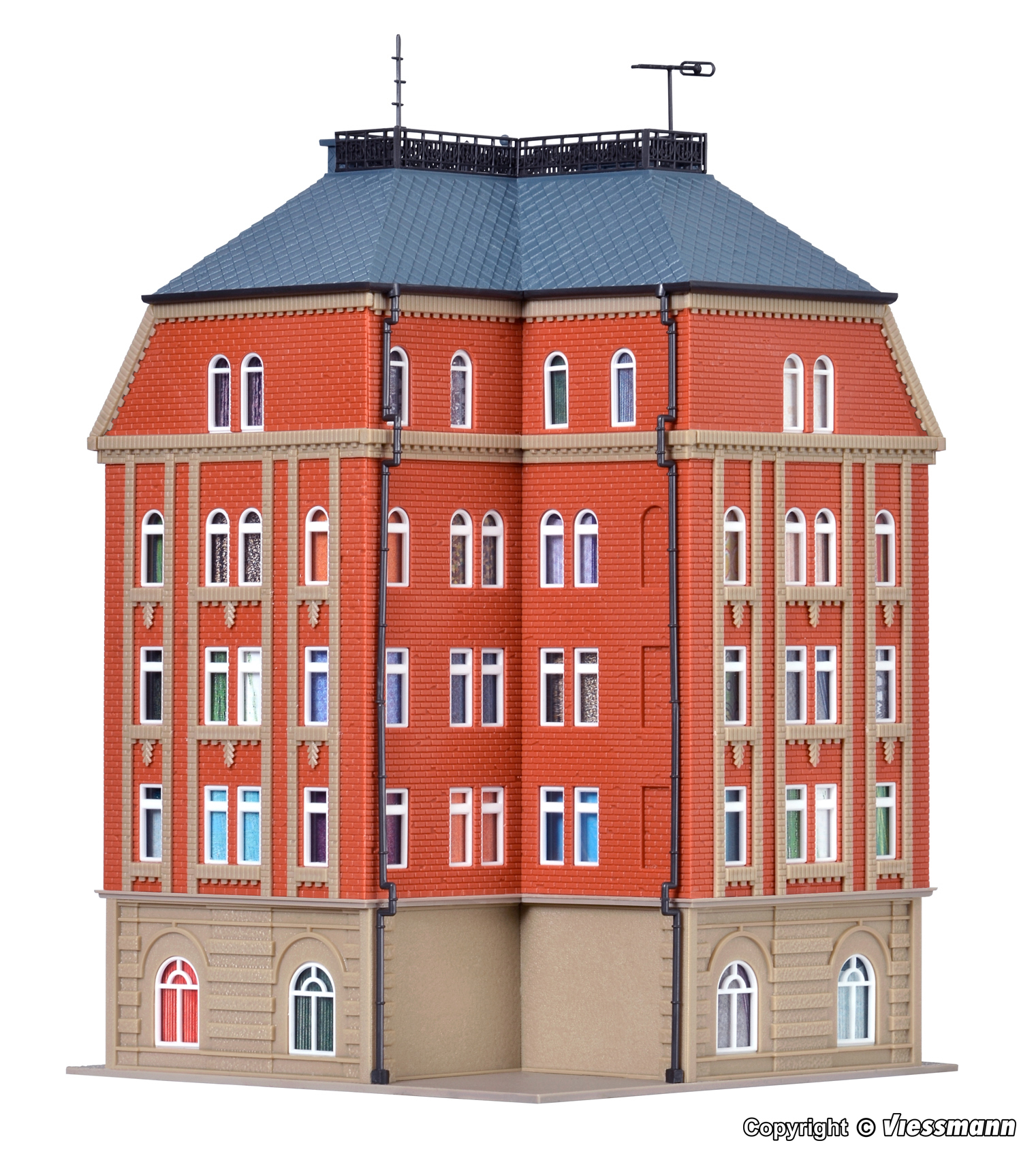 Die Gebäude der Schlossallee sind besonders hochwertige Architekturmodelle und genügen höchsten Modellbauansprüchen. Alle Häuser dieser Serie sind mit vielen Details ausgestattet, z. B. Eisengitterverzierungen, zierlichen Balkonen, Stuckfassaden und vielem mehr. Die Schlossallee besteht aus dem Eckhaus, dem Wohnhaus Art. 43813 und dem Haus am Park Art. 43815. Das Eckhaus ist ein stattliches Stadthaus und als Anfangs- und Endpunkt ganzer Straßenzüge ideal geeignet. Maße: L 14 x B 14 x H 22,5 cm.