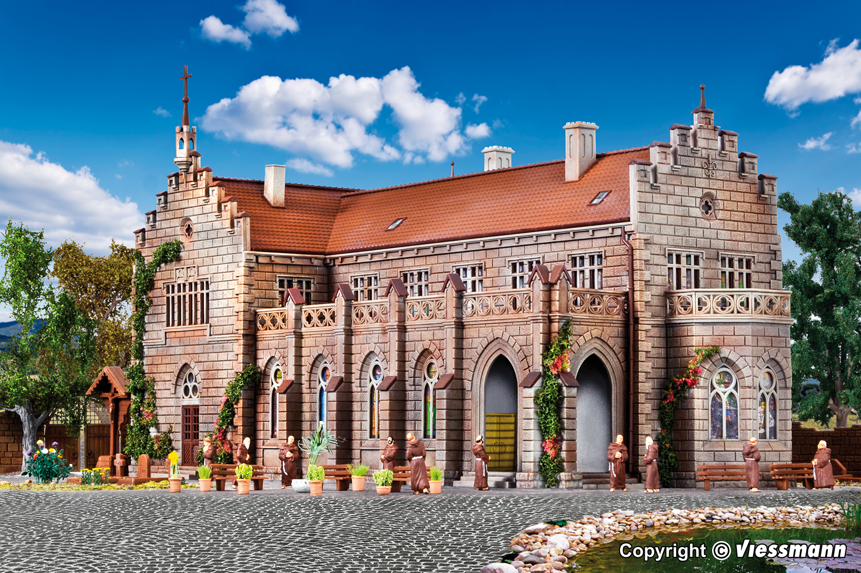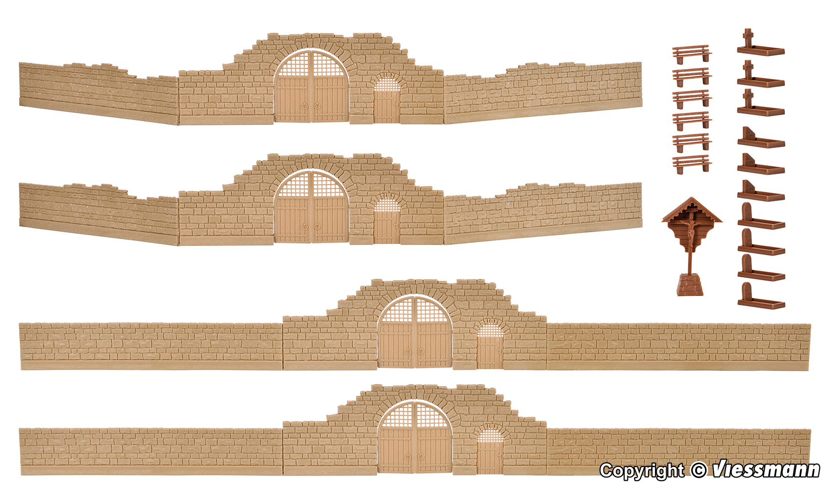 Die Mönche haben diese Klosteranlage wunderschön gestaltet und freuen sich auf vorbeikommende Gäste. Zu dieser idyllisch gelegenen Klosteranlage gehört der kleine Friedhof mit Kruzifix, Gräbern und Bänken sowie die umgebende Klostermauer mit Toren, Blumenflocken und Belaubungsmaterial. Maße: ohne Mauer: L 33,5 x B 18 x H 19,5 cm. Mauer: L 222 x B 0,2 x H 5 cm.