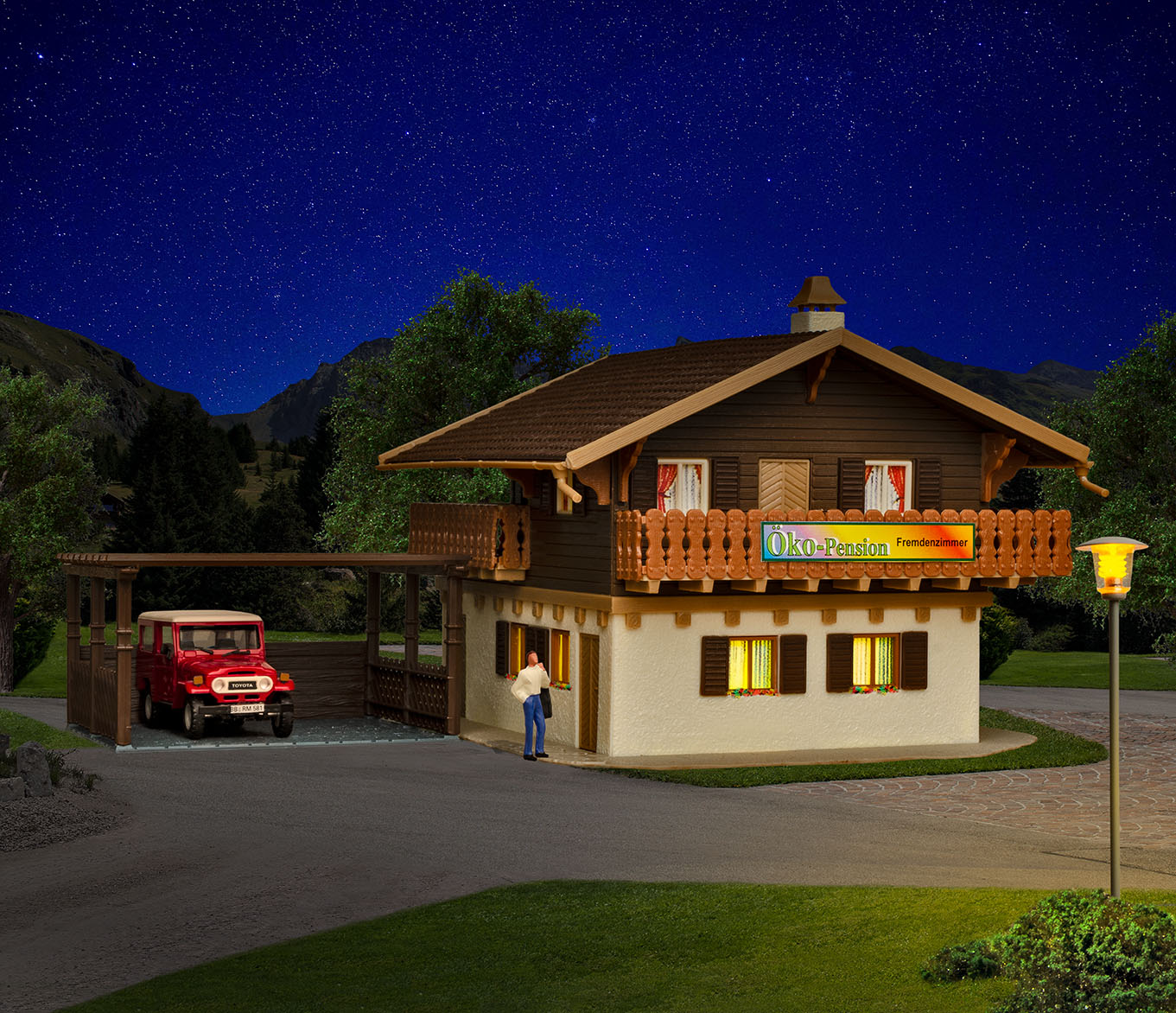 Die Öko-Pension wartet mit alpenländischer Gastfreundschaft auf. Im Carport können 2 Autos untergebracht werden. Maße: L 17,5 x B 12 x H 8,2 cm.