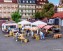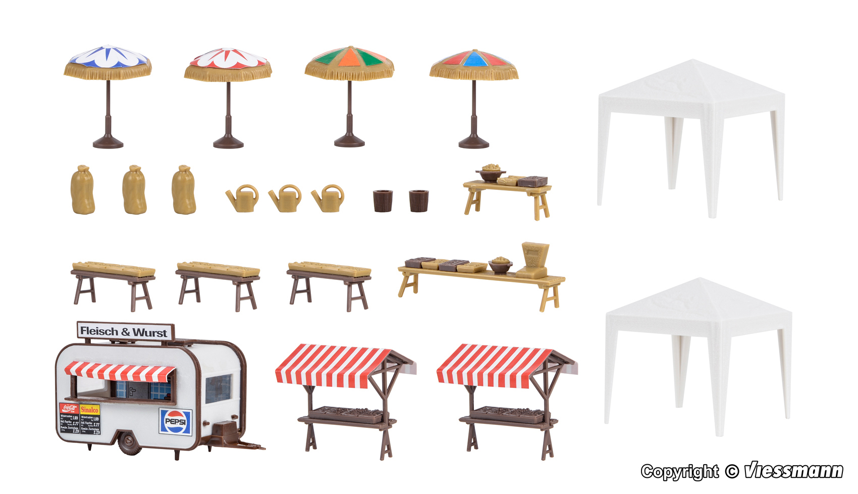 Mit verschiedenen Marktständen, Verkaufswagen und Zubehör. Maße: Partyzelte: L 3,5 x B 3,5 x H 3,7 cm. Verkaufswagen: L 6 x B 4 x H 3,6 cm.