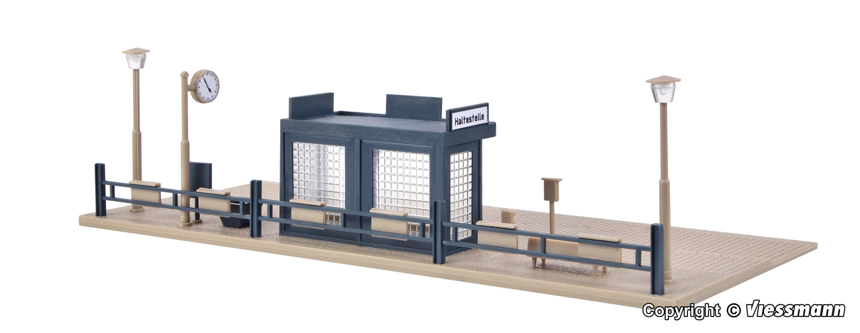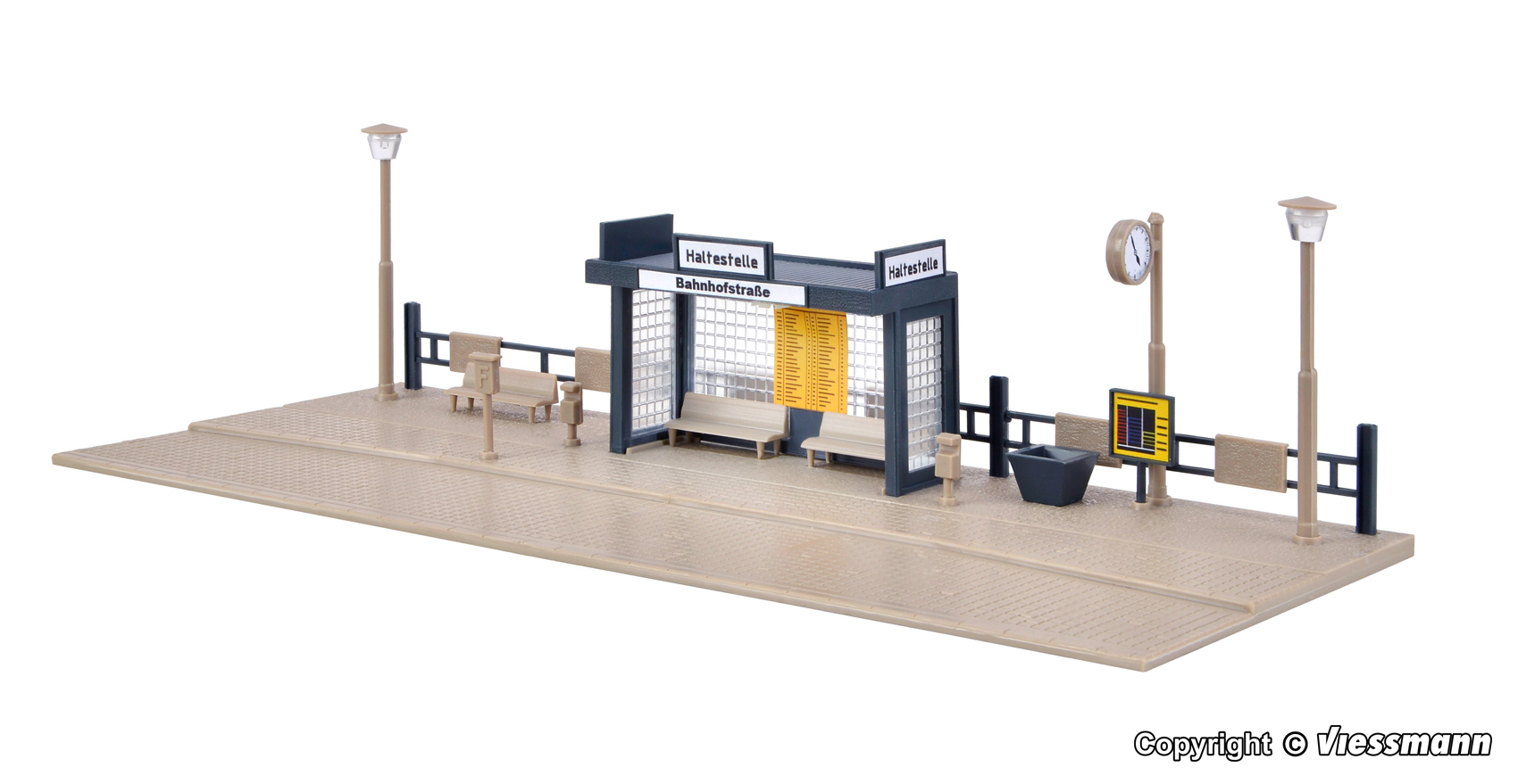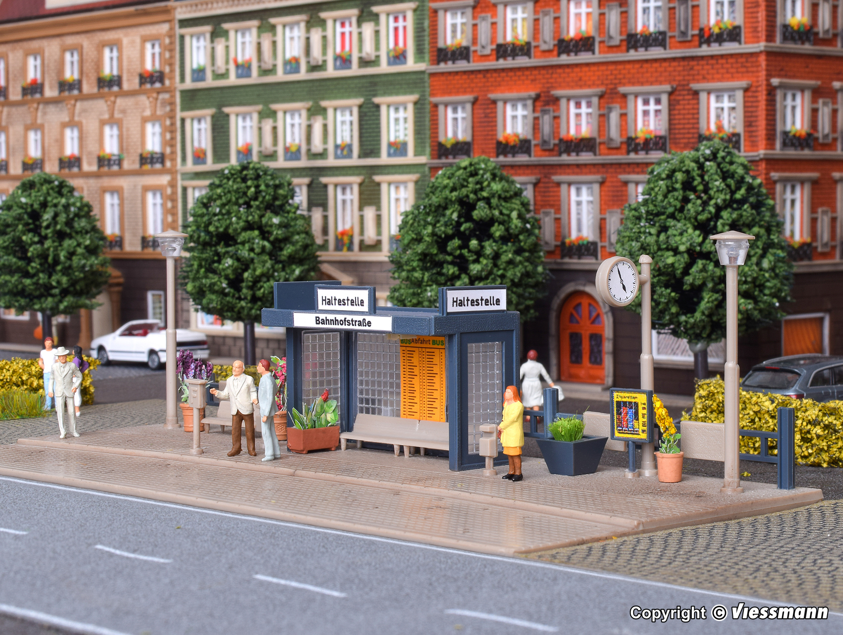 Kommt der Bus pünktlich oder hat er wieder Verspätung? Solche kleinen Haltestellen findet man häufig entlang innerstädtischer Buslinien. Eine LED unter dem Dach leuchtet den Wartebereich gleichmäßig aus, die beiden Straßenlampen sind ohne Funktion. L 19 x B 8 x H 5 cm.