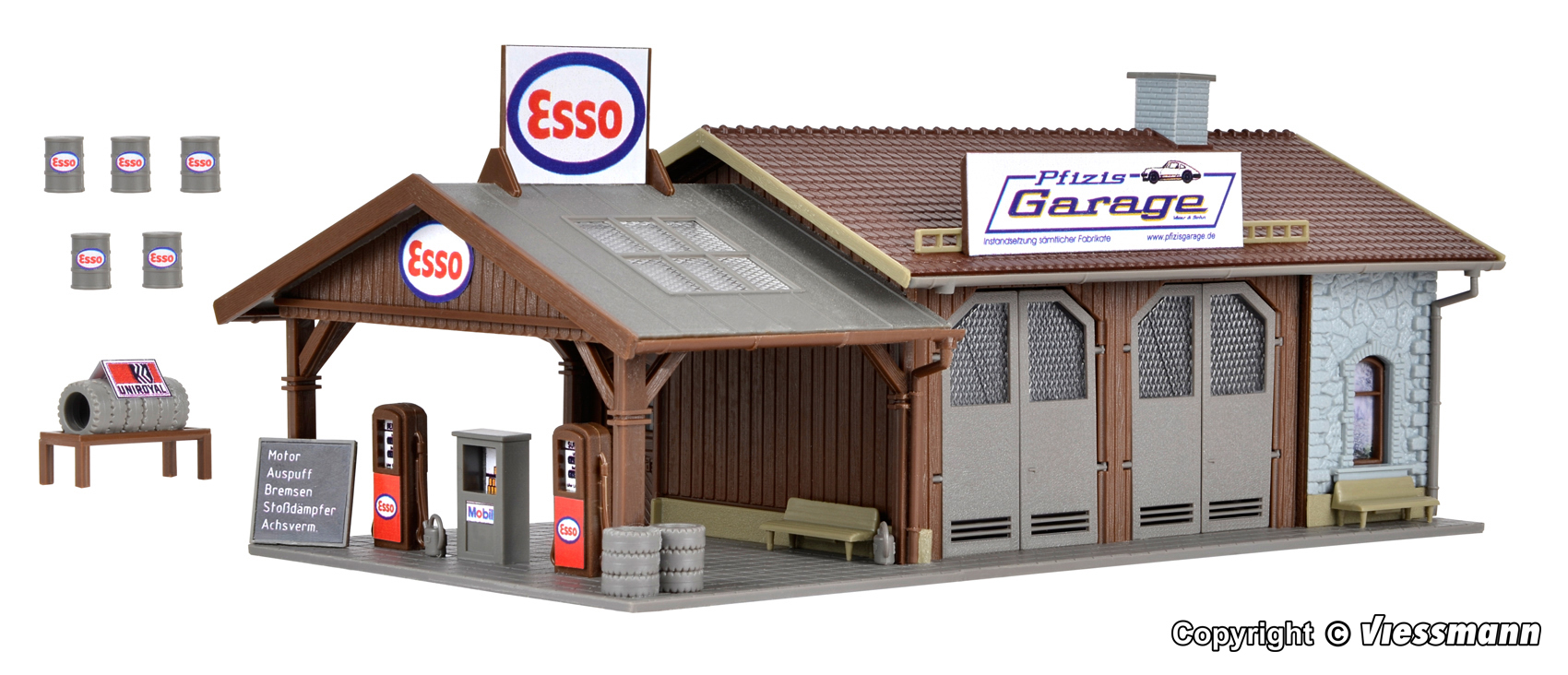 Der Besitzer dieser Autoreparaturwerkstatt ist ein netter junger Mann. Er liebt Autos und ist ein absoluter Fachmann auf diesem Gebiet. Er bietet einen super Service und ist spezialisiert auf das Herrichten von Oldtimern. Pfizis Garage ist im nostalgischen Stil gehalten und passt wunderbar in Epoche III. Viele Zubehörteile liegen dem Bausatz bei und selbst eine kleine Tankstelle ist integriert. Maße: L 19 x B 10 x H 7,5 cm.
