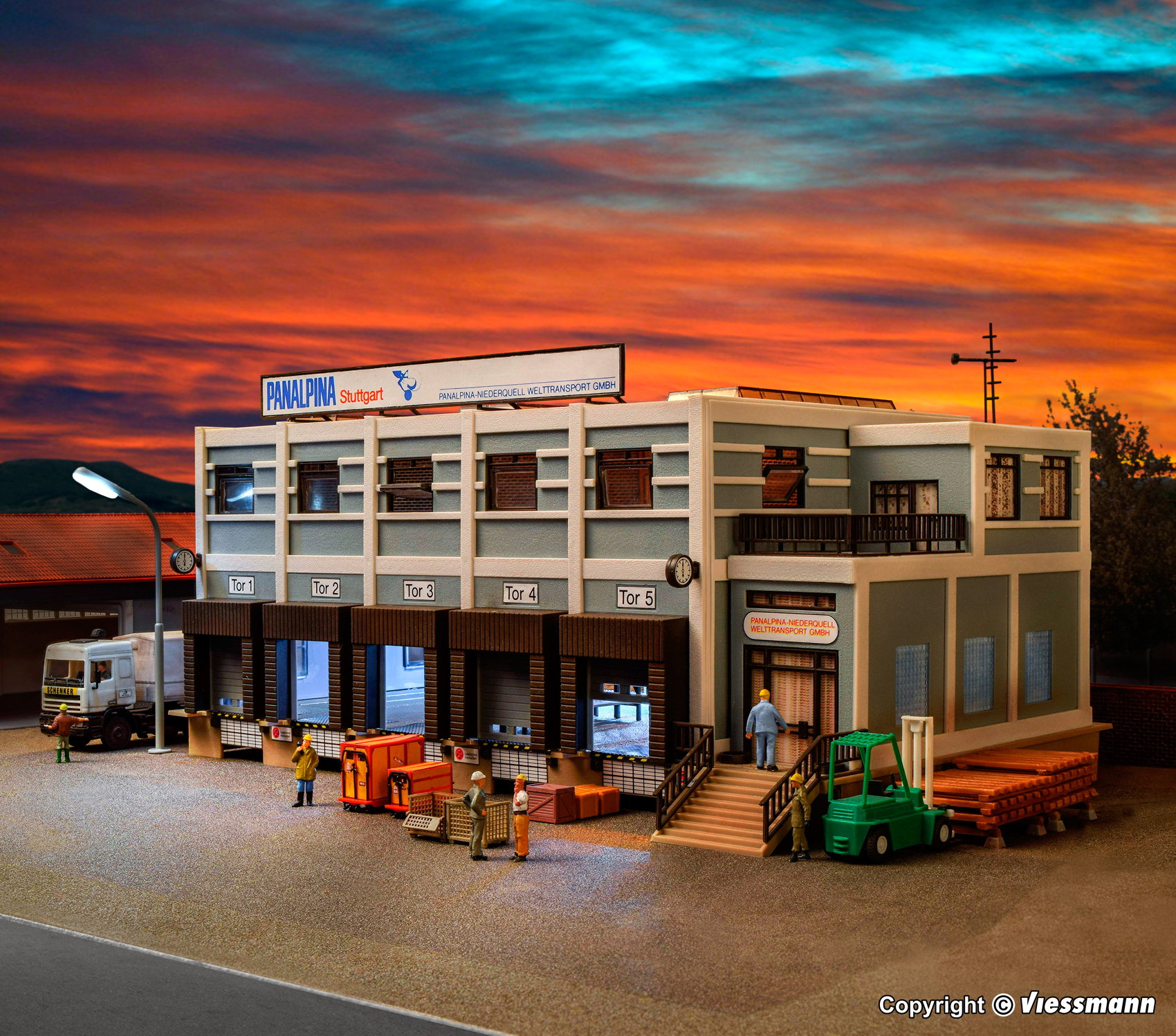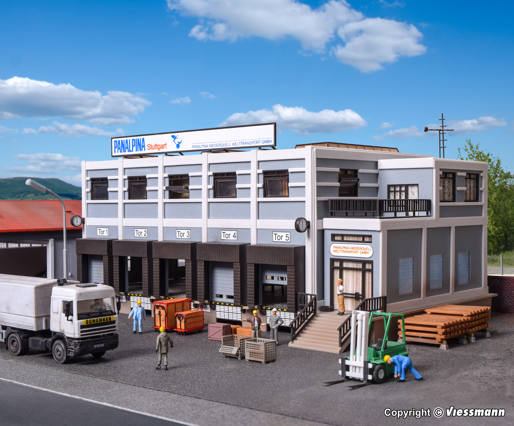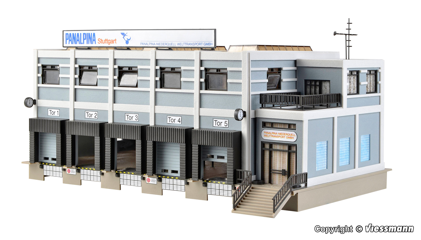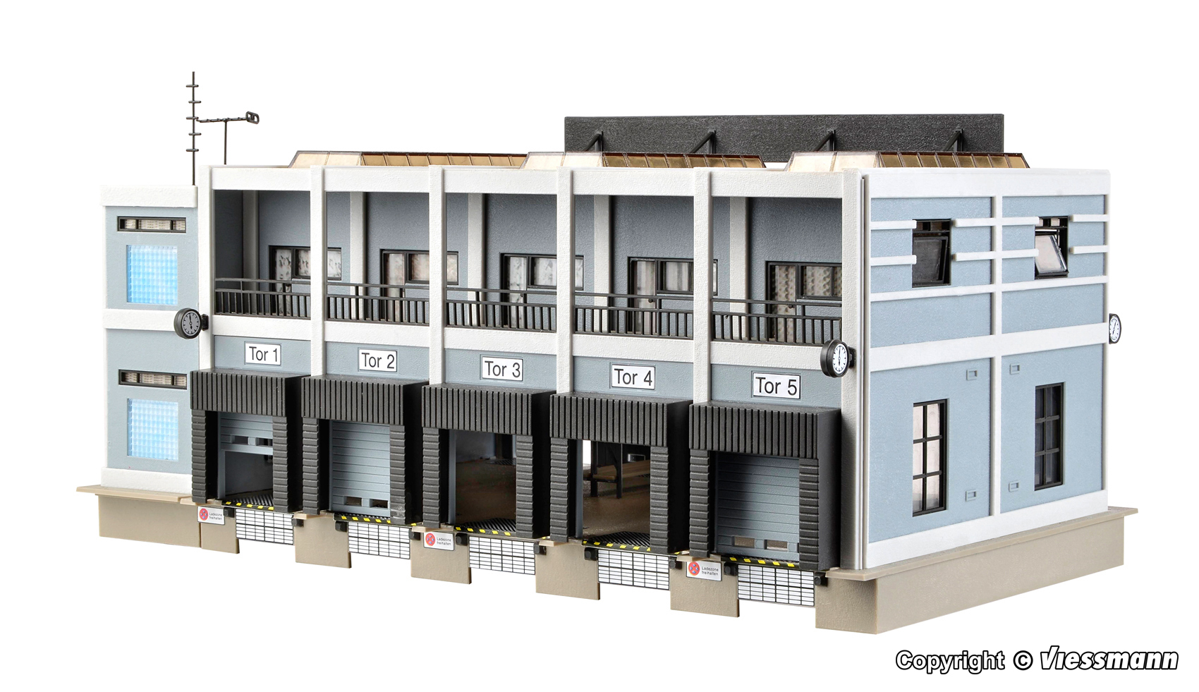 Dieses Gebäude mit Flachdach verfügt über 5 Tore zum Be- und Entladen der LKW. L 28 x B 19 x H 15 cm.