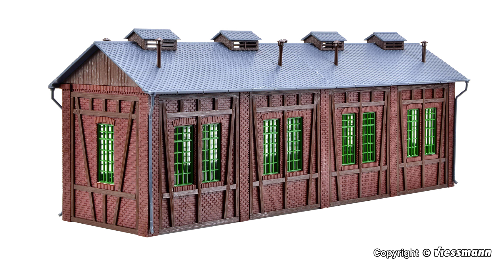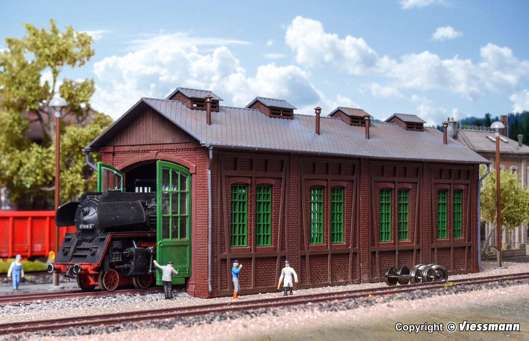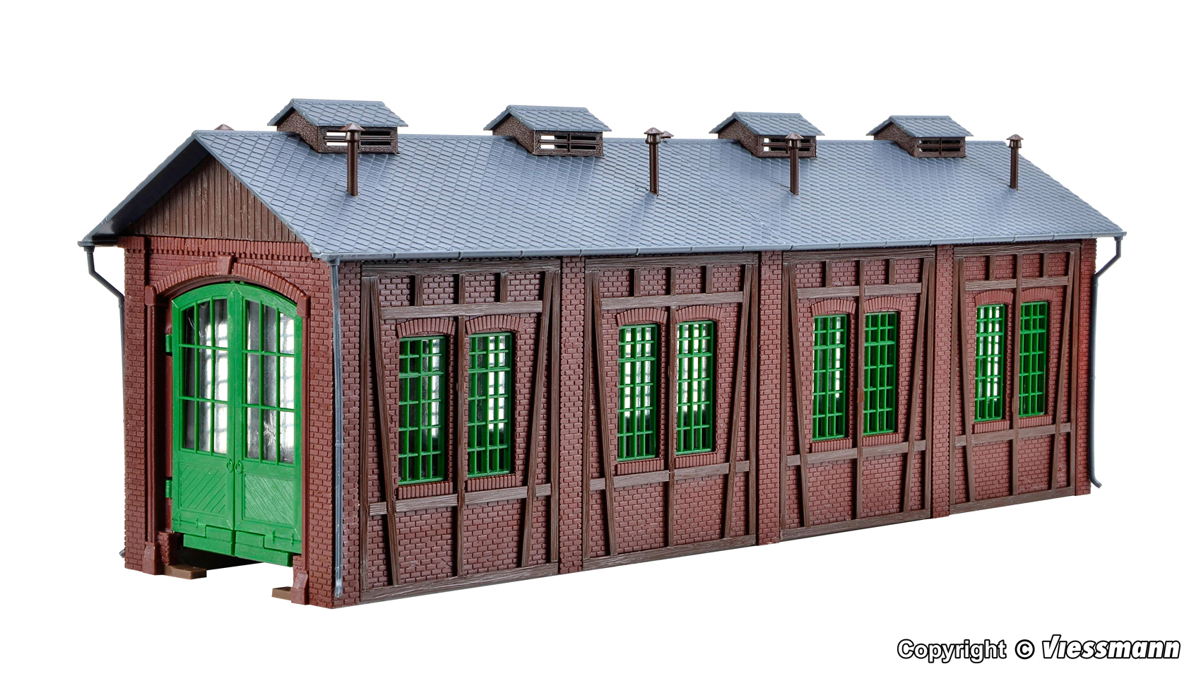 Die Türen werden von den ein- und ausfahrenden Lokomotiven automatisch geöffnet und geschlossen. Maße: L 32 x B 9,5 x H 11,5 cm.