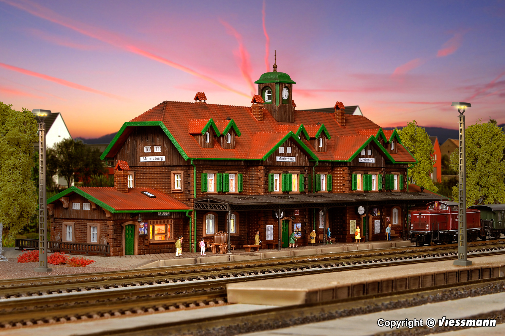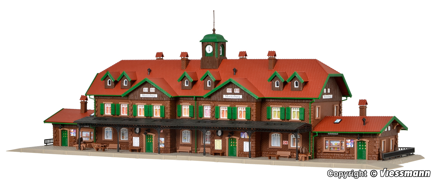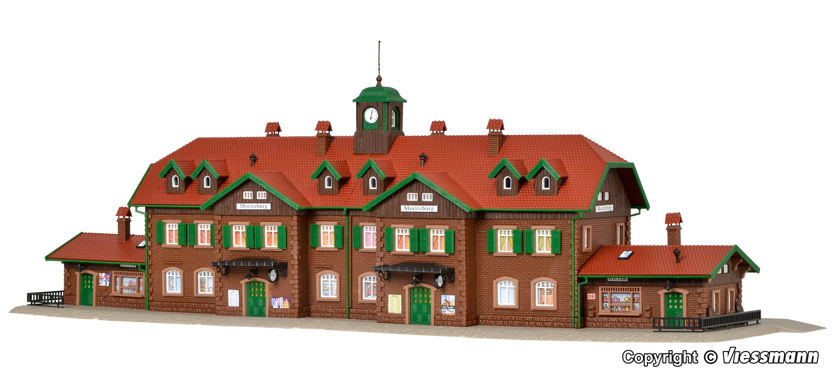 Der Bahnhof Moritzburg ist ein stattlicher Bahnhof, auch in Spur N. Die vielen Details machen ihn zum Blickpunkt auf Ihrer Anlage. Hier herrscht geschäftiges Kommen und Gehen, nicht nur Reisende verweilen gerne dort. Maße: L 42 x B 12 x H 13,5 cm.