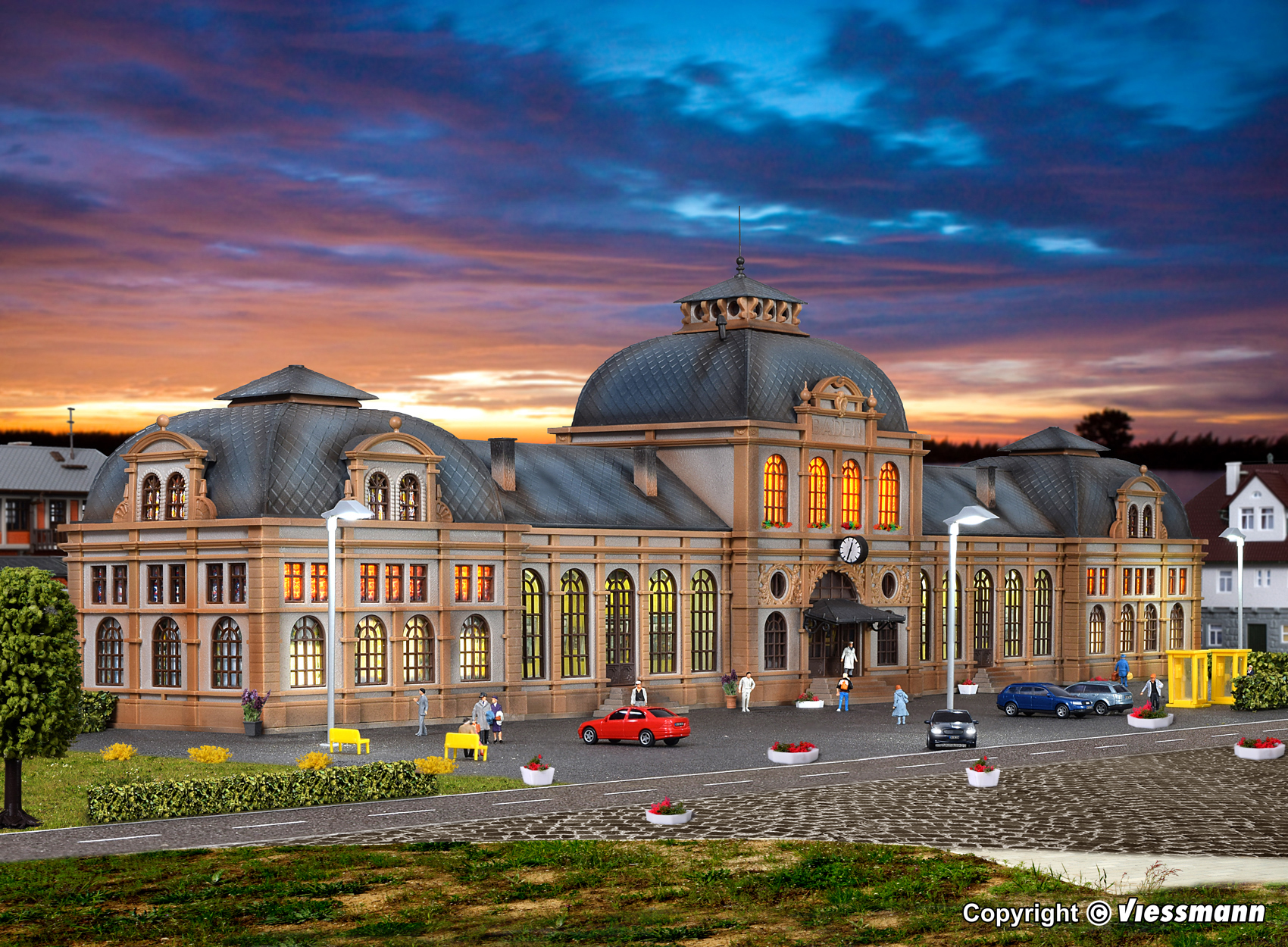 Das Vorbild dieses klassischen, im Jahr 1892 erbauten, Bahnhofs steht in Baden-Baden. Dieses detailgenaue Vollmer-Modell ist ein Muster an Vorbildtreue und Präzision. Der Bahnhof eignet sich für Liebhaber der 2. Bahnepoche. Maße: L 51 x B 11,5 x H 16 cm.