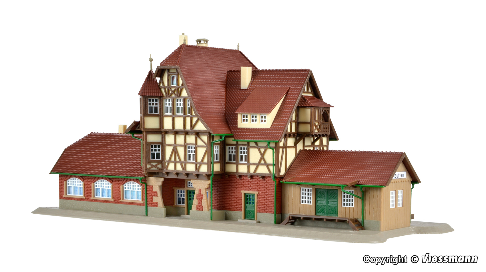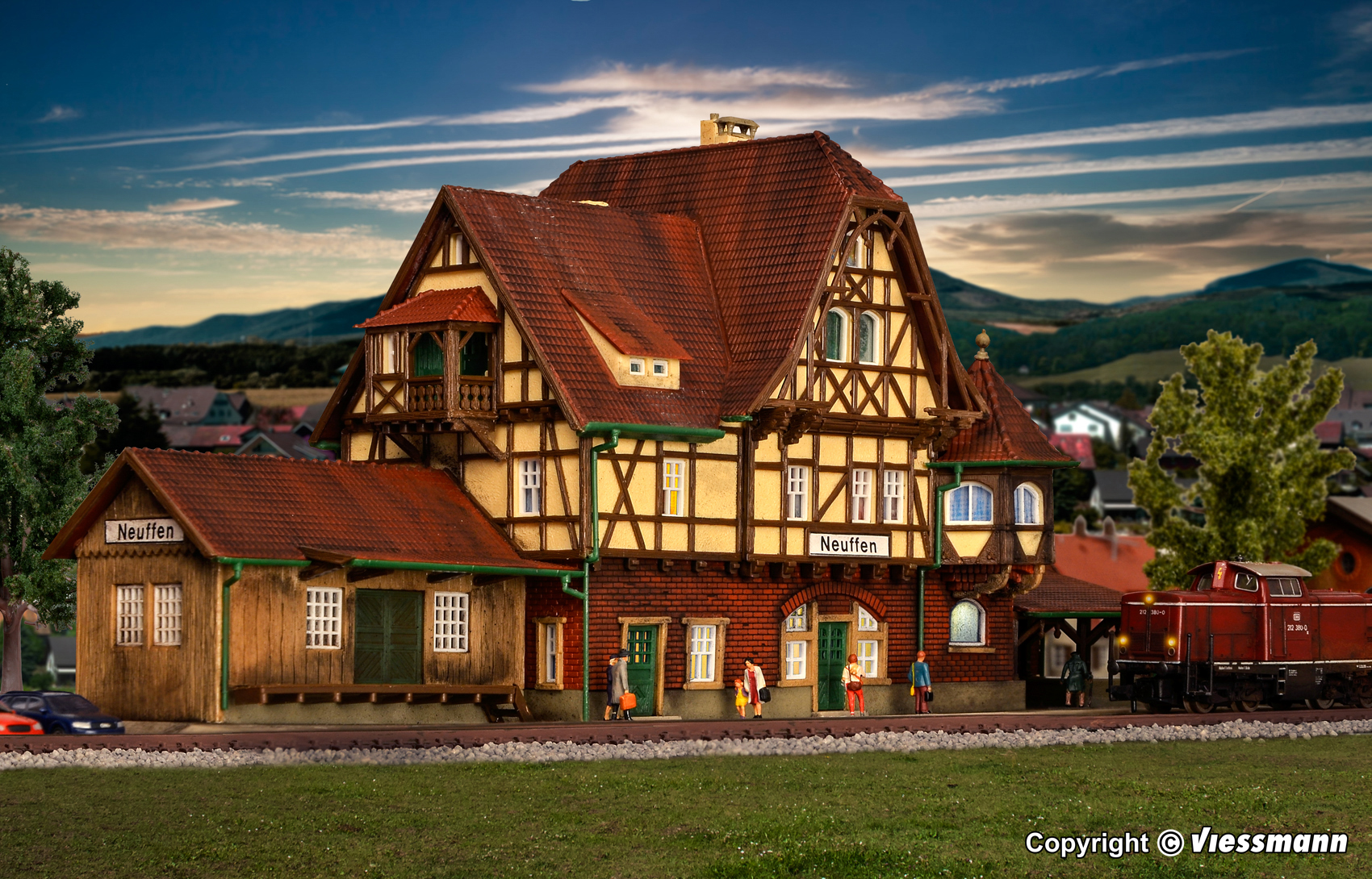 Der Bahnhof Neuffen ist ein typischer Landbahnhof. Er ist Endstation der Nebenlinie Nürtingen-Neuffen und steht am Fuß der Burgruine Hohen-Neuffen auf der Schwäbischen Alb. Das kurz vor der Wende zum 20. Jahrhundert errichtete, stilechte Bahnhofsgebäude wurde von Vollmer mit allen Details nachgebaut. Maße: L 26,5 x B 10 x H 11,5 cm.