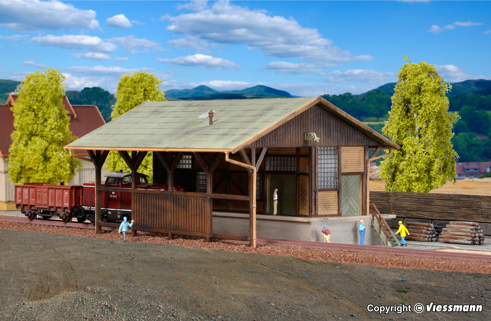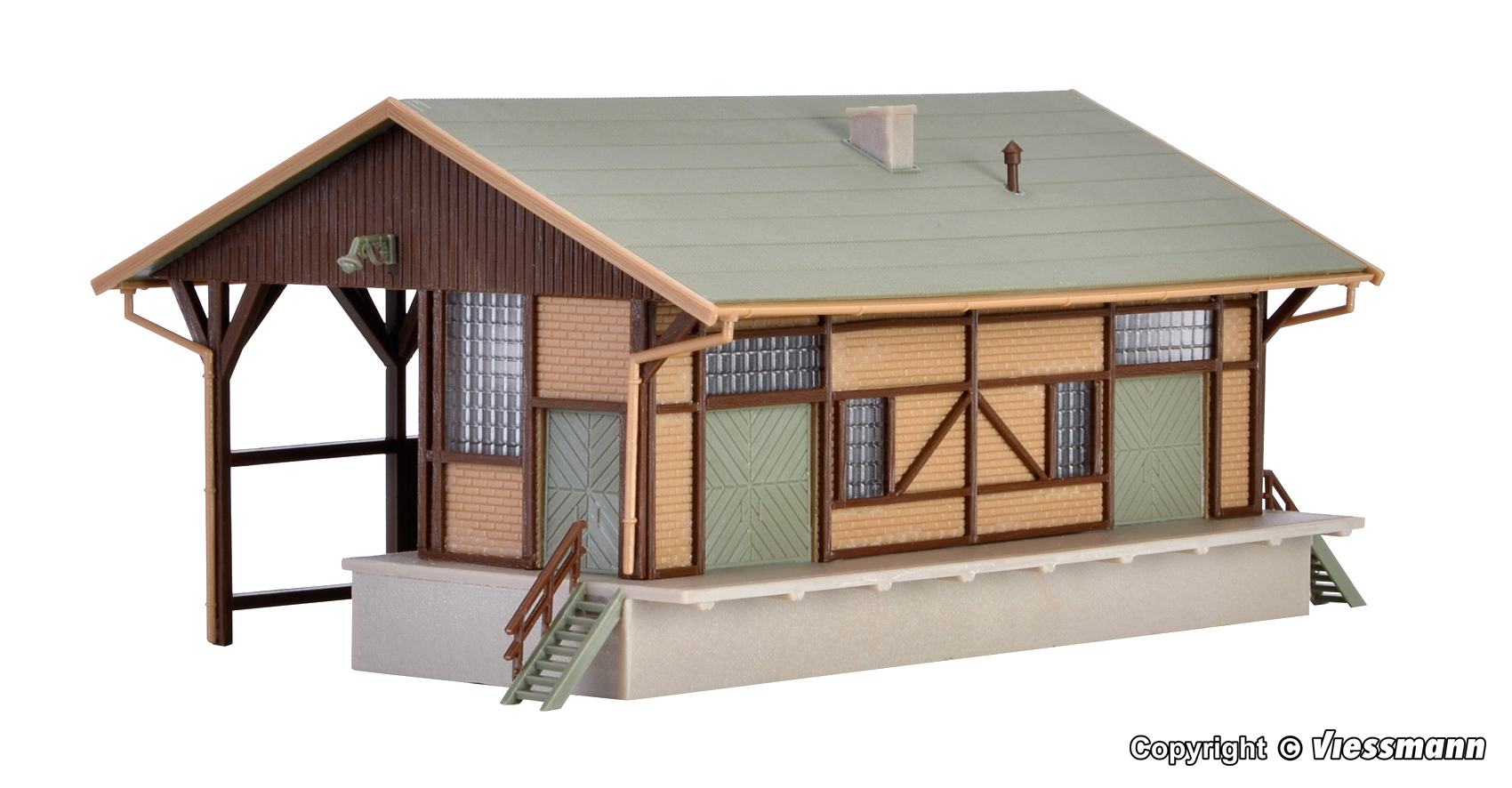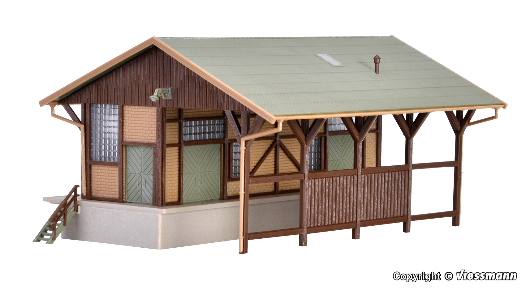Bei diesem Schuppen ist der Gleisanschluss überdacht. So können die Güter im Trockenen ein- und ausgeladen werden. Die Holz-Backsteinstruktur gibt dem Gebäude ein interessantes Äußeres. Durch Glasbausteine fällt Licht in den Innenraum. Durchfahrtshöhe: 4,5 cm. Durchfahrtsbreite: 2,8 cm. Maße: L 16,5 x B 10 x H 6,8 cm.