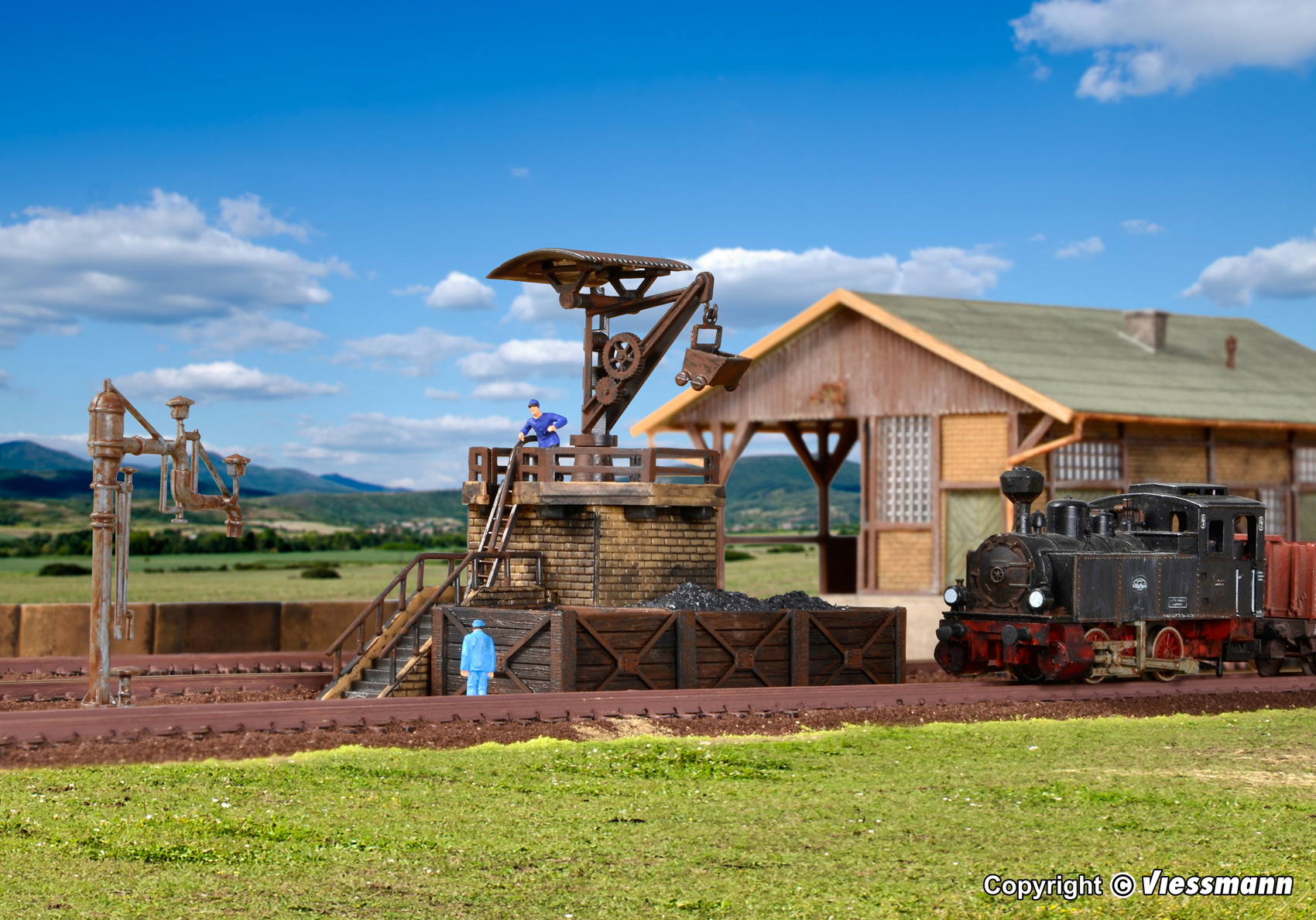 Hier dreht sich alles um die Dampflok. An dieser Anlage wird sie mit den nötigen Kohlen beladen. Maße: L 7,5 x B 4,5 x H 6 cm.