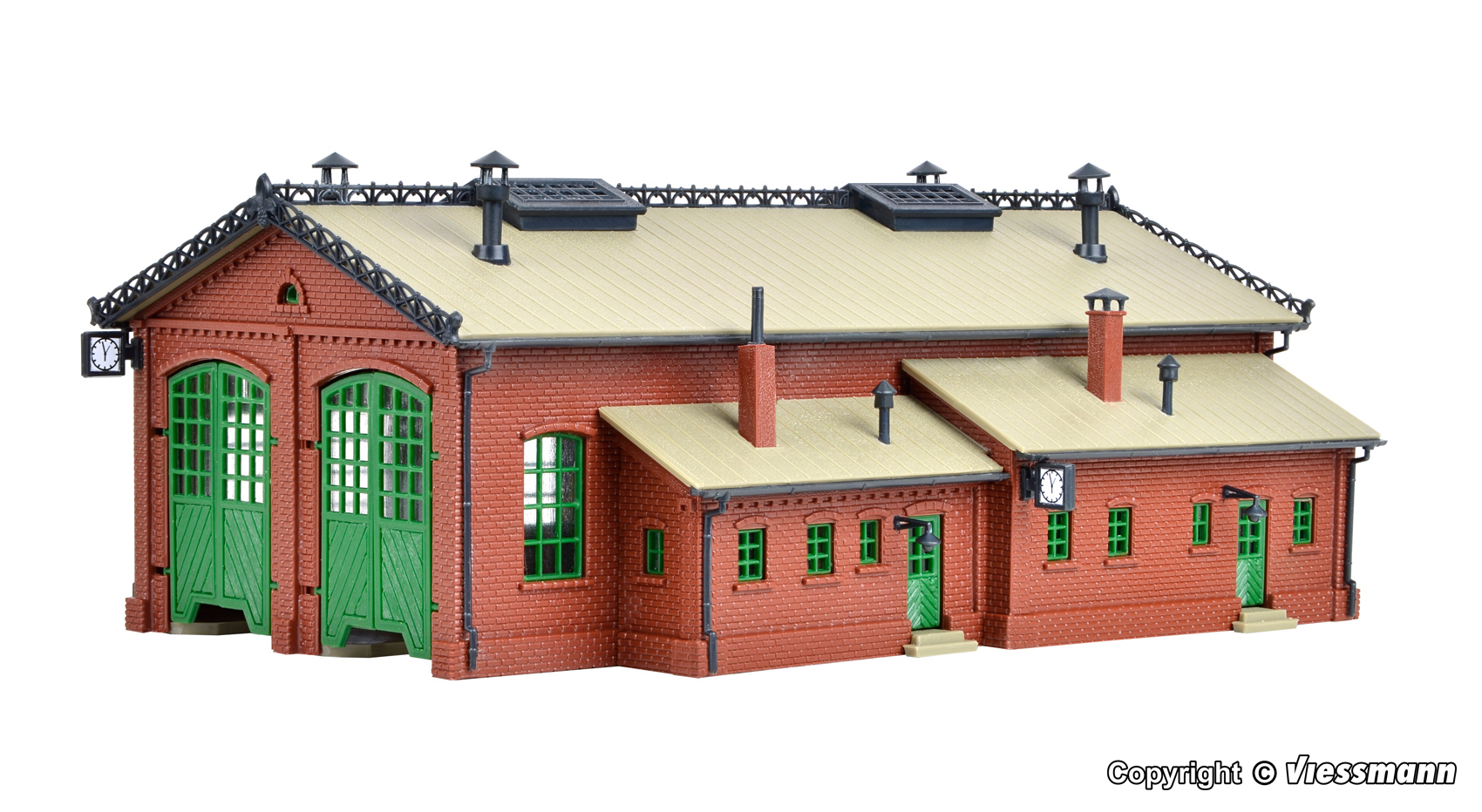 Ein Lokschuppen darf auf der Modellbahnanlage nicht fehlen. Was wäre schließlich eine vorbildgerechte Modellanlage ohne diese charakteristischen Bauwerke. Dieser Lokschuppen ist für Dampf- und Dieselloks geeignet. Gleismittenabstand: 4 cm. Maße: L 19,5 x B 12 x H 7,6 cm.
