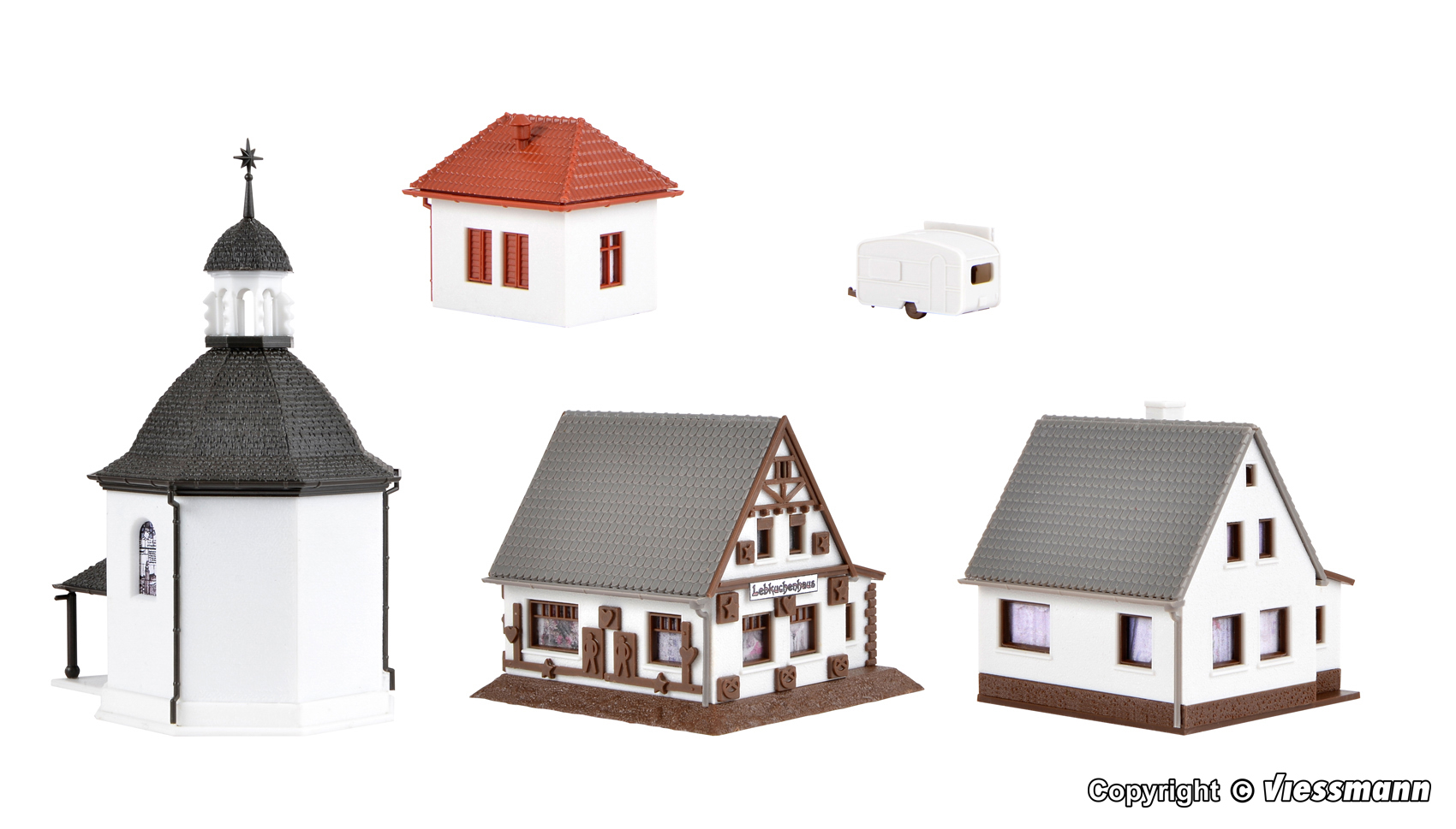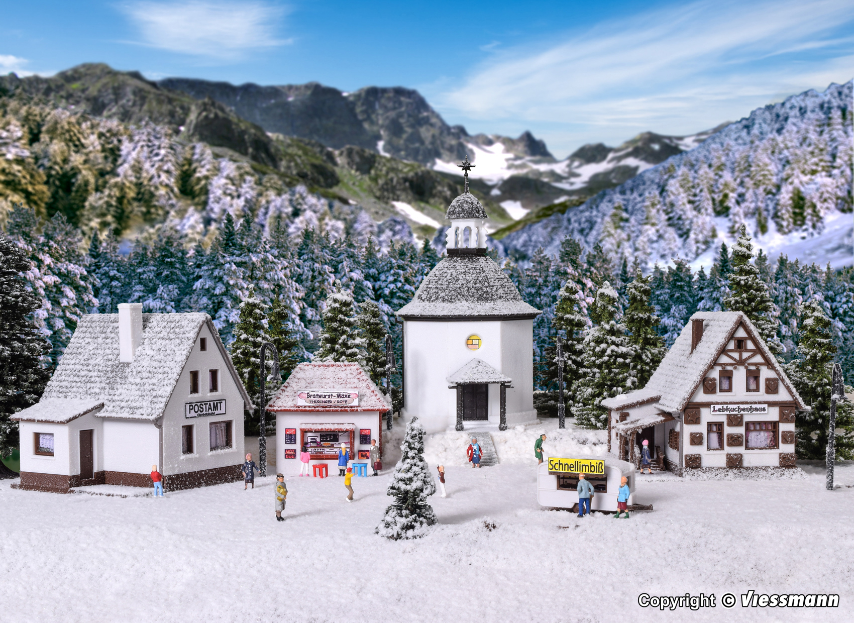 Das Weihnachtsdorf passt hervorragend auf Modellbahnanlagen mit Winterstimmung. Oder gestalten Sie mit Ihren Kindern und Enkeln im Rahmen vorweihnachtlicher Bastelabende ein festliches Diorama. Die Häuser sind auch als Dekoration auf dem Fenster- oder Kaminsims eine Augenweide. Das Dorf besteht aus der Stille-Nacht-Gedächtniskapelle, einem Postamt Christkindl, Glühweinstand, Lebkuchenhaus und Bratwurst-Maxe. Der Kapelle, dem Postamt und dem Lebkuchenhaus liegt jeweils eine Sockelbirne für die Innenbeleuchtung bei. Außerdem ein Tütchen Kunstschnee zur Gestaltung der winterlichen Atmosphäre. Maße: Kapelle L 5,5 x B 7,5 x H 10,3 cm, Postamt L 5,3 x B 5,6 x H 5,6 cm, Lebkuchenhaus L 6 x B 5,9 x H 5,1 cm, Bratwurst-Maxe L 4,1 x B 4,1 x H 3,8 cm, Glühweinstand L 3,2 x B 1,7 x H 1,8 cm.