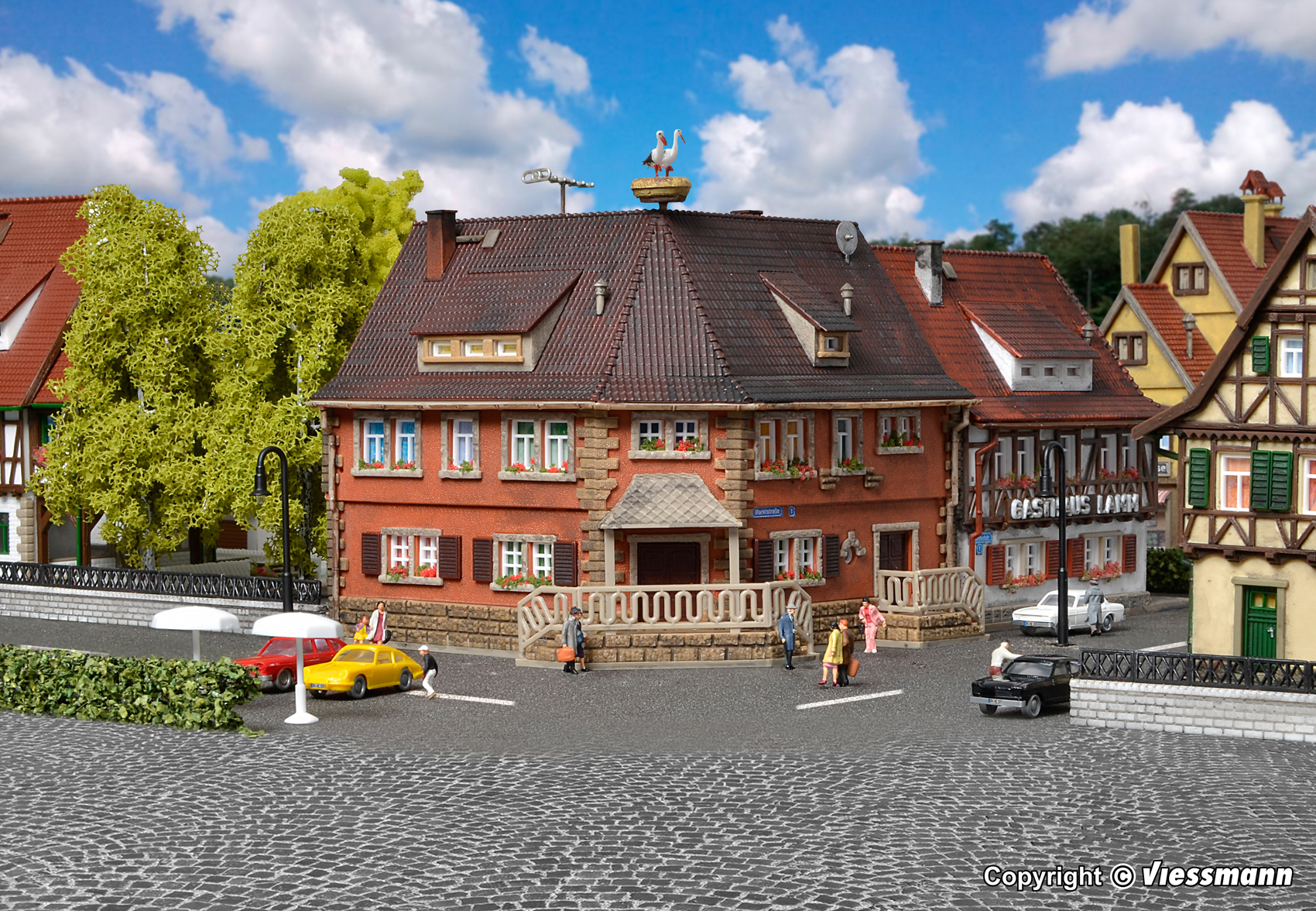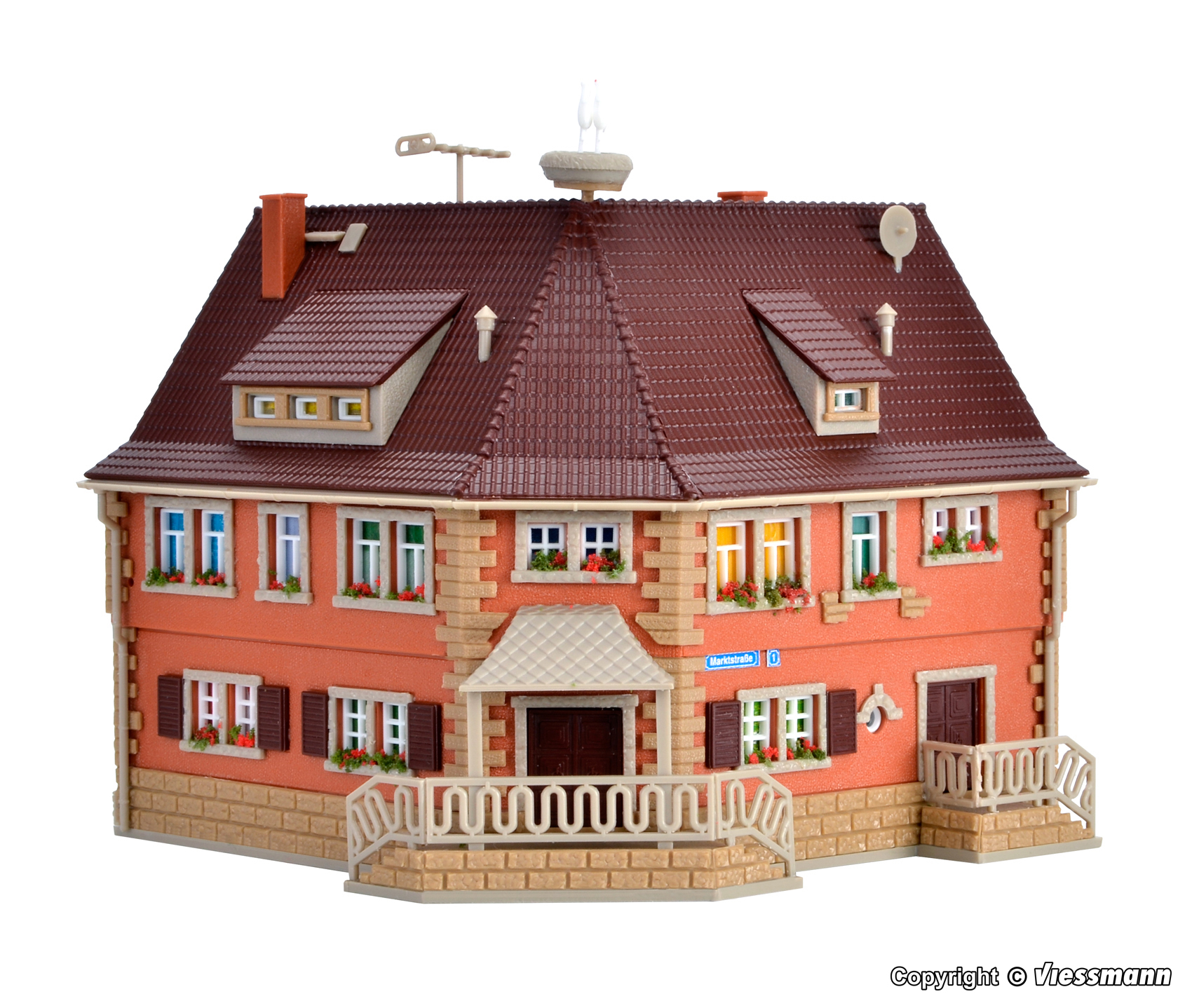 Mit den Bausätzen der Vollmer Marktstraße 2 ? 6 können Sie einen kompletten Straßenzug mit Wohn-, Geschäfts- und Fachwerkhäusern gestalten. Bereits mit 3 Bausätzen schaffen Sie sich eine preiswerte und abwechslungsreiche Häuserfront. An diesem Eckhaus fällt besonders der überdachte Treppenaufgang mit dem filigranen Geländer ins Auge. Ein besonderes Detail ist das Storchennest auf dem Dach. Maße: L 10,2 x B 10,2 x H 10,5 cm.