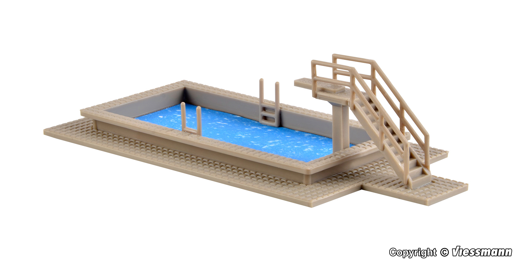 Dieses Schwimmbad mit Sprungturm ist die ideale Ergänzung zu Art. 47667 N Sport- und Wellnesshotel Europa oder es kann ganz separat eingebaut werden, z. B. als kleines Gemeindeschwimmbad oder Ähnliches. Maße: L 8,5 x B 4 x H 2,2 cm.