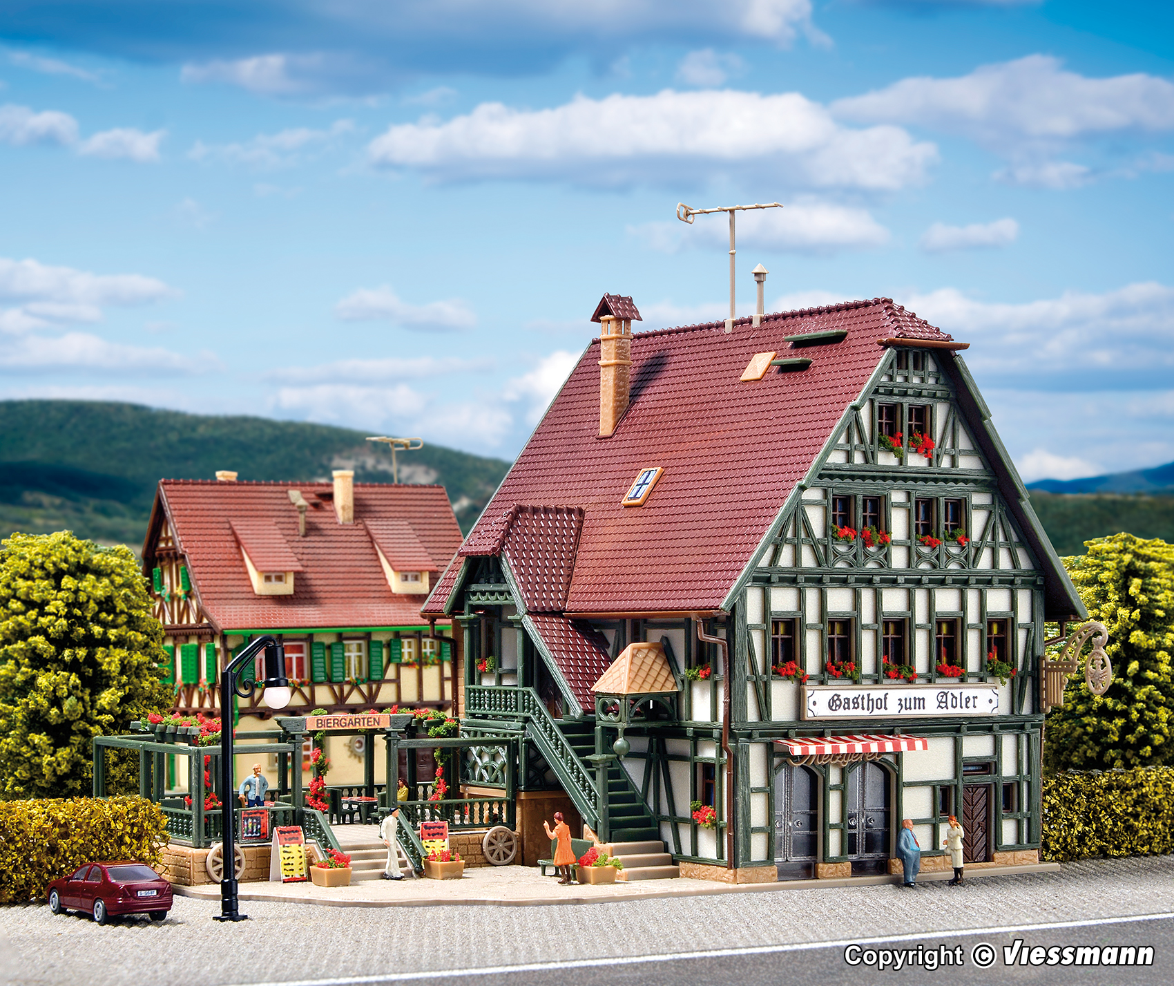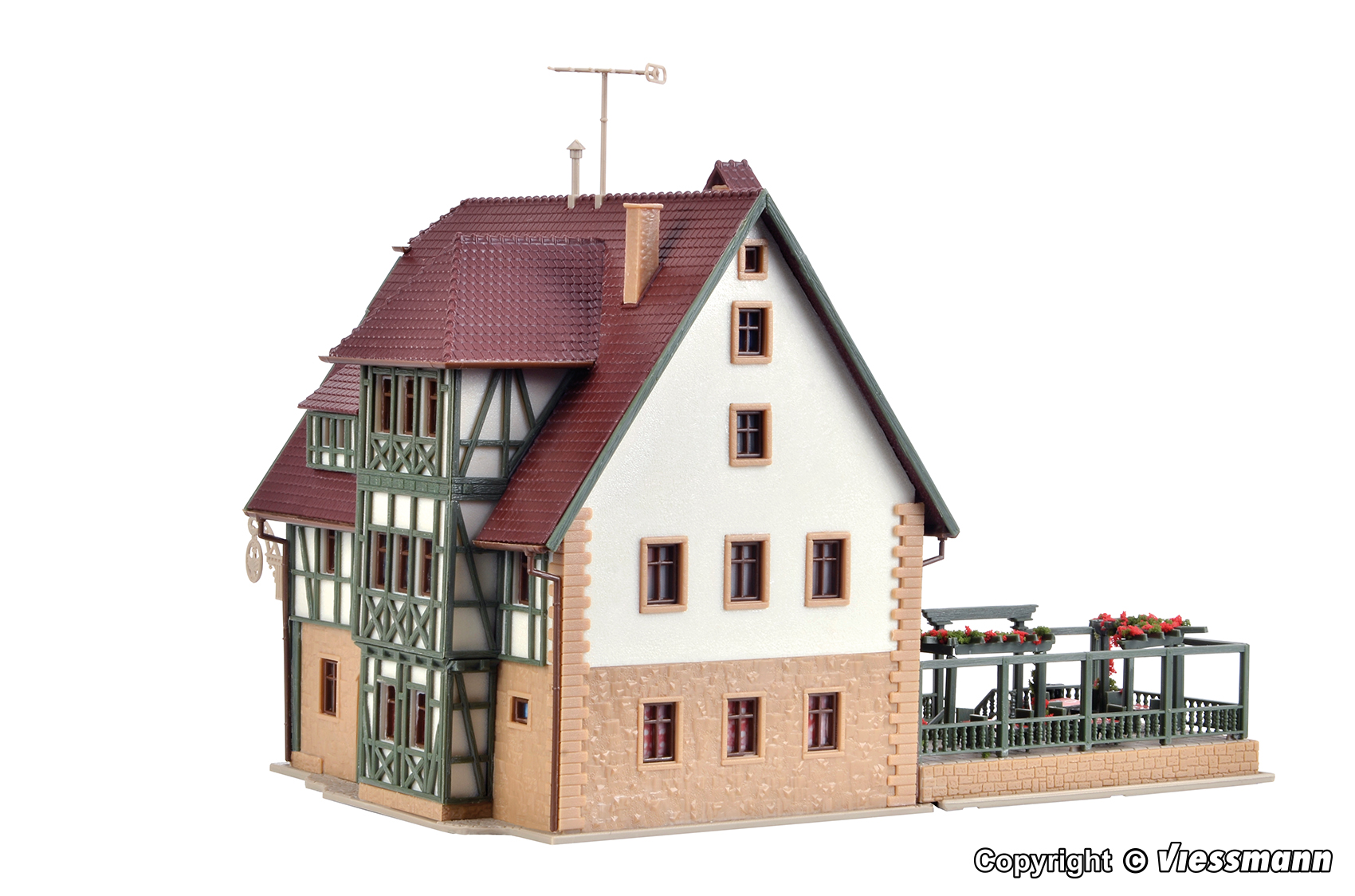 Dieser Bausatz ist mit umfangreichem Zubehör ausgestattet. Dem Bausatz liegen Tische und Bänke für den angeschlossenen Biergarten und eine Ladeneinrichtung für die Metzgerei bei. Maße: L 16 x B 10,6 x H 12,8 cm.