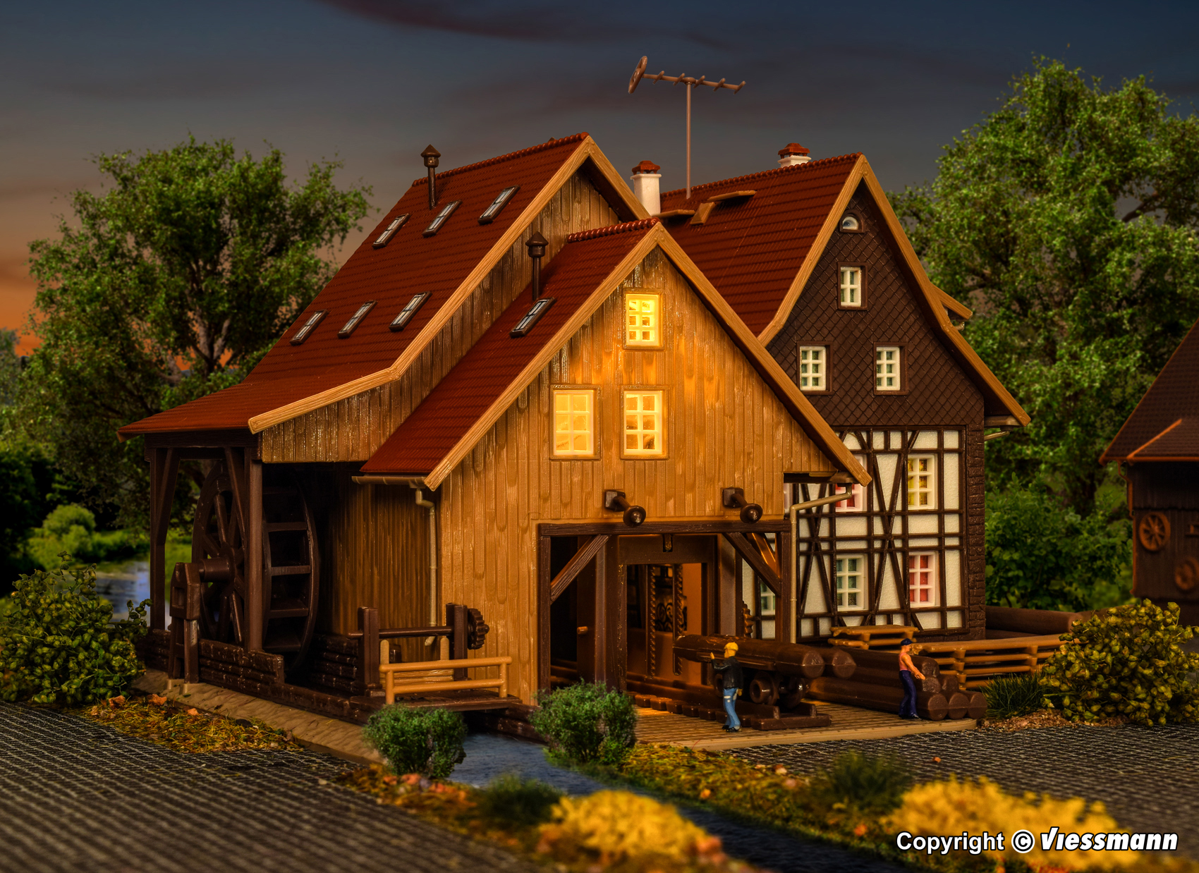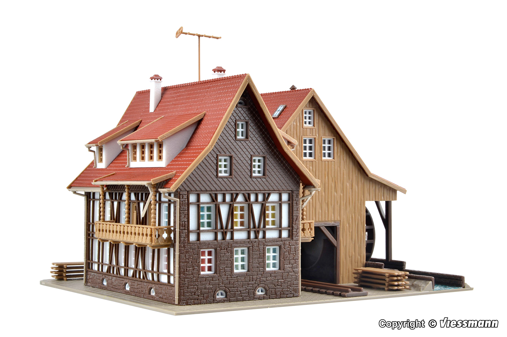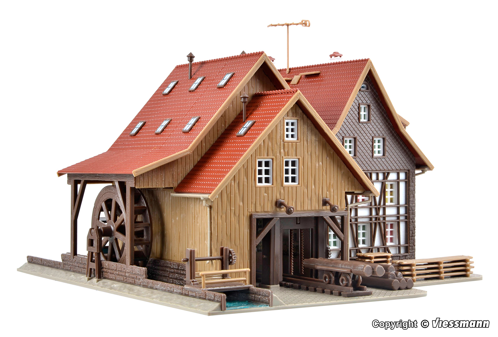 An der Rückseite dieses schmucken Fachwerkhauses ist ein Sägewerk angebaut. Umfangreiches Zubehör ermöglicht eine realistische Ausgestaltung. Das Mühlrad kann mit dem Motor Art. 44200 angetrieben werden (Zusatzausstattung). Maße: L 17 x B 15,5 x H 12 cm