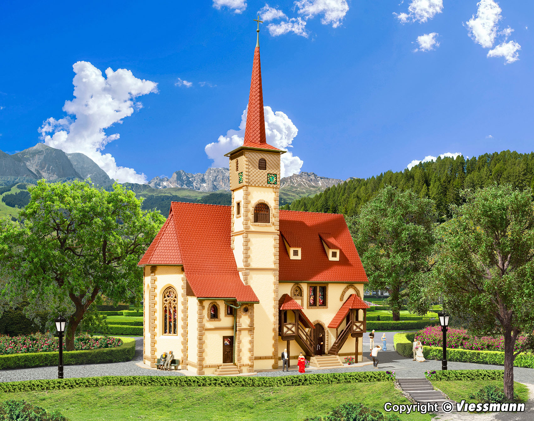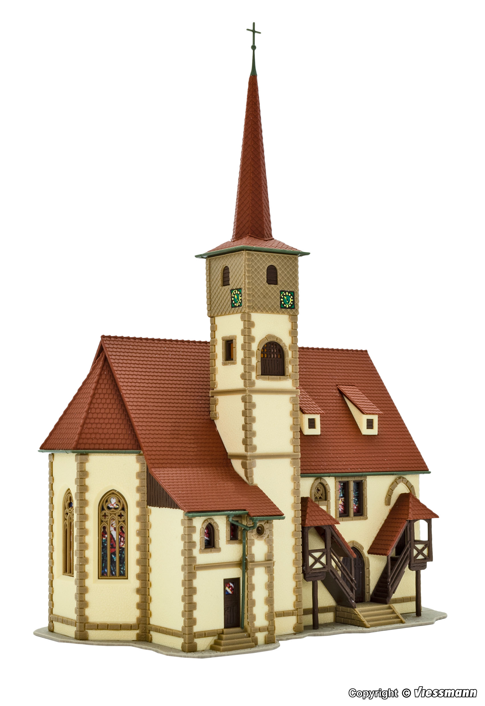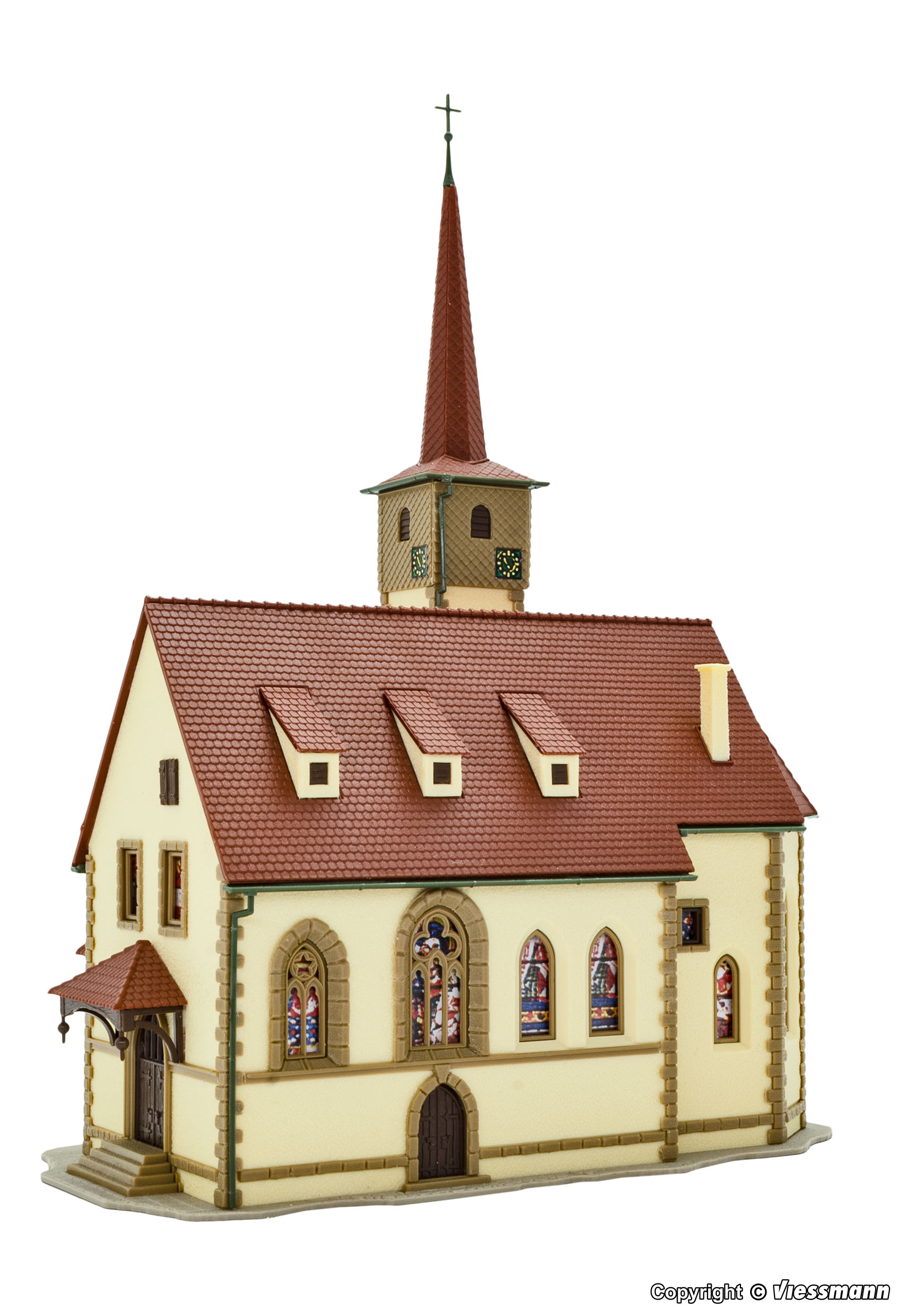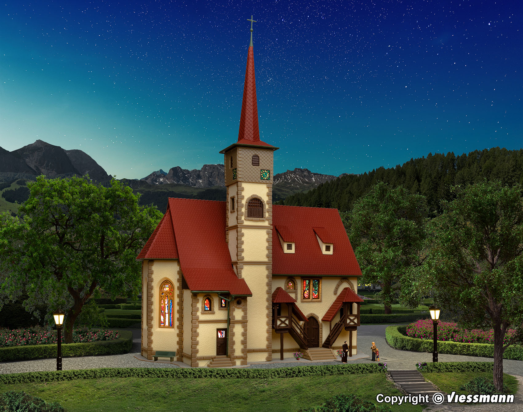 Das Vorbild dieser Dorfkirche steht in Ditzingen bei Stuttgart. Sie wurde maßstabsgetreu nachgebildet und liebevoll gestaltet. Mit ihr holen Sie sich einen Hauch Idylle und ländliches Flair auf Ihre Anlage. Maße: L 16 x B 9,8 x H 21,5 cm.