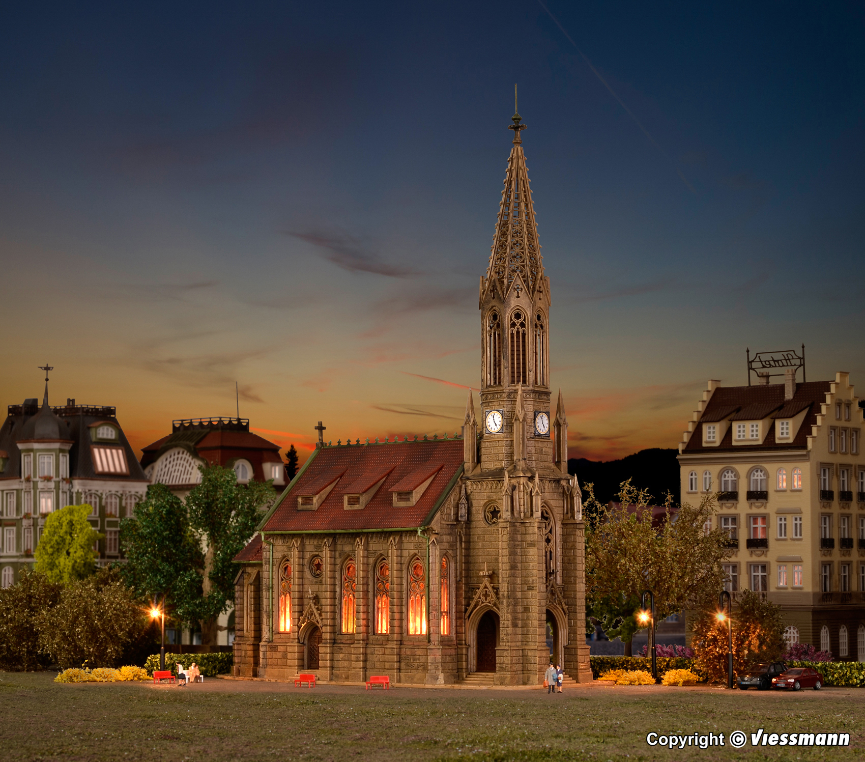 Das Vorbild dieses Vollmer-Modells kann auf eine bewegte Vergangenheit zurückblicken. Bereits im Jahr 1235 soll auf der Anhöhe am westlichen Neckarufer eine Kirche gestanden haben. Ihr folgte 1470 zunächst ein Neubau im gotischen Stil, der Mitte des 19. Jahrhunderts durch eine neugotische Kirche ersetzt wurde. Nach der fast völligen Zerstörung im 2. Weltkrieg wurde die Kirche schließlich 1954/55 wieder aufgebaut, so dass sich ihr Äußeres heute kaum von der neugotischen Vorgängerin unterscheidet. Passend zur Kirche gibt es die Freitreppe Art. 47759. Maße: L 20 x B 10 x H 26,5 cm.