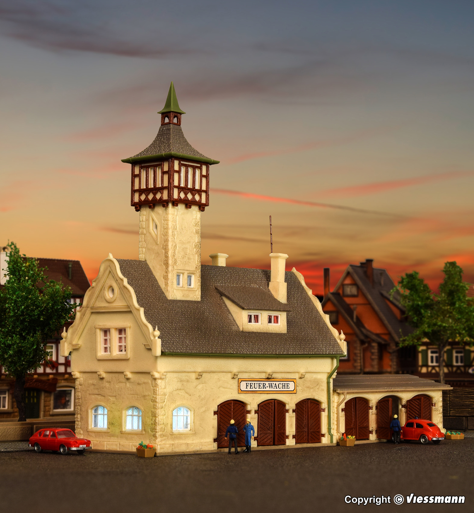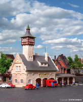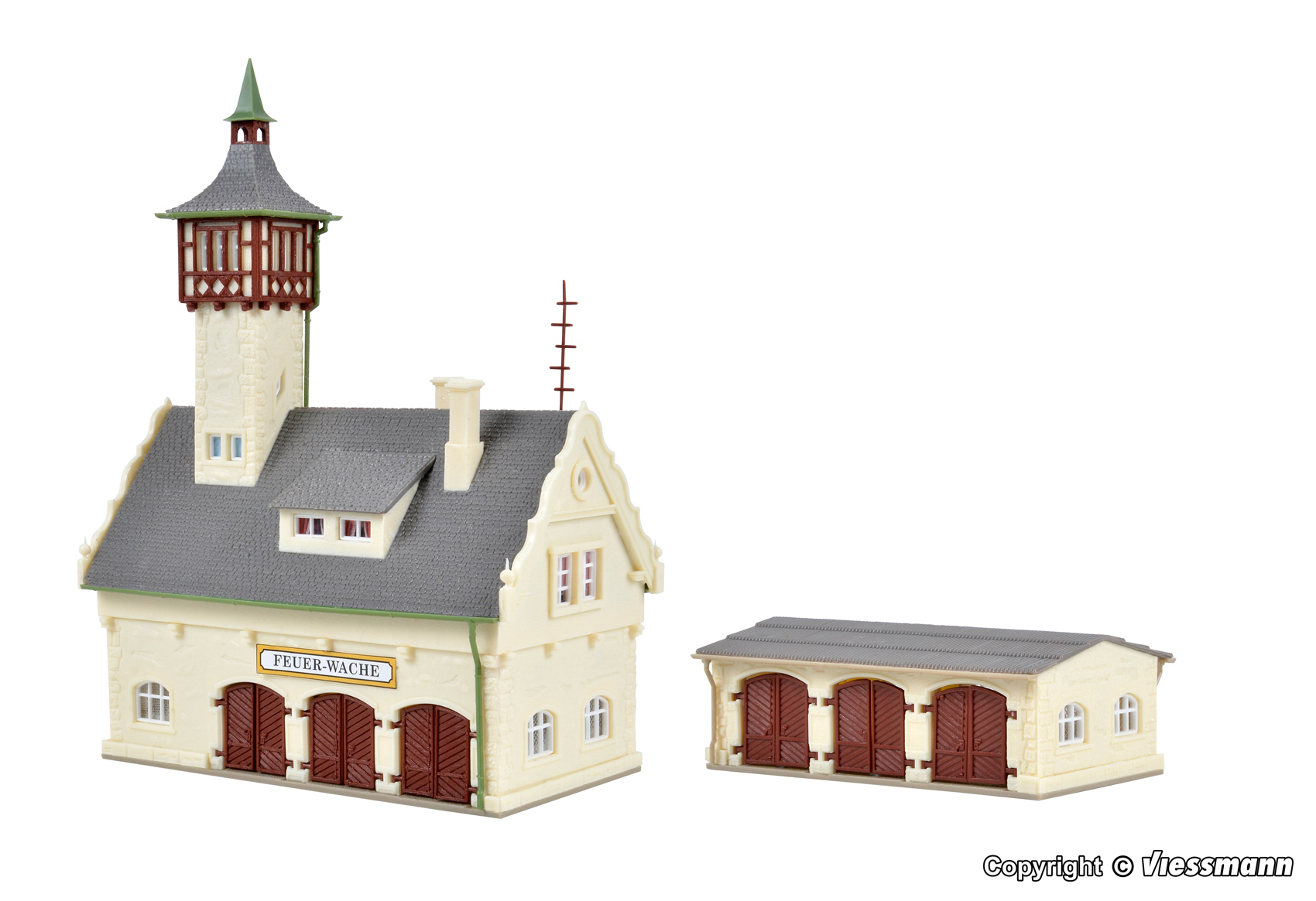 In diesem Feuerwehrhaus finden 6 Einsatzfahrzeuge Platz. Der auffällig gestaltete Schlauchturm prägt dieses schmucke Gebäude. Maße Dorffeuerwehr: L 10,5 x B 5,7 x H 14 cm. Garage: L 7,5 x B 5 x H 2,8 cm.