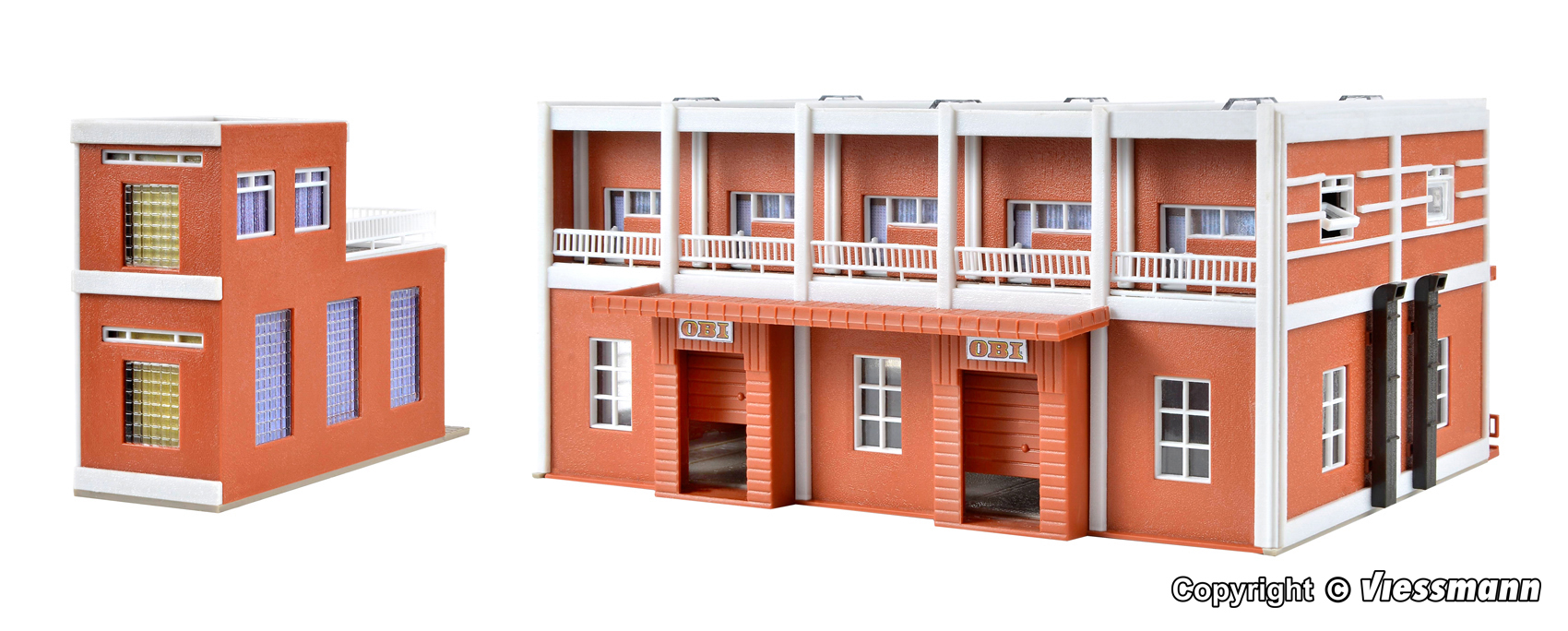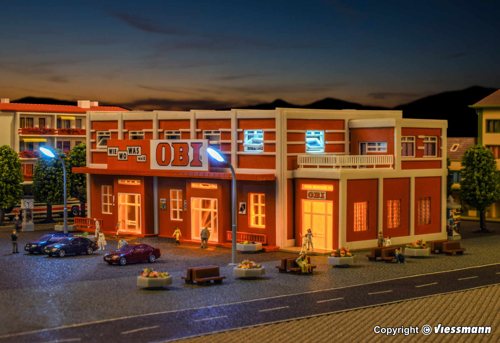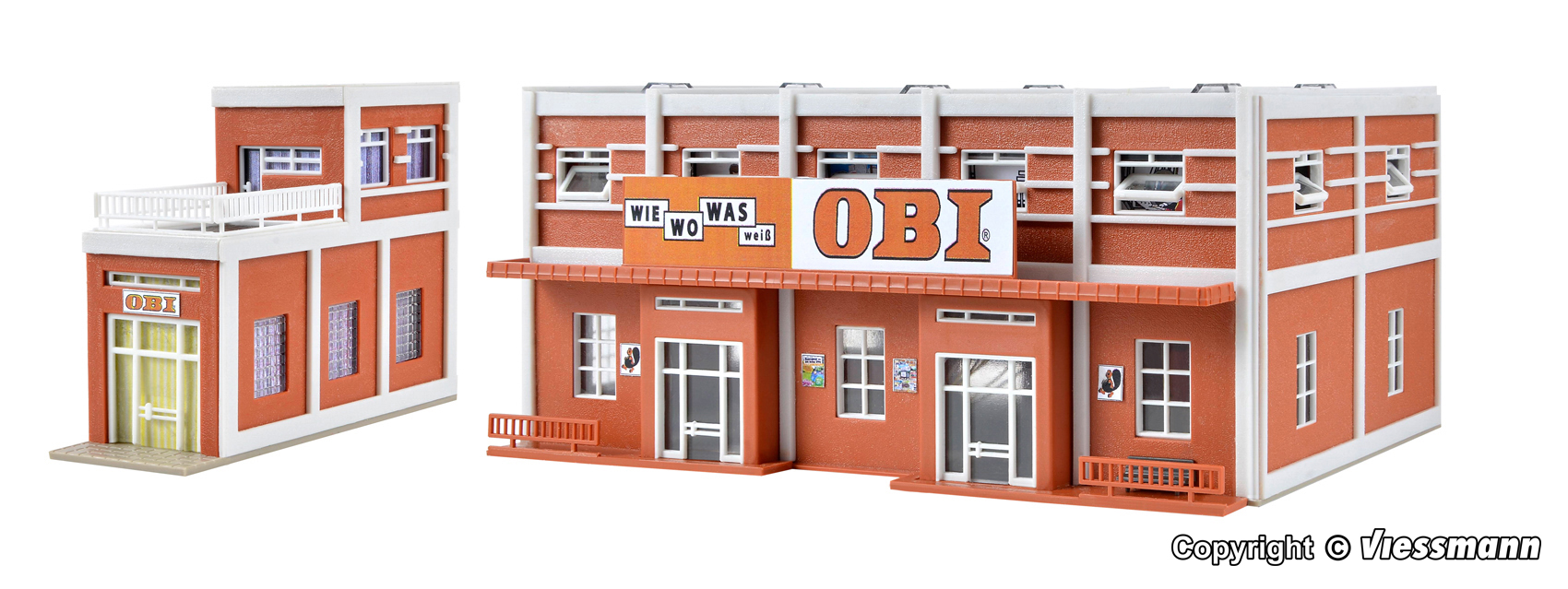 Der Trend zum Selbermachen und -bauen hält an. Alles was man dazu benötigt, findet man im Baumarkt. Unser OBI-Markt strahlt in den hausüblichen Farben und es herrscht reges Treiben am Samstagvormittag. Wie, wo, was, weiß eben OBI! Der Bausatz besteht aus zwei Gebäuden und ist mit vielen liebevollen Details ausgestattet. Wir bedanken uns für die freundliche Unterstützung von OBI. Maße: L 20,5 x B 13 x H 7,5 cm, L 3 x B 10,3 x H 7 cm.
