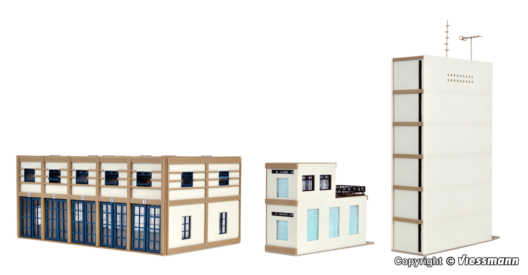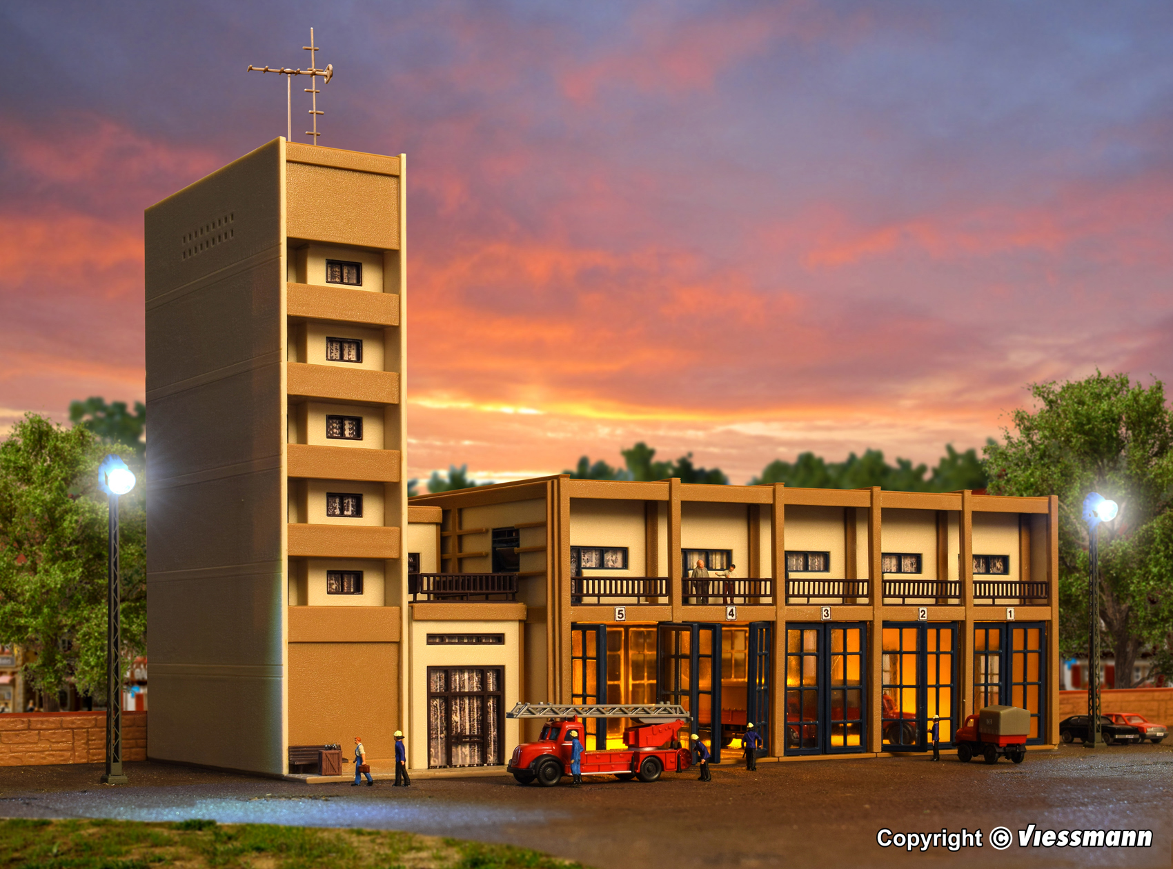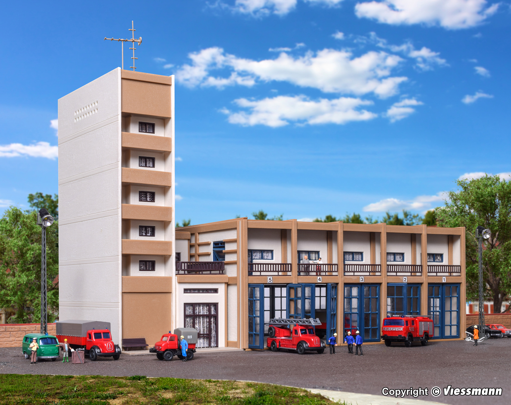 Dieses Feuerwehrgebäude der Epochen III und IV bietet in der Fahrzeughalle mit dem für diese Zeit typischen Flachdach Platz für 5 Einsatzfahrzeuge. Im schmalen Anbau sind Seminar- und Aufenthaltsräume